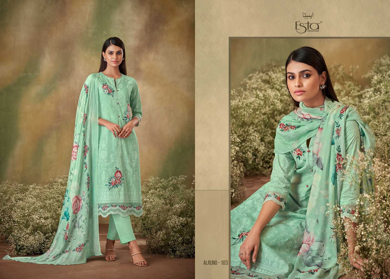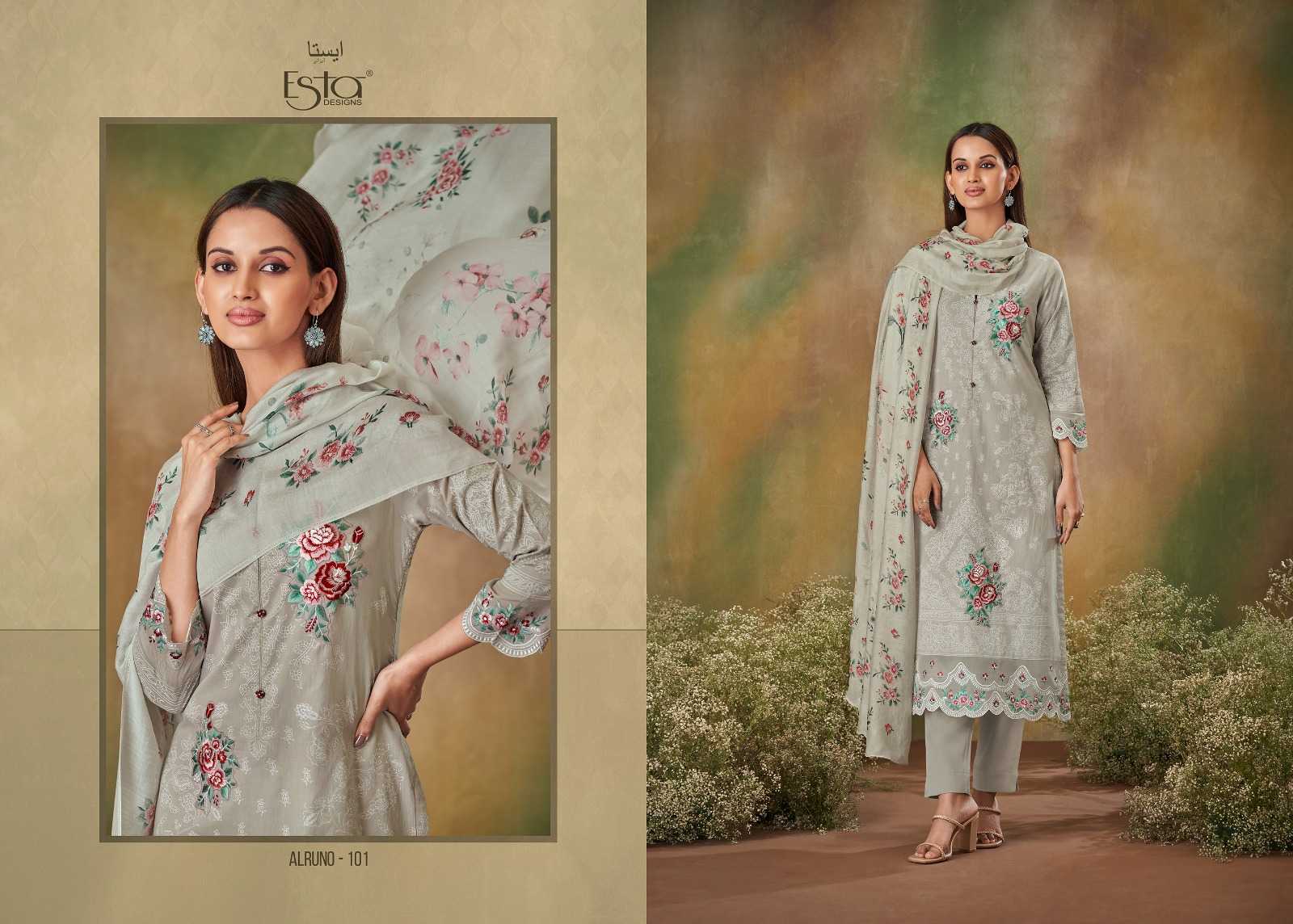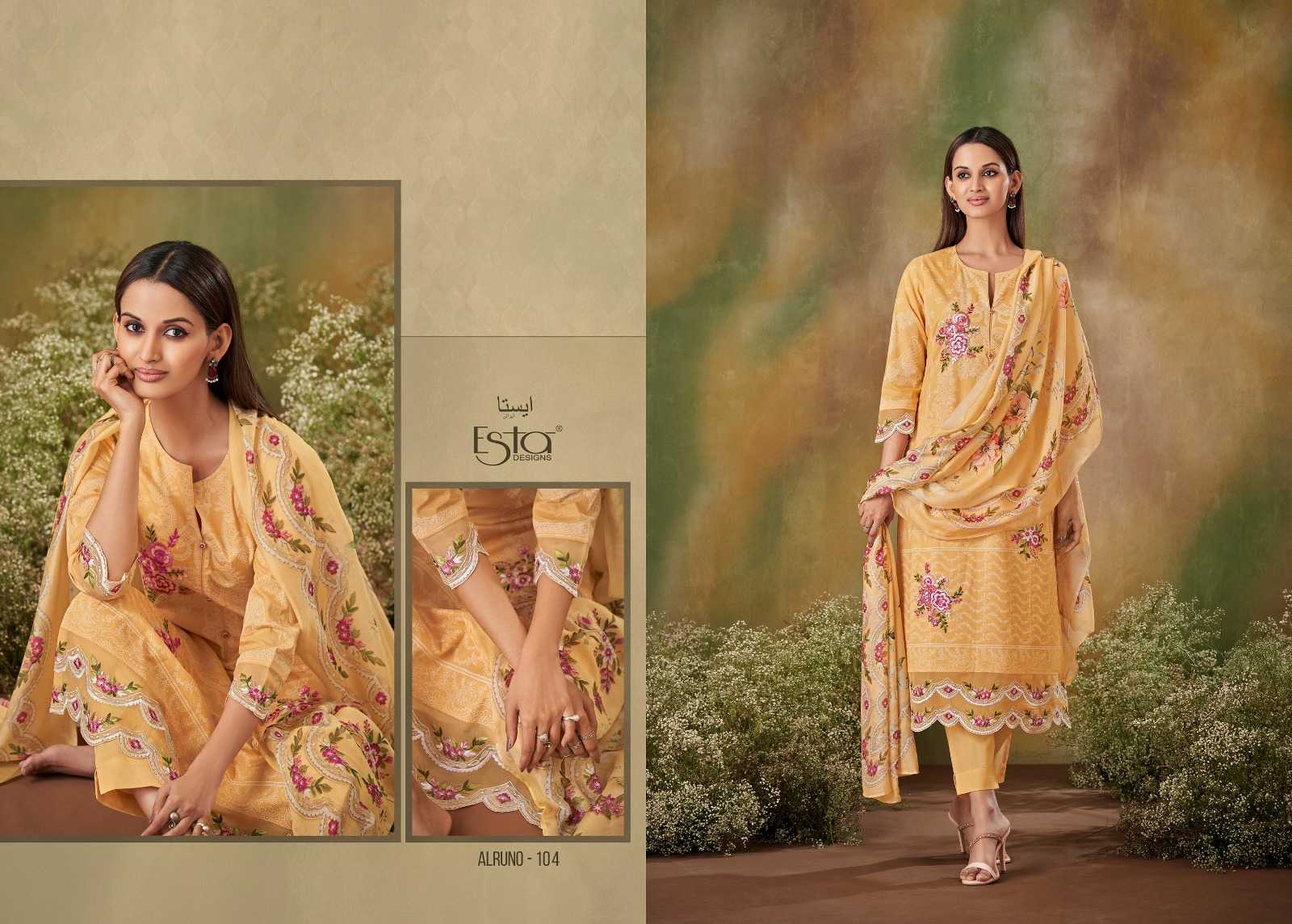 esta designs alruno designer cotton printed embroidery work unstitch ladies suit