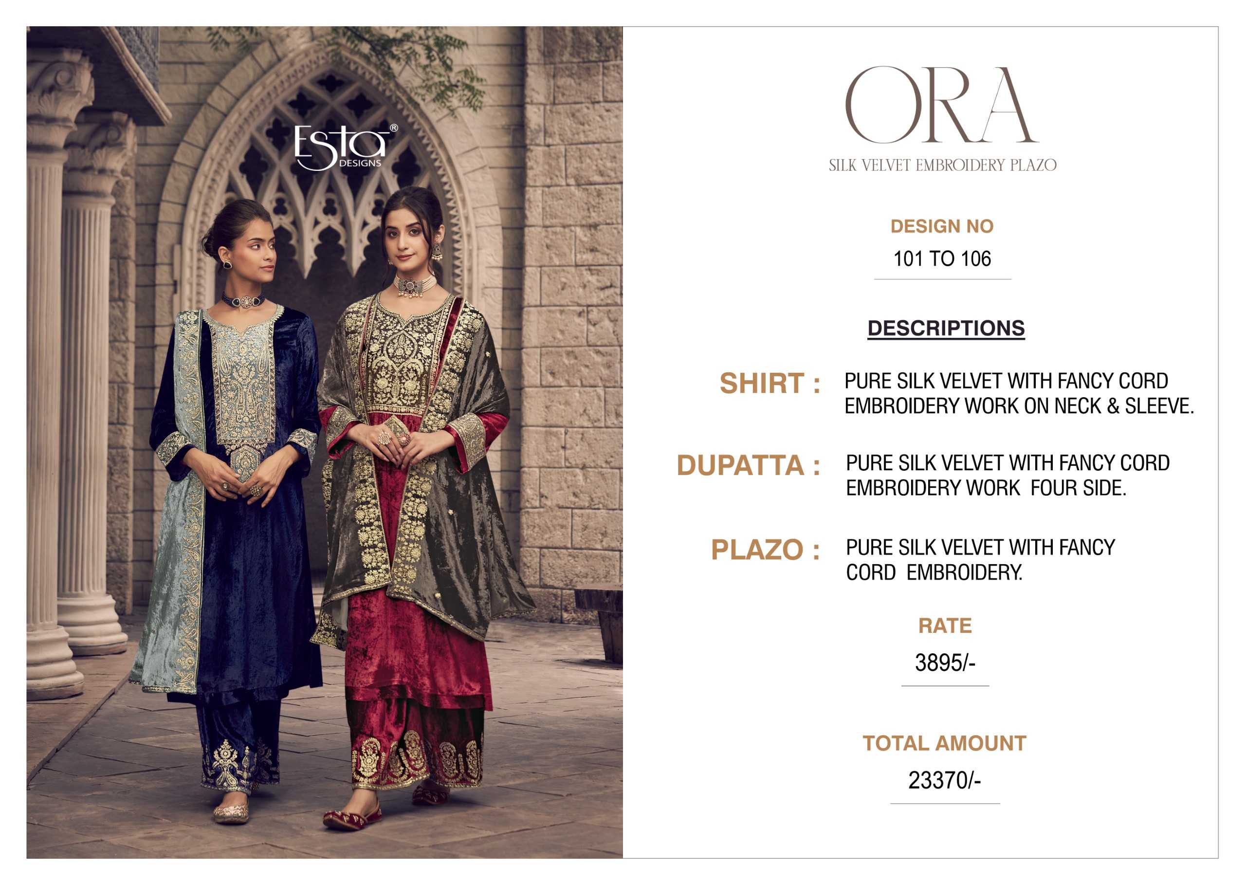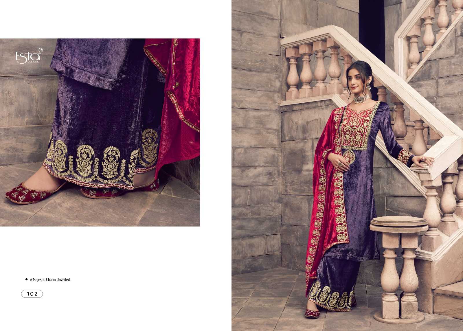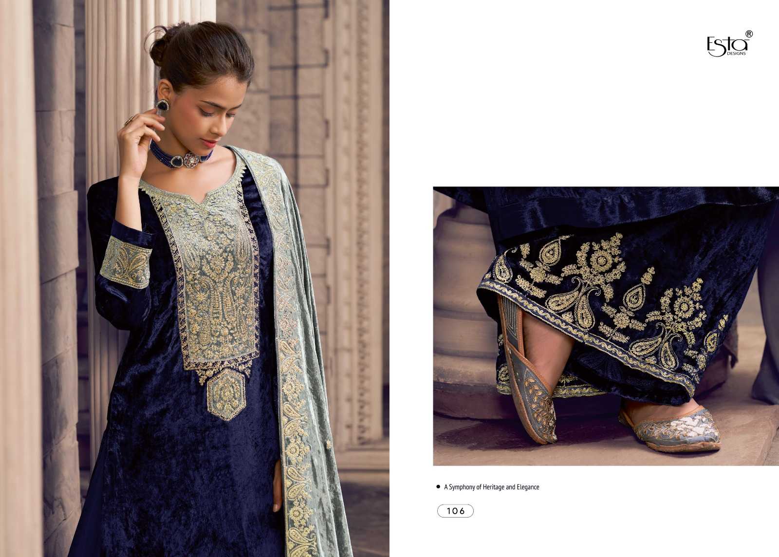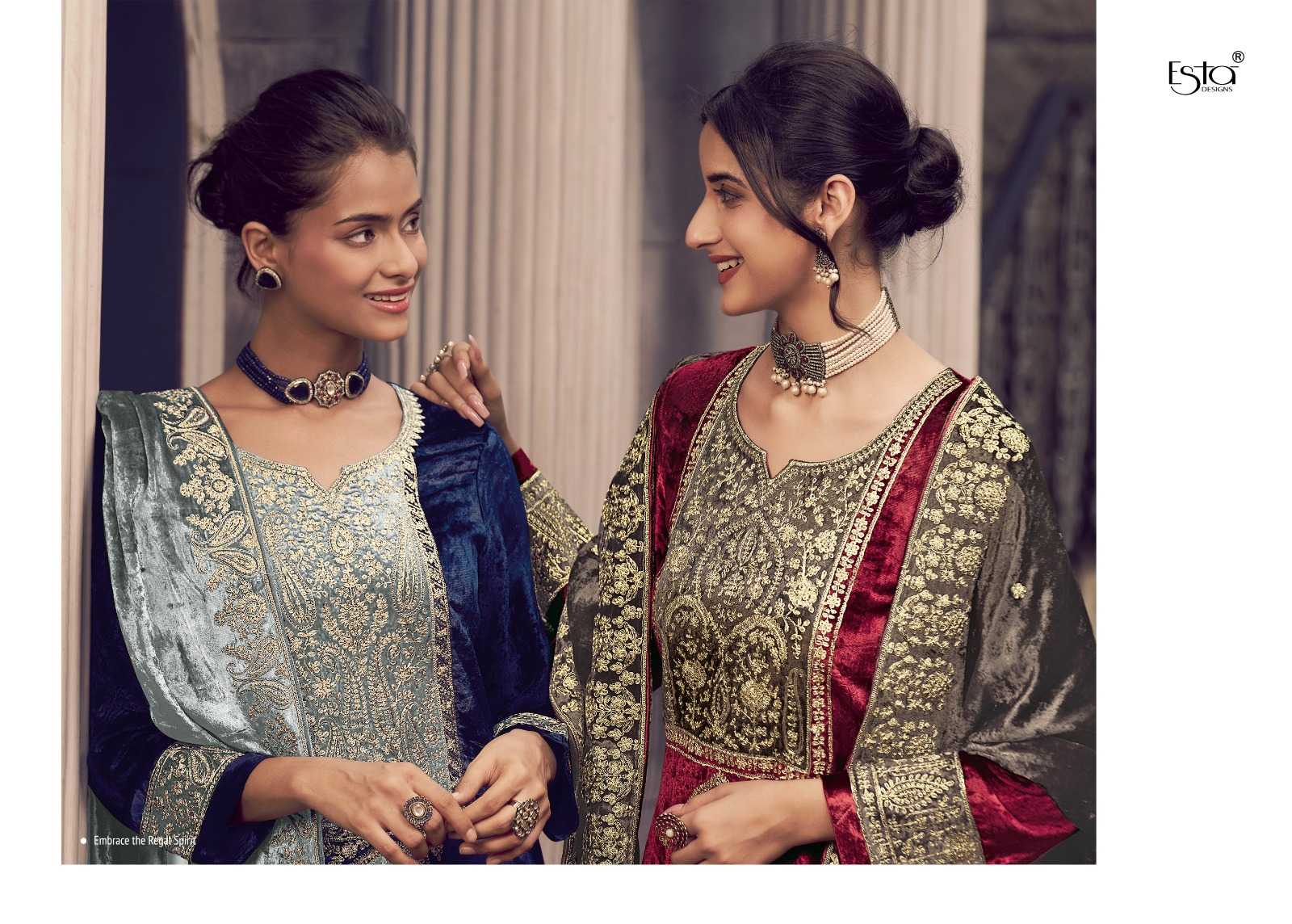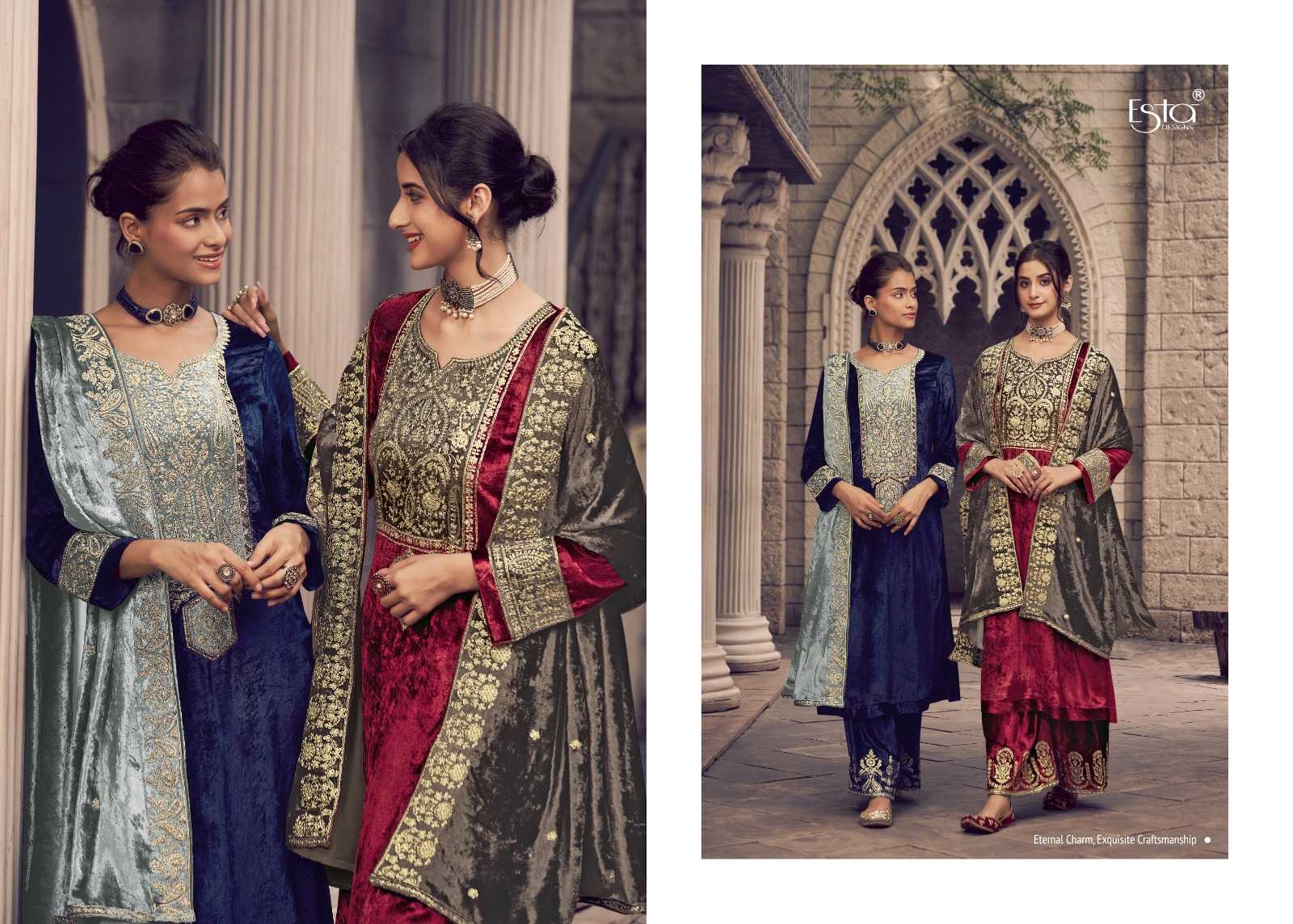 ESTA DESIGNS DESCRIPTIONS SHIRT: PURE SILK VELVET WITH FANCY CORD DUPATTA: PURE SILK VELVET WITH FANCY CORD PLAZO: PURE SILK VELVET WITH FANCY RATE |