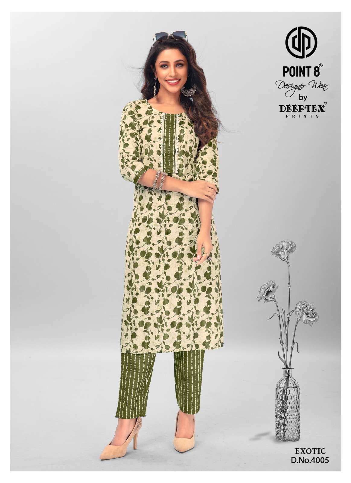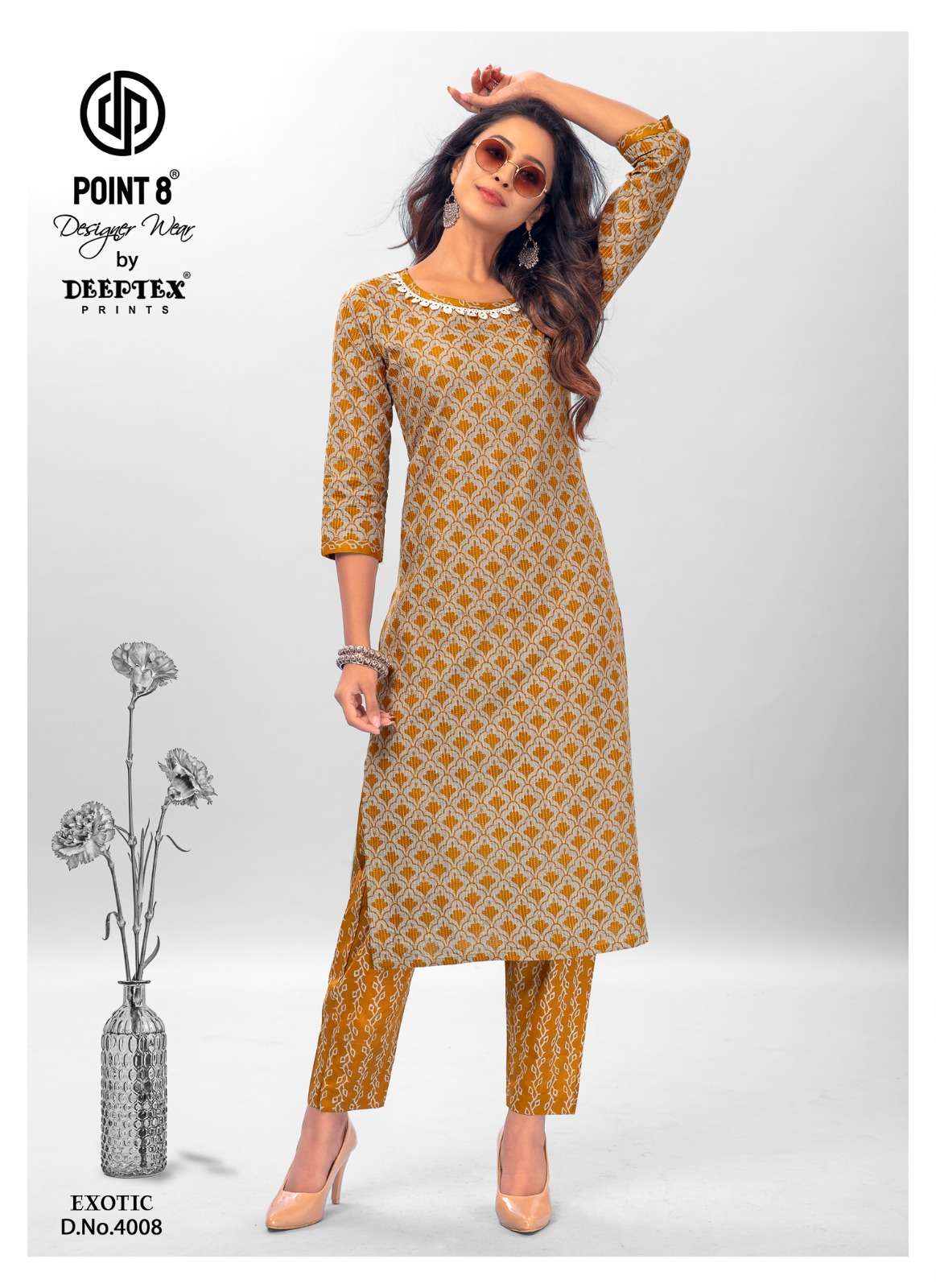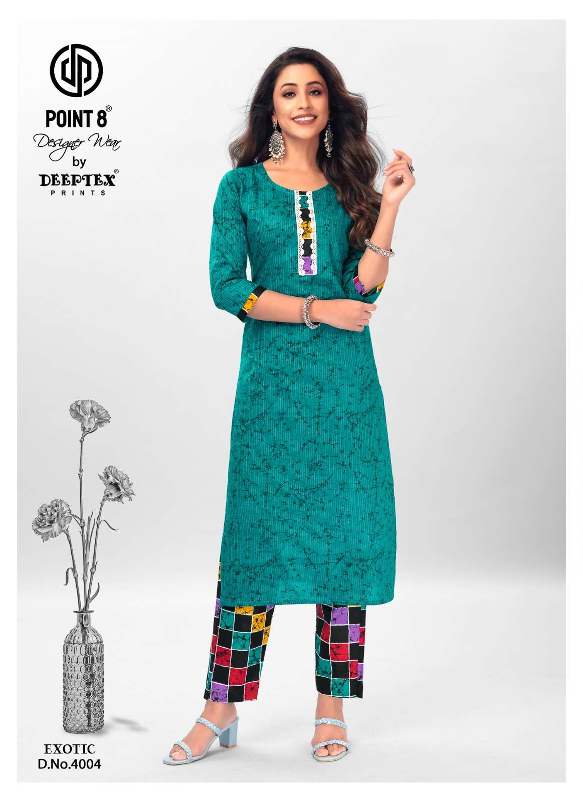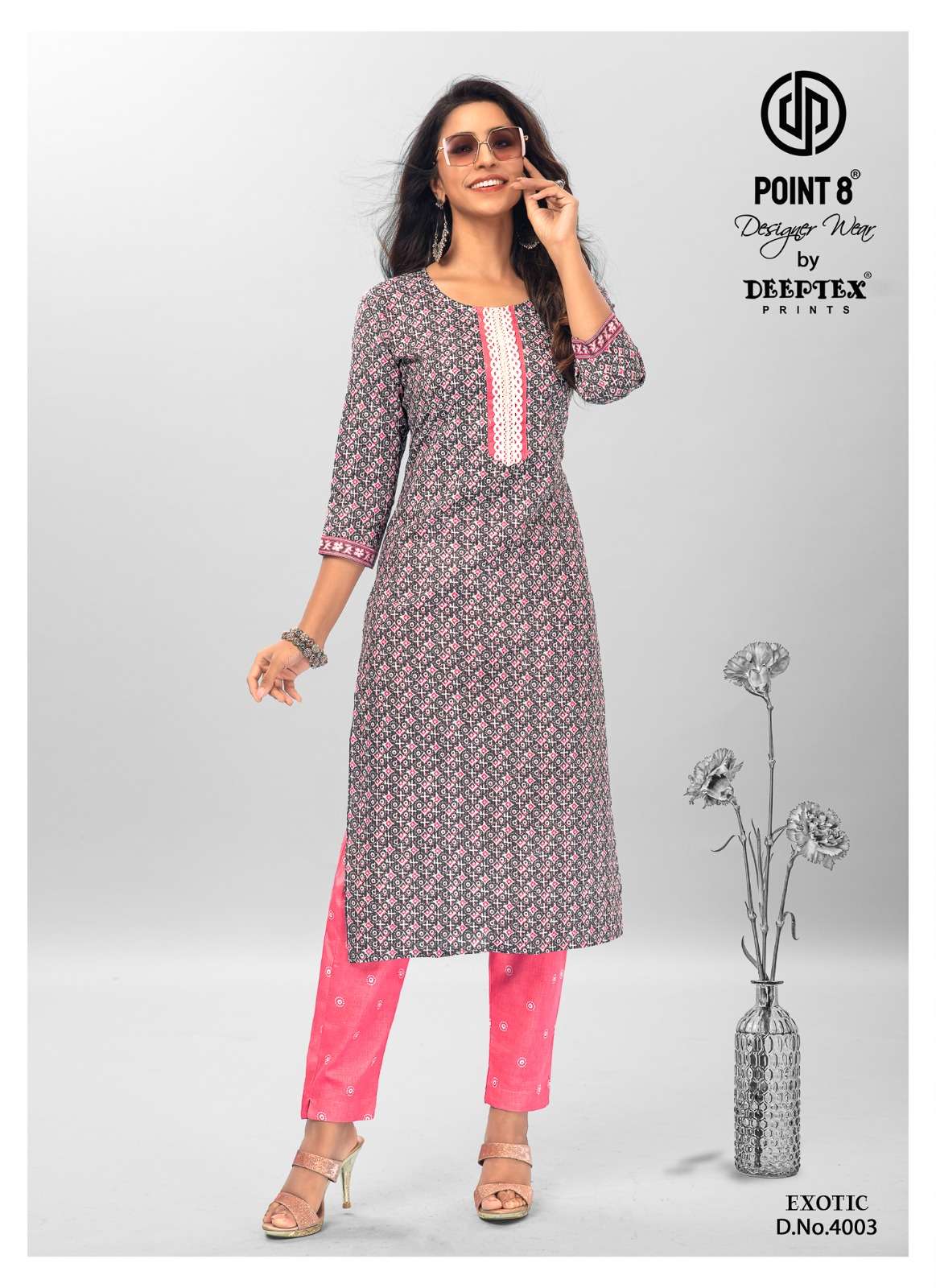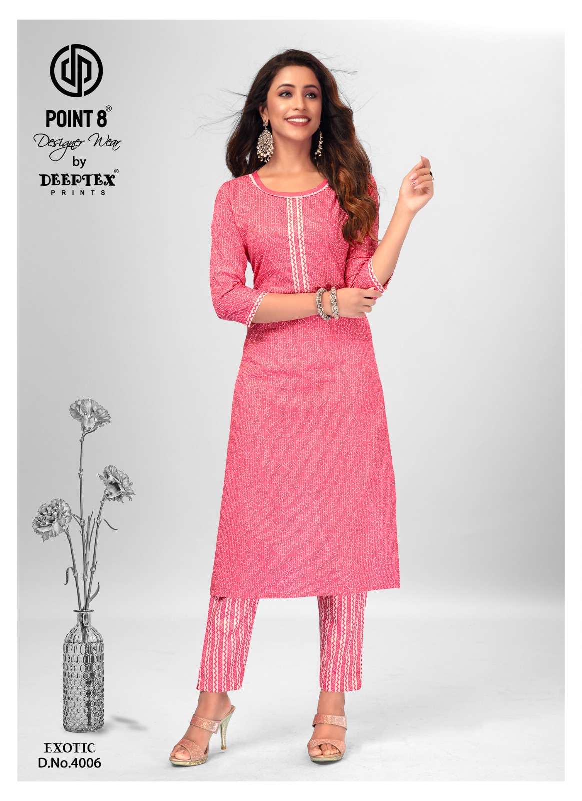 exotic vol 4 by point 8 deeptex print casual wear fancy cotton kurti and pant