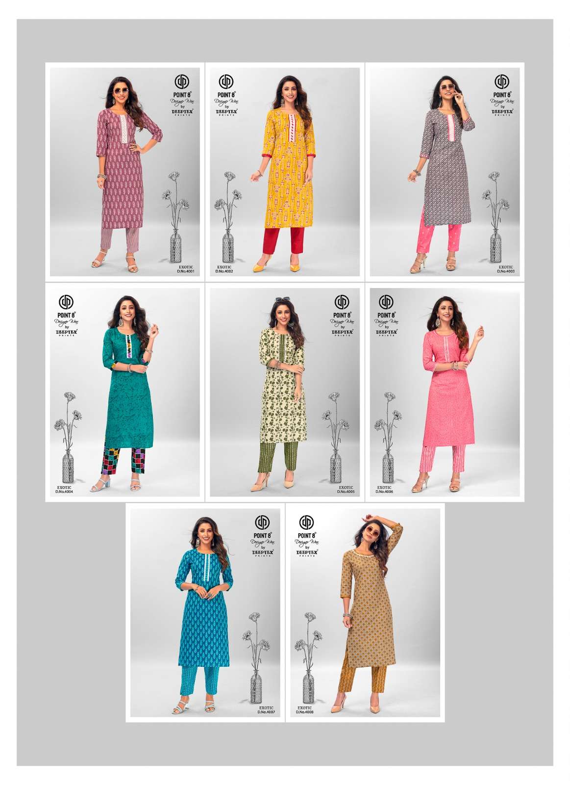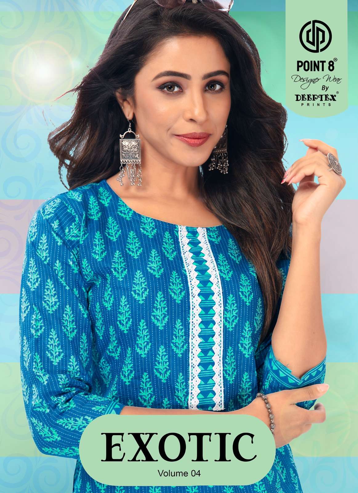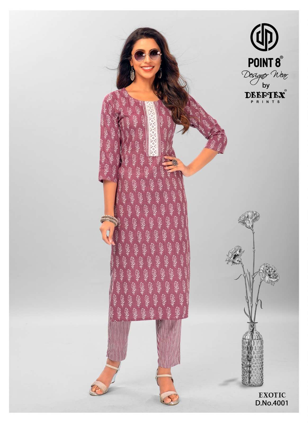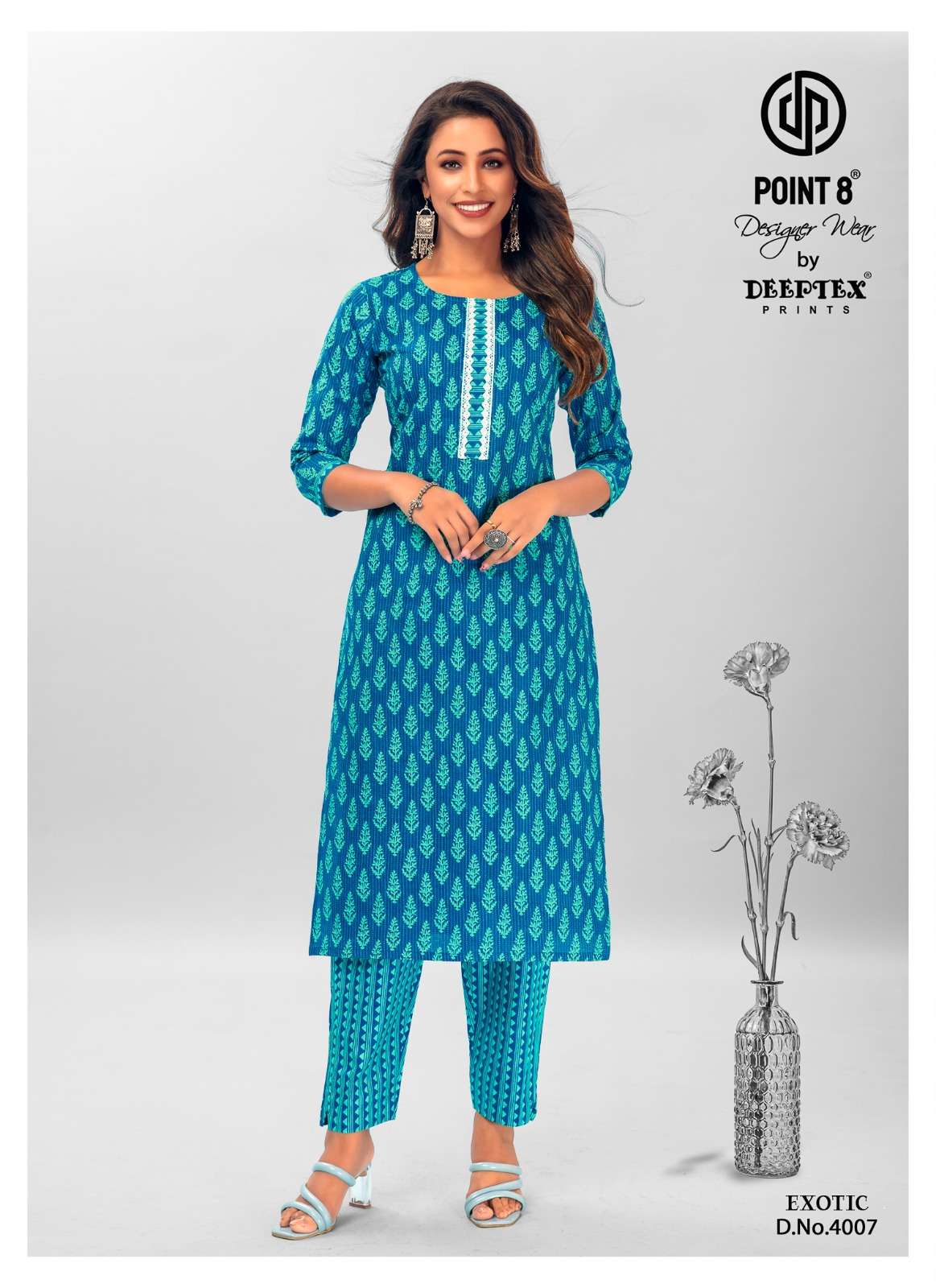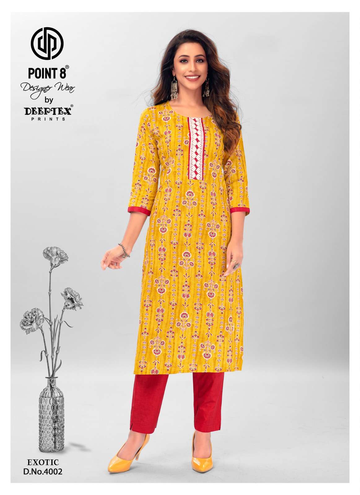 exotic vol 4 by point 8 deeptex print casual wear fancy cotton kurti and pant