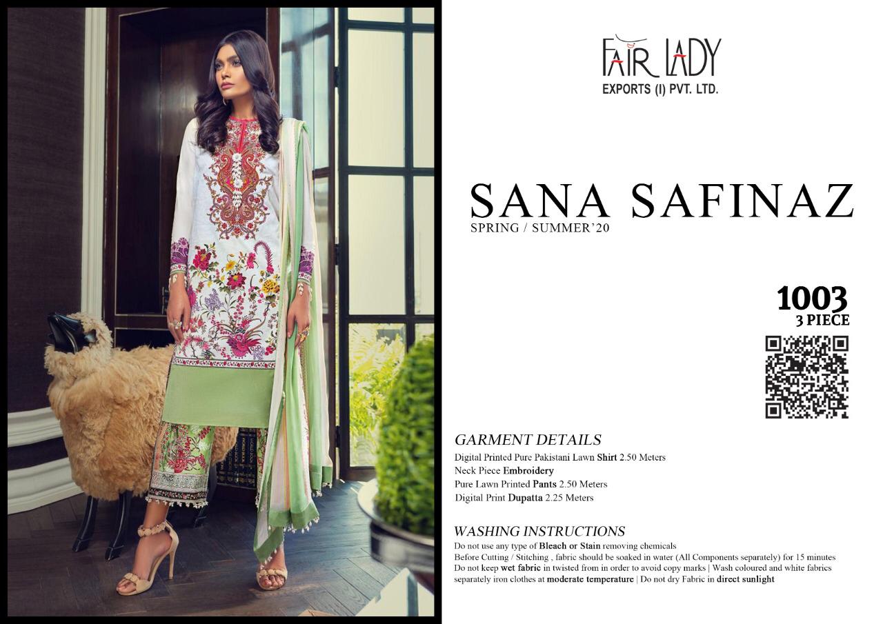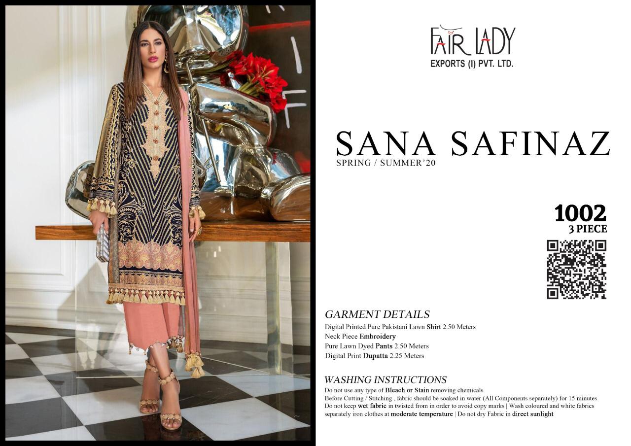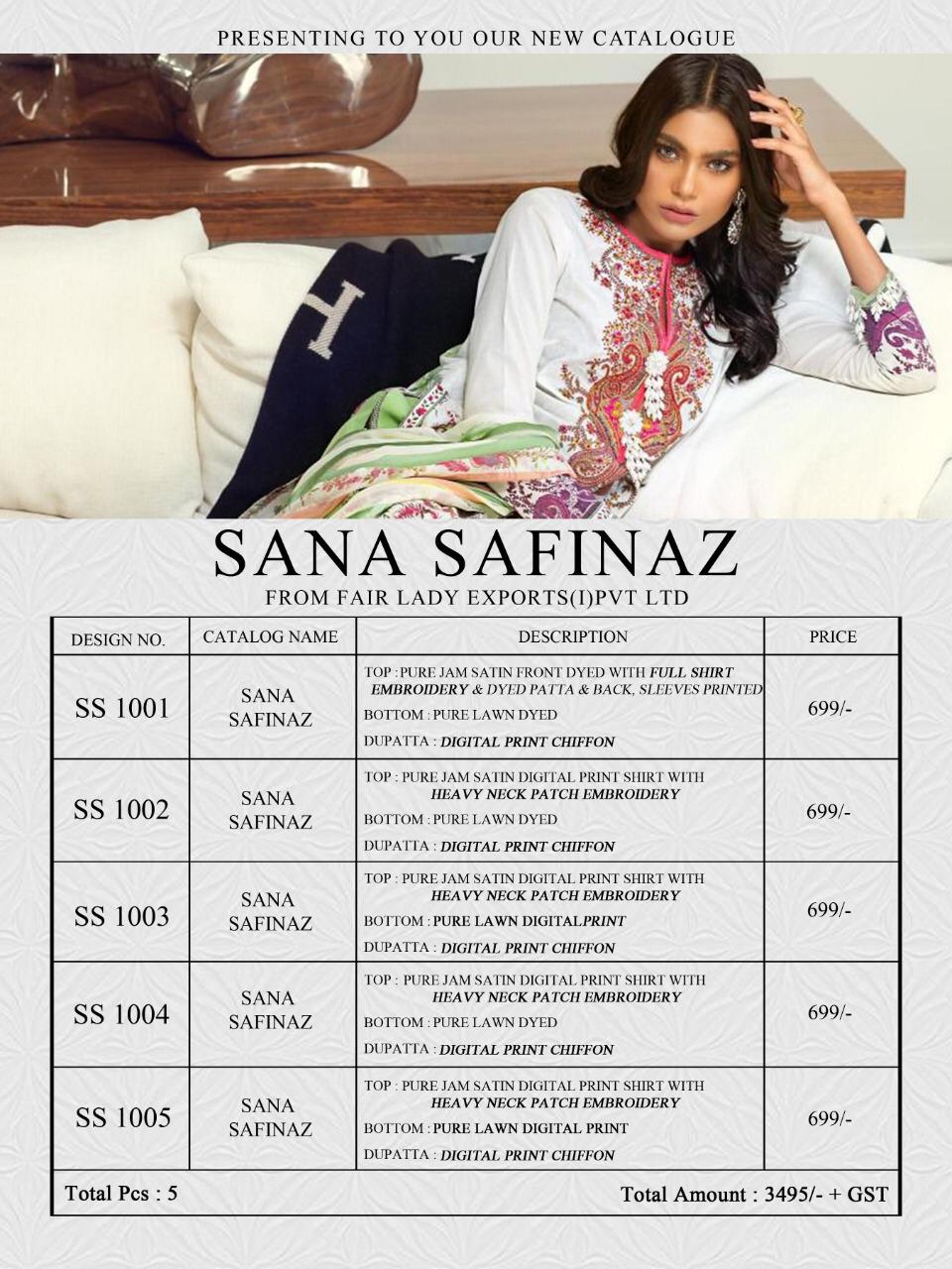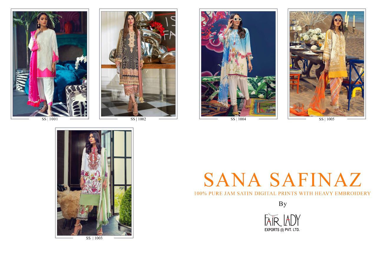CATALOGUE NAME:- FAIR LADY SANA SAFINAZ SATIN DESIGNS:- HIT 5 DESIGNS SET FABRIC DETAILS:- TOP:- JAM SATIN PRINT *WITH HEAVY EMBROIDERY * DUP:- PURE LAWN MUL MUL & PURE NAZNEEN DUPATTA BOT:- DYED LAWN COTTON #03 & 05 BOTTOM PRINTED RATE:-729/- + GST LAWN RATE:-699/- + GST CHIFFON _HEAVY EMBROIDERY PATCHES IN ALL SUITS_ *FABRIC + EMBROIDERY QUALITY UN COMPARABLE * |
