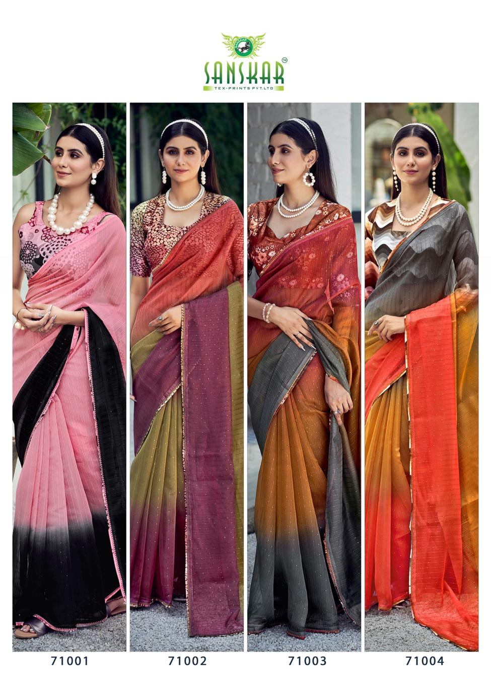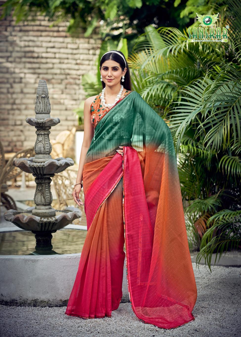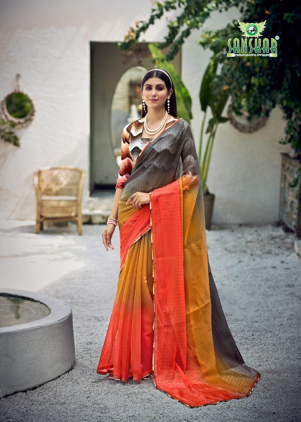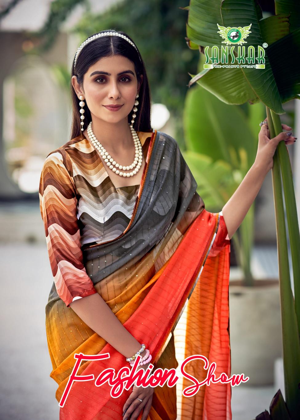 Sanskar Tex prints pvt. ltd. CATLOUGE- FASHION SHOW Fabric- orgenza weaving Sequence with Border acording digital print blouse Qty- 8dis (8 set each bale) RATE - 620₹ |