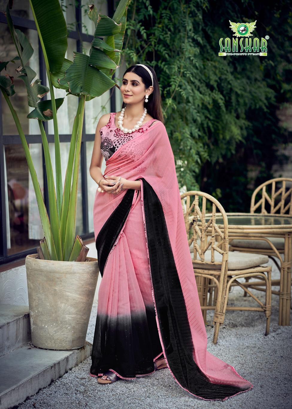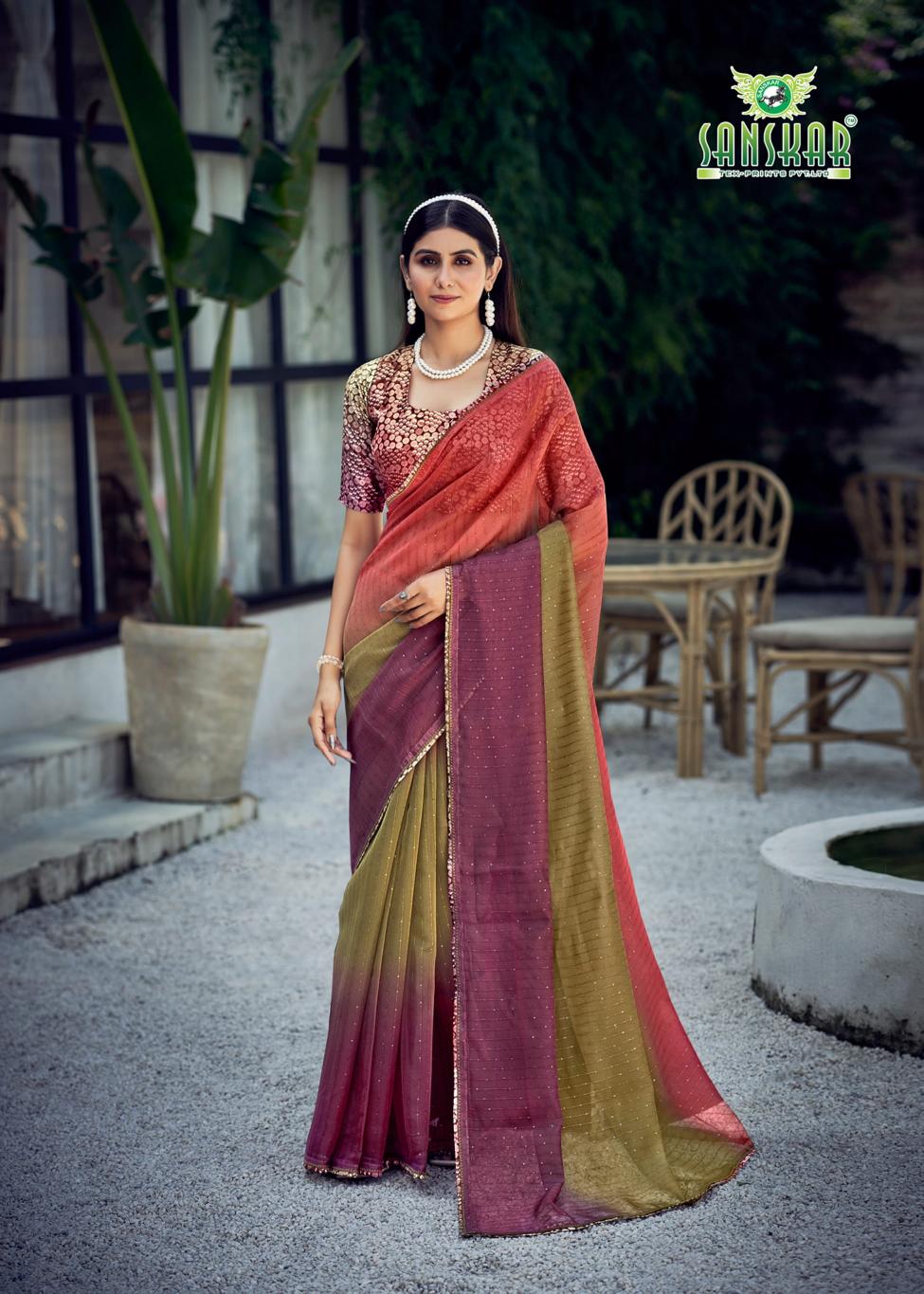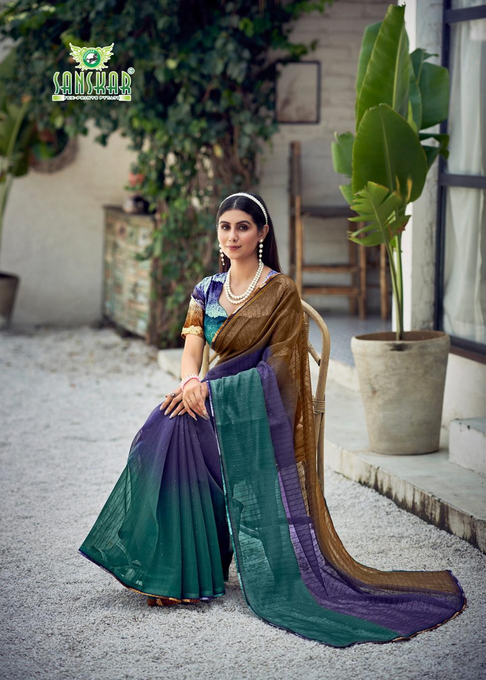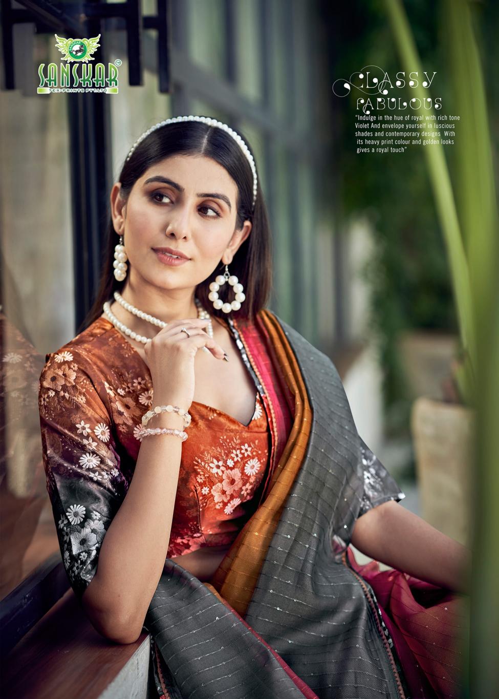 Sanskar Tex prints pvt. ltd. CATLOUGE- FASHION SHOW Fabric- orgenza weaving Sequence with Border acording digital print blouse Qty- 8dis (8 set each bale) RATE - 620₹ |