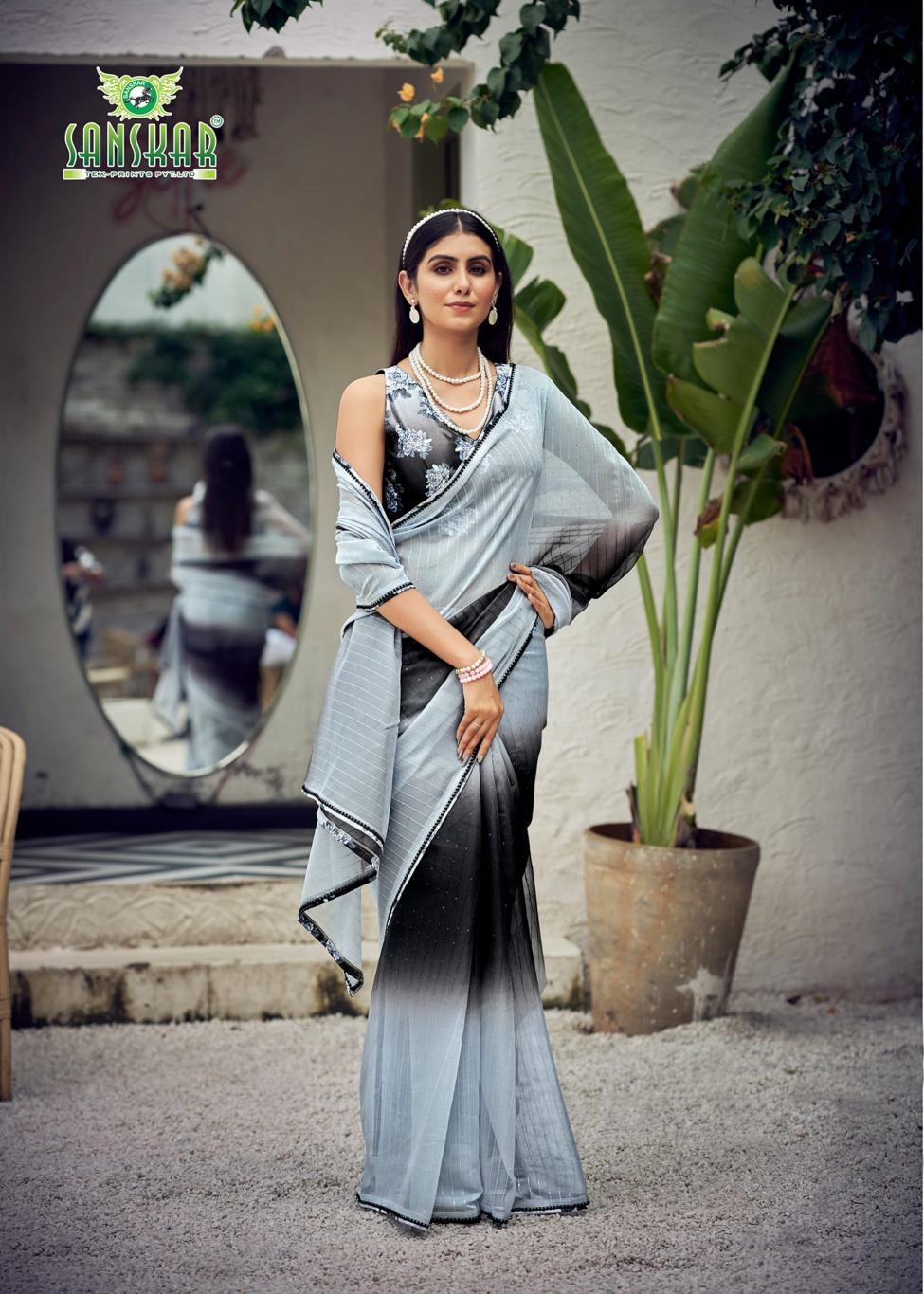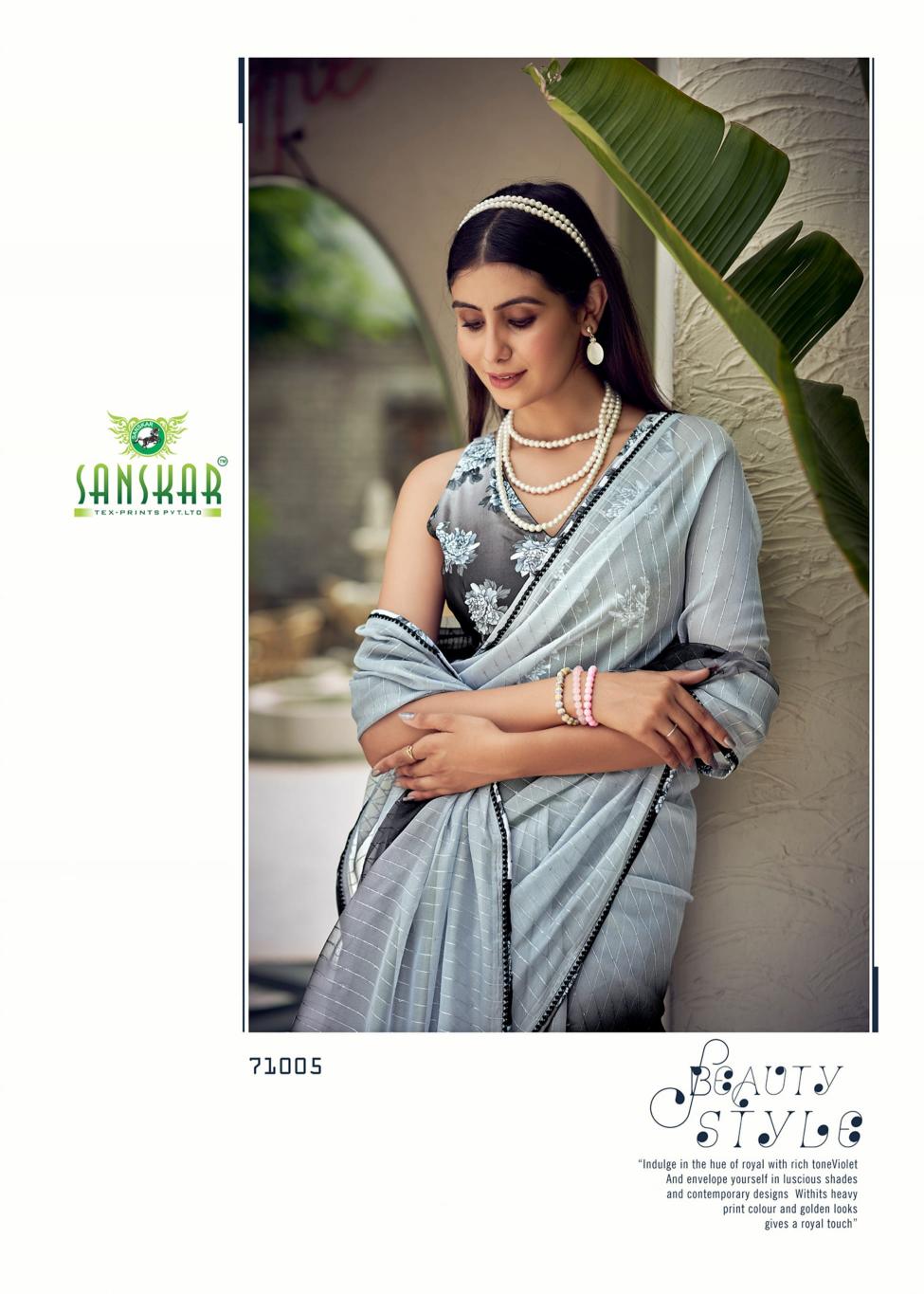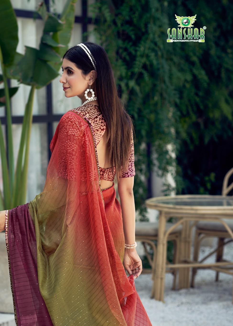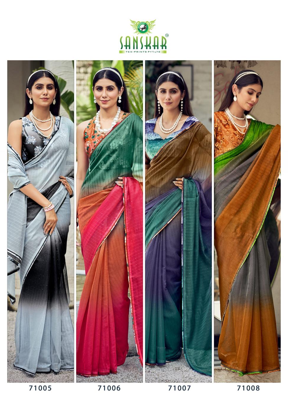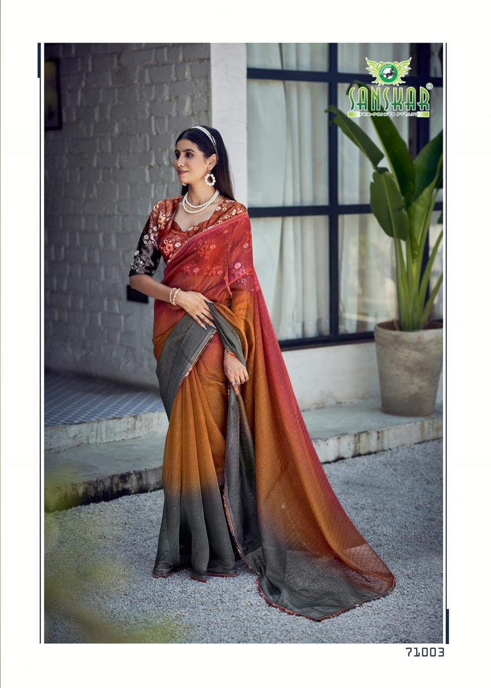 Sanskar Tex prints pvt. ltd. CATLOUGE- FASHION SHOW Fabric- orgenza weaving Sequence with Border acording digital print blouse Qty- 8dis (8 set each bale) RATE - 620₹ |