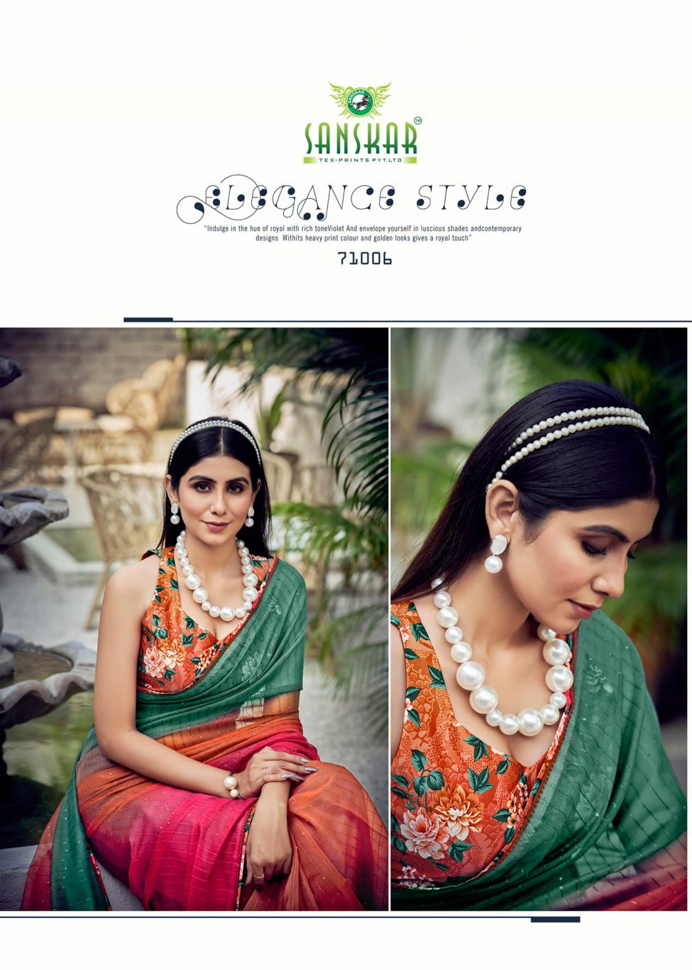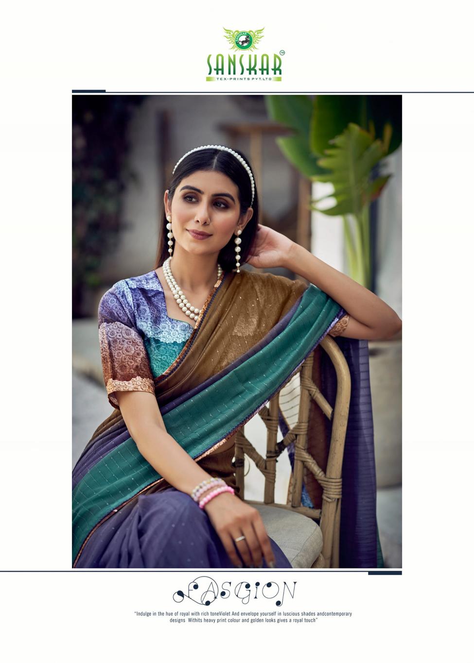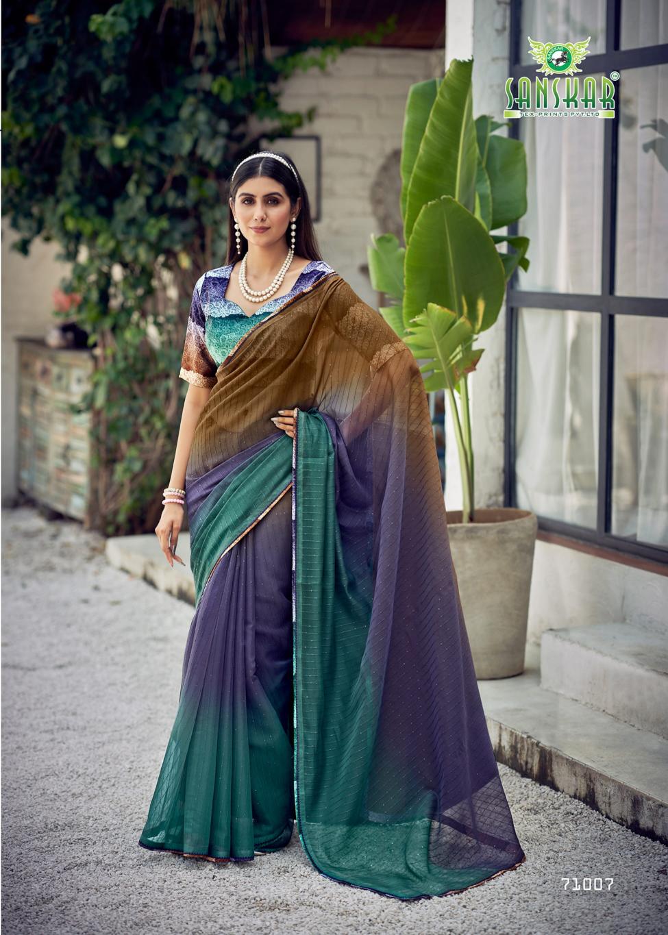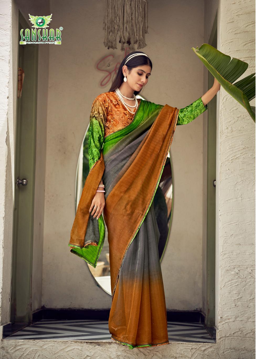 Sanskar Tex prints pvt. ltd. CATLOUGE- FASHION SHOW Fabric- orgenza weaving Sequence with Border acording digital print blouse Qty- 8dis (8 set each bale) RATE - 620₹ |