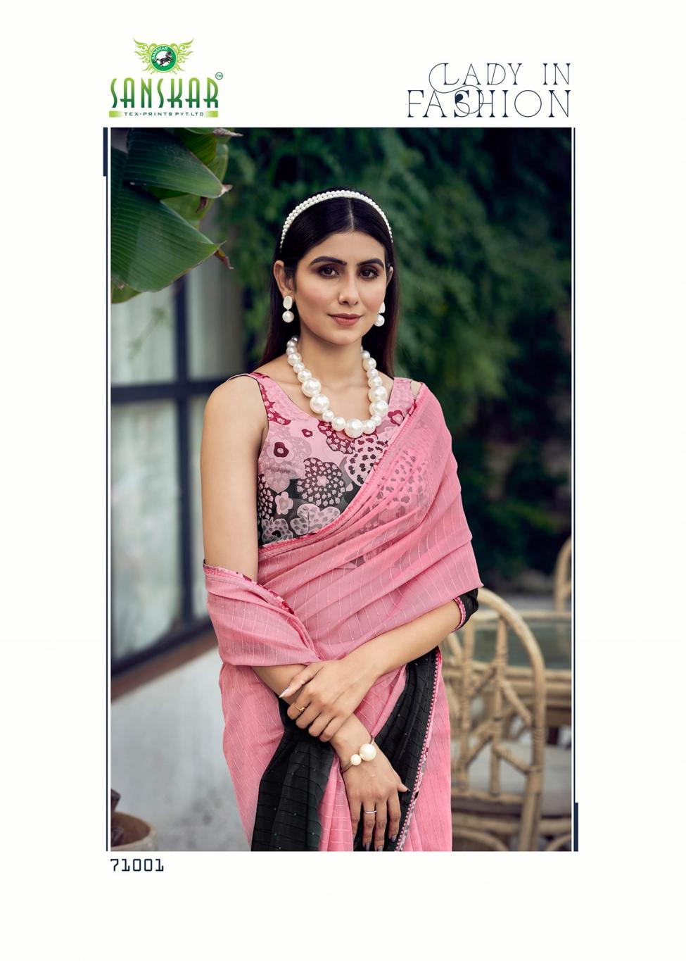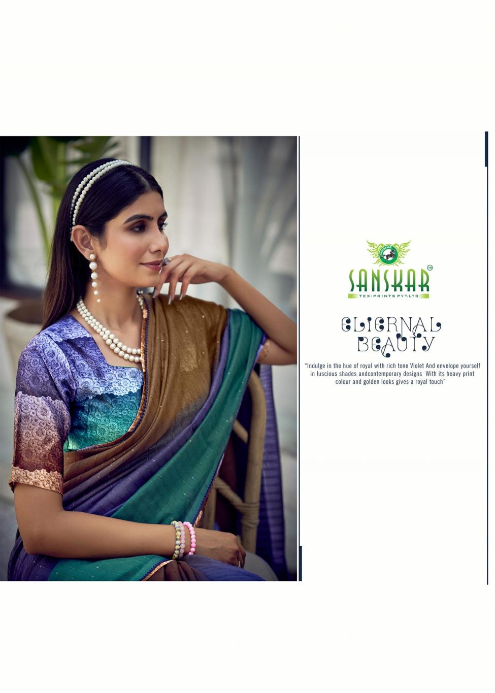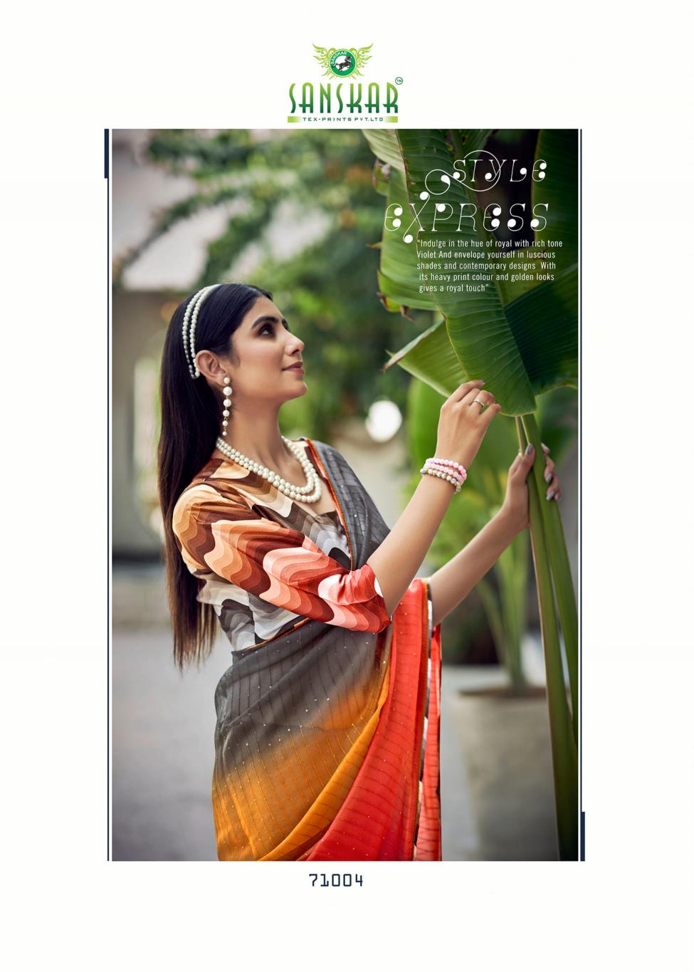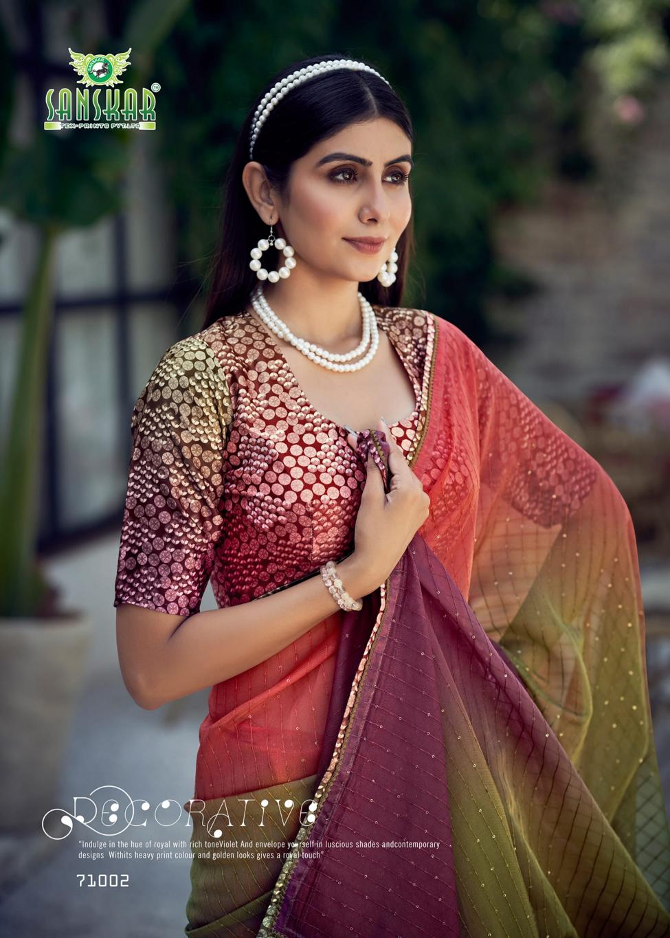 Sanskar Tex prints pvt. ltd. CATLOUGE- FASHION SHOW Fabric- orgenza weaving Sequence with Border acording digital print blouse Qty- 8dis (8 set each bale) RATE - 620₹ |
