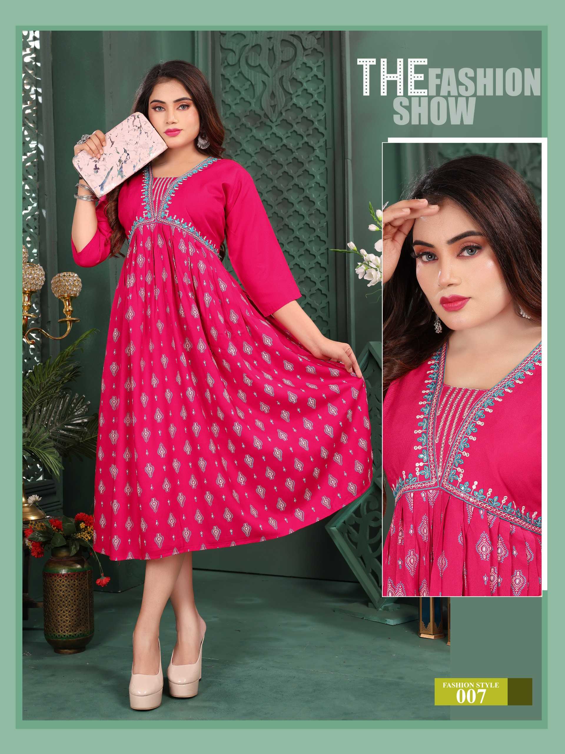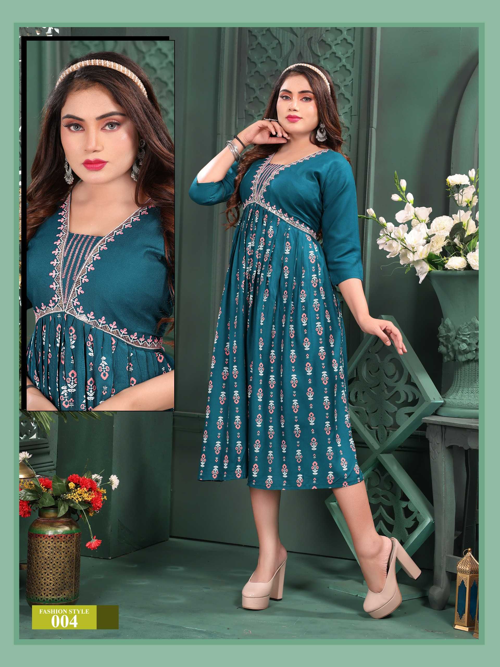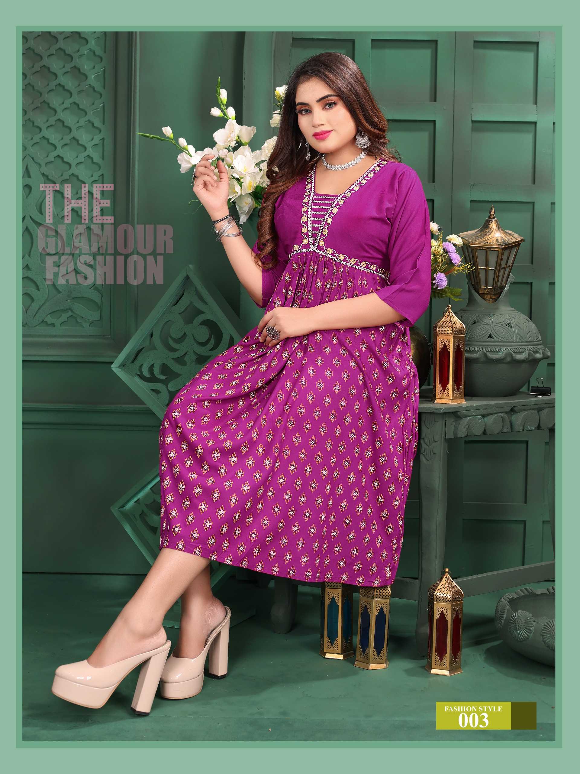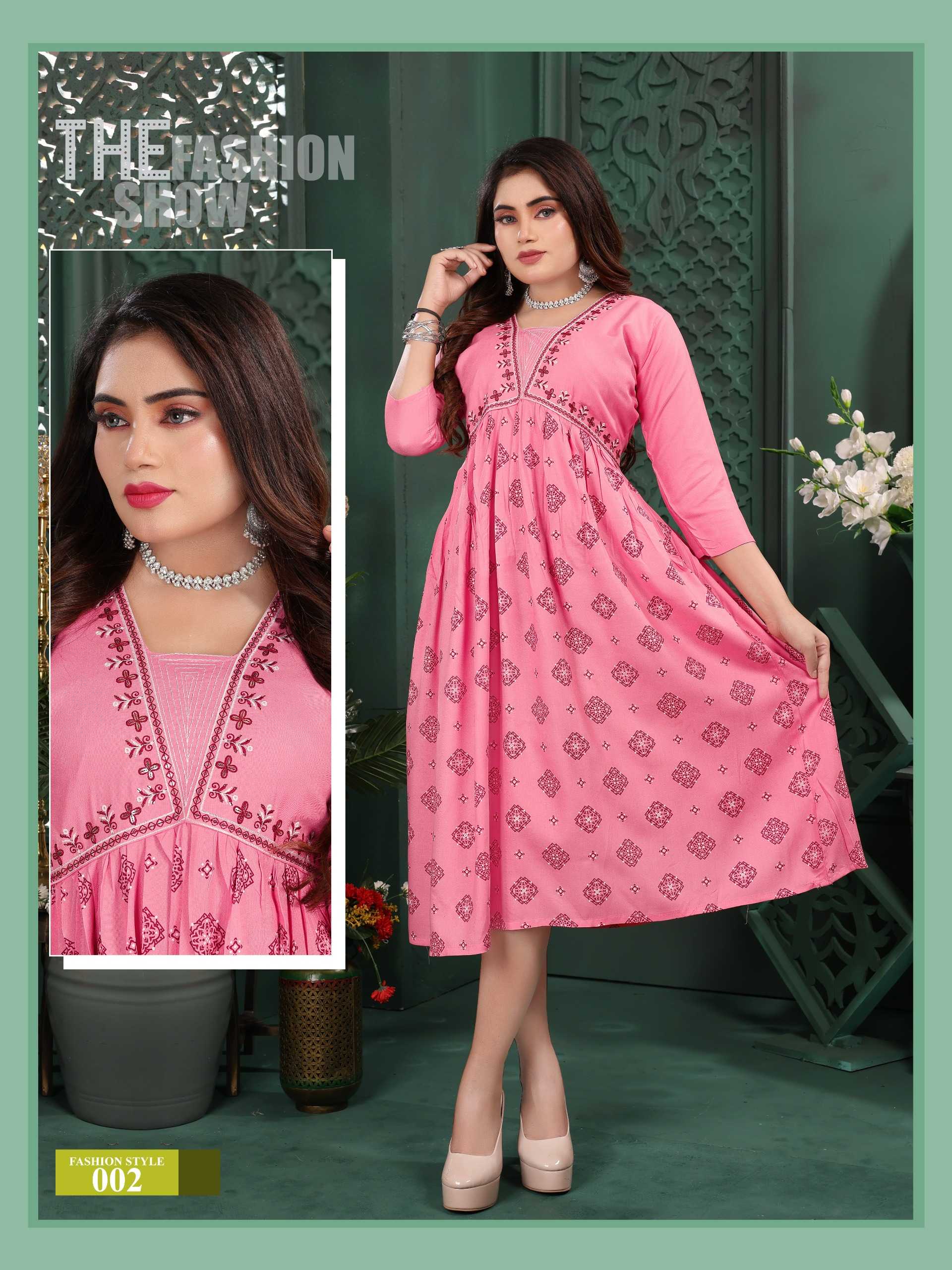 FASHION TALK presents its new catalog 📒Name: IQRA(ALIYA CUT) 👗 Fabric: Rayon Screen Print ✨ Concept: Embroidery Work Alia V Pattern Ghera Kurtis ✨Ghera: 44” ✨Length: 46” ✨ Colours: 10 ✨Sizes: M, L, XL, XXL & 3XL Rate: 360/- |