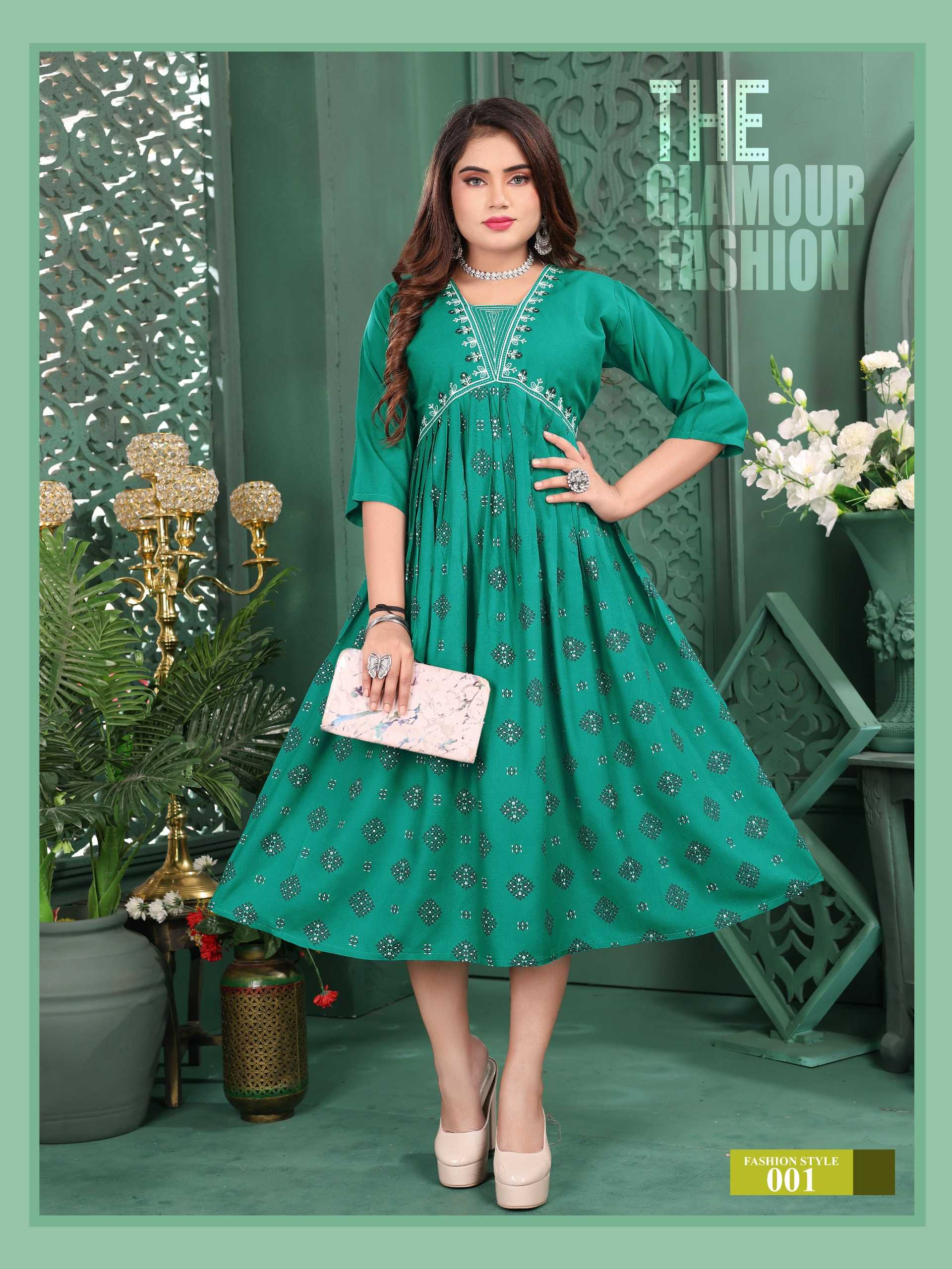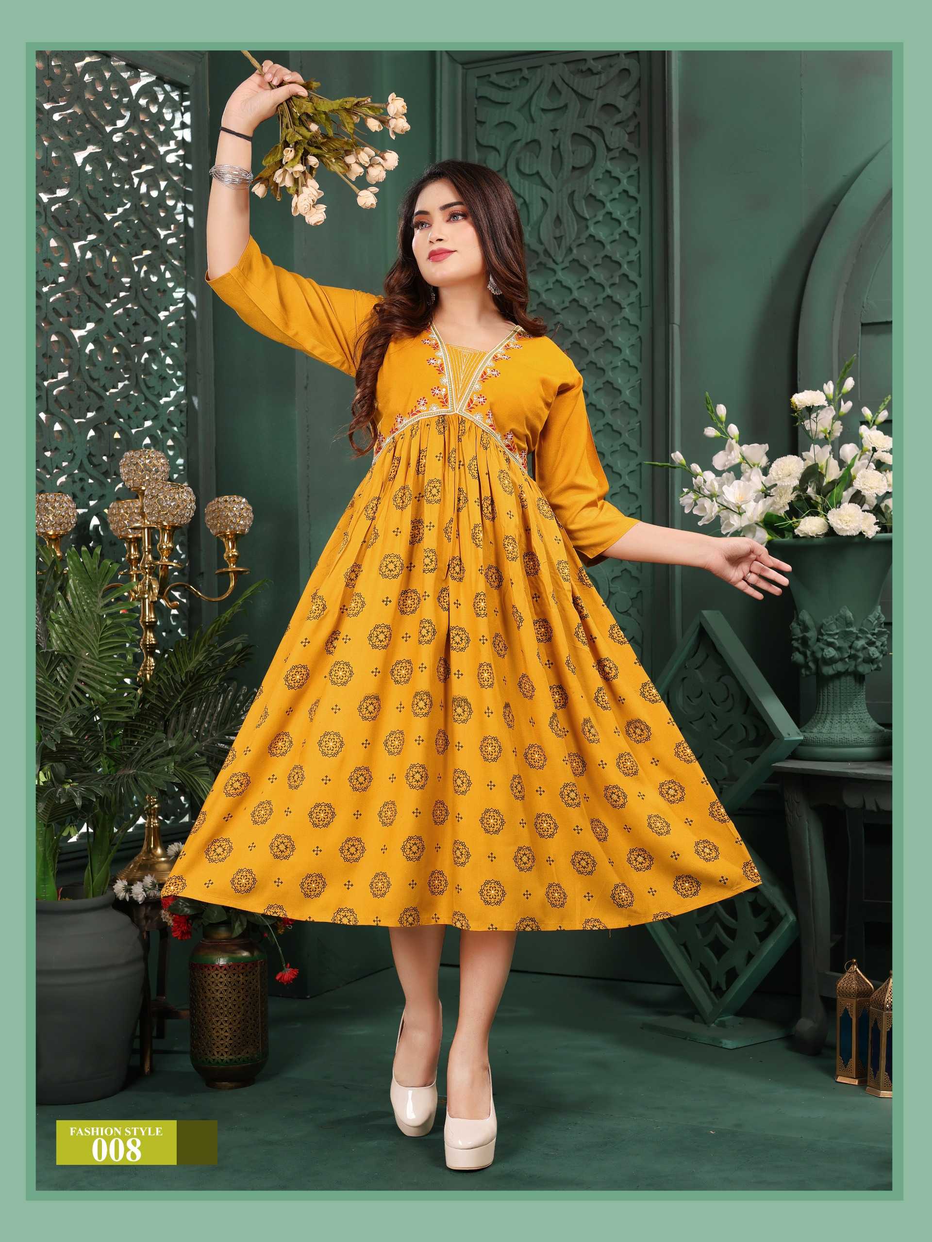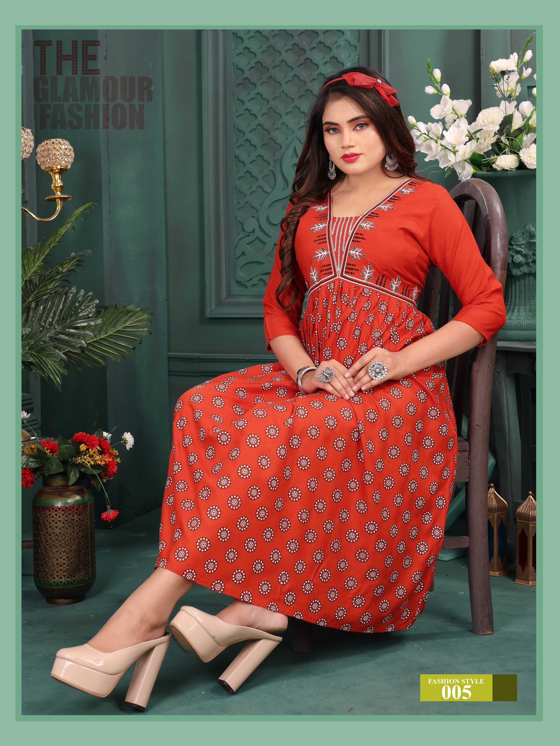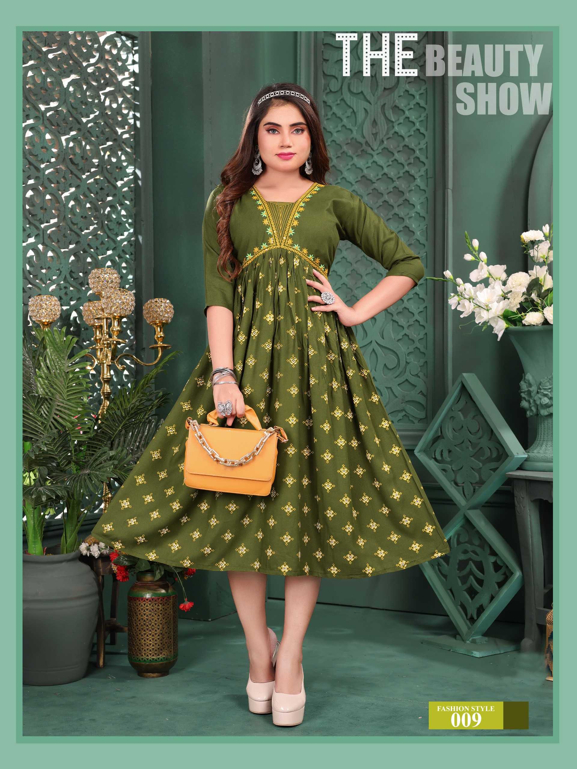 FASHION TALK presents its new catalog 📒Name: IQRA(ALIYA CUT) 👗 Fabric: Rayon Screen Print ✨ Concept: Embroidery Work Alia V Pattern Ghera Kurtis ✨Ghera: 44” ✨Length: 46” ✨ Colours: 10 ✨Sizes: M, L, XL, XXL & 3XL Rate: 360/- |