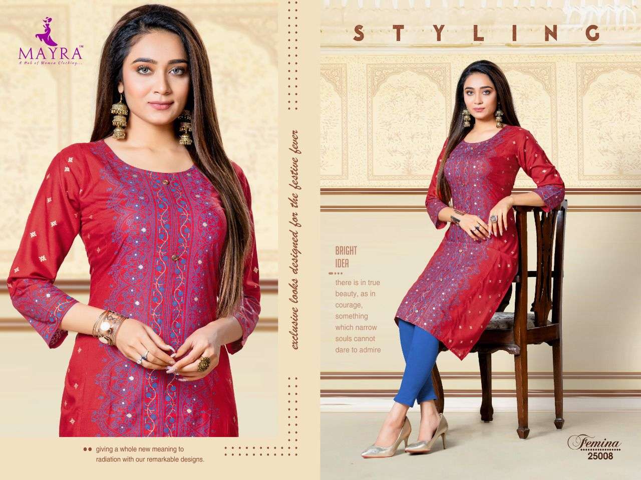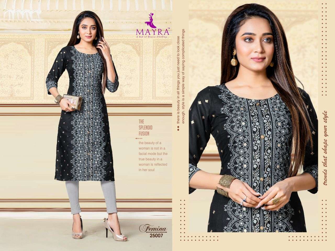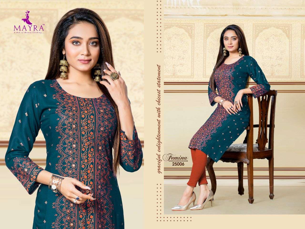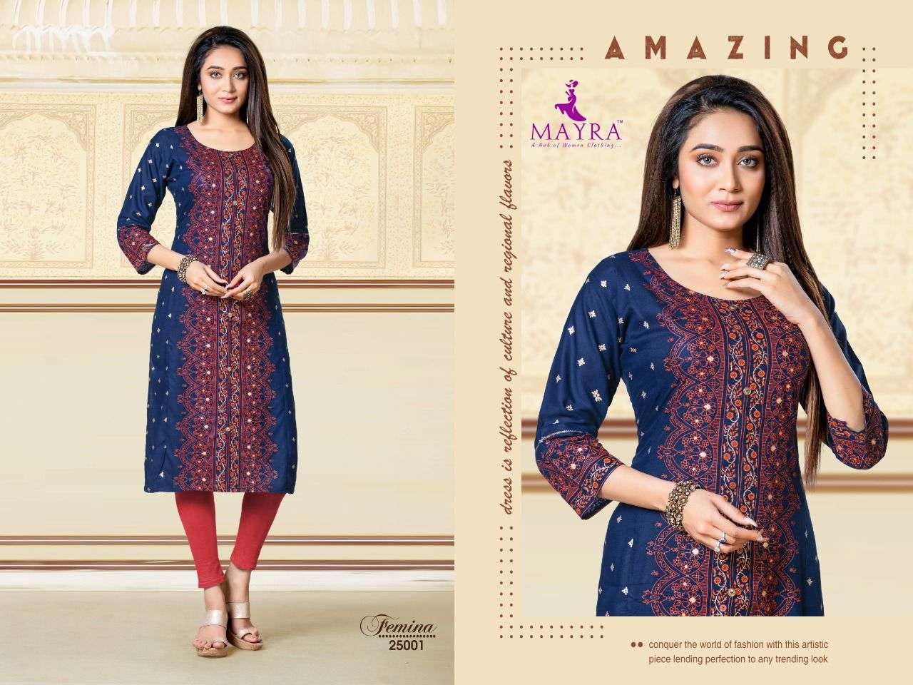 Dear Customers, Welcome to MAYRA (KURTI) .., We are introducing MAYRA 'S new catalog 📕Catalogue:- FEMINA 👗cloth :- RAyon slub 14KG with Screen foil print with Stiching pattern ✅concept :- * screen print with Stiching patterns * Length :- 45”MINIMUM Size:- M,L,XL,XXl,3XL AVAILABLE 🚛 : Dispatch :- Dispatch after 5 January RATE : 335/- Always with you...👍 |