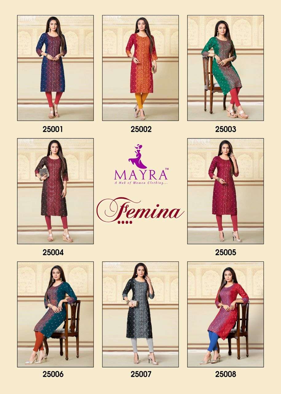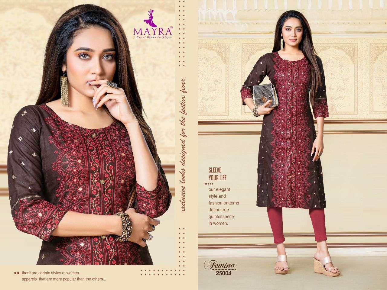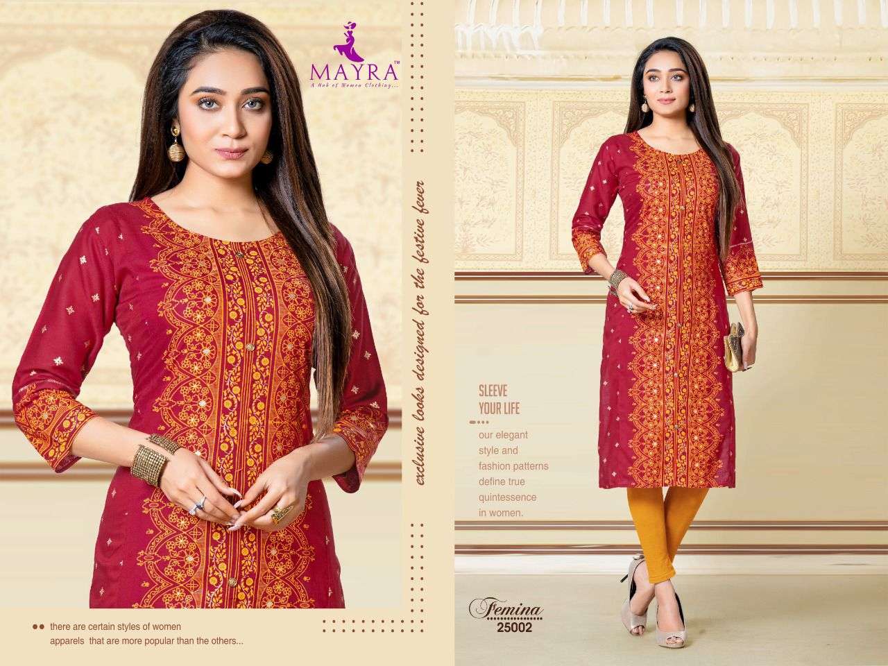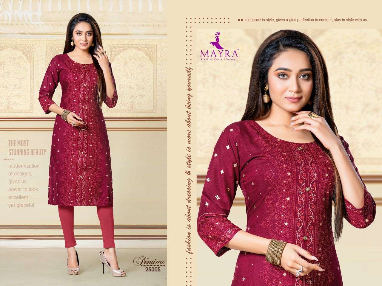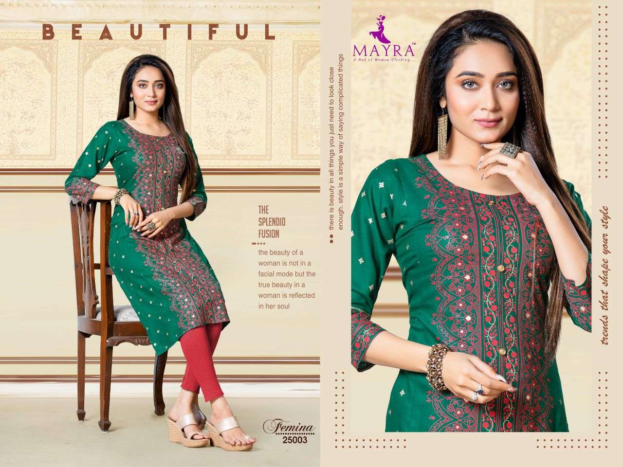 Dear Customers, Welcome to MAYRA (KURTI) .., We are introducing MAYRA 'S new catalog 📕Catalogue:- FEMINA 👗cloth :- RAyon slub 14KG with Screen foil print with Stiching pattern ✅concept :- * screen print with Stiching patterns * Length :- 45”MINIMUM Size:- M,L,XL,XXl,3XL AVAILABLE 🚛 : Dispatch :- Dispatch after 5 January RATE : 335/- Always with you...👍 |