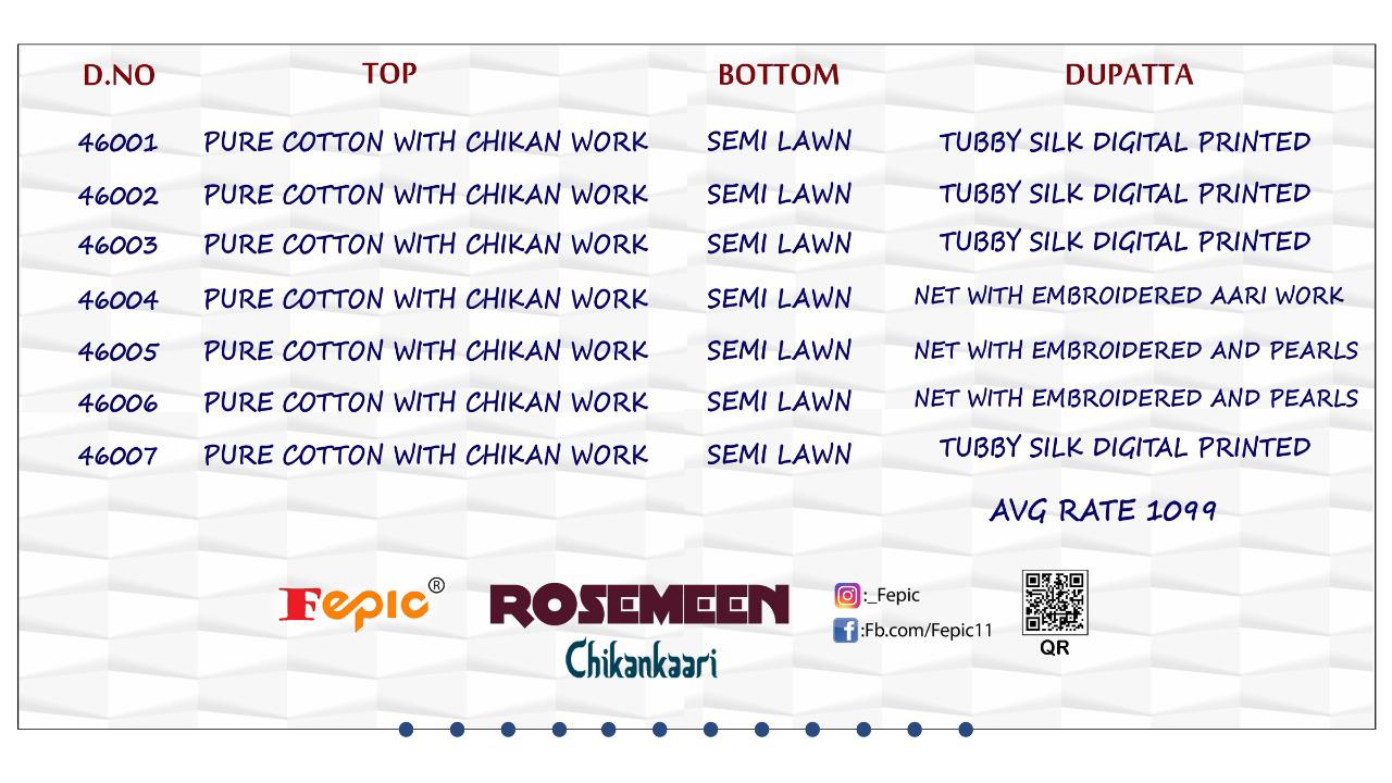 ROSEMEEN * CHIKANKAARI* Fabric details Top : PURE COTTON WITH CHIKANKAARI WORK Bottom : SEMI LAWN SLEEVES DIGITAL PRINTED Dupatta : TUBBY SILK DIGITAL PRINTED / NET WITH HEAVY EMBROIDERY Price : 1099/-+ GST ⤠7 pcs Hurry up... LIMITED STOCK pre booking only book your order fast Limited stock DISPATCH STARTS ON SATURDAY Regards FEPIC |