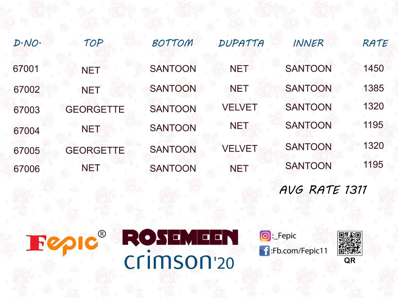 ROSEMEEN * CRIMSON 20â * Fabric details Top : GEORGETTE/NET Bottom : SANTOON INNER- SANTOON Dupatta : NET/VELVET Price : 1311/-+ GST ⤠6 pcs Hurry up... LIMITED STOCK pre booking only book your order fast Limited stock DISPATCH STARTS ON SATURDAY Regards FEPIC |