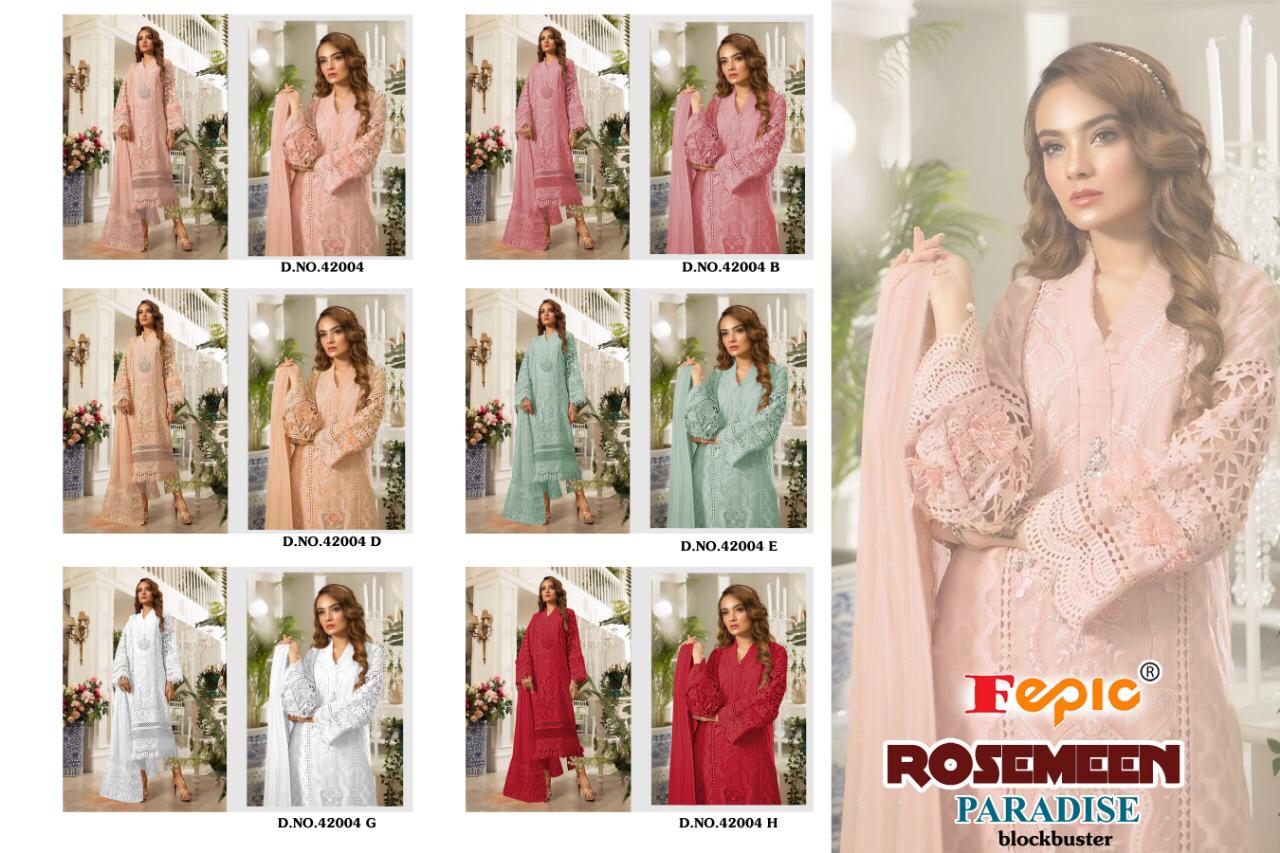 ROSEMEEN * paradise blockbuster * Fabric details Top : PURE ORAGANZA Bottom : SANTOON INNER- SANTOON Dupatta : NET Price : 1199/-+ GST â¤6pcs Regards FEPIC |