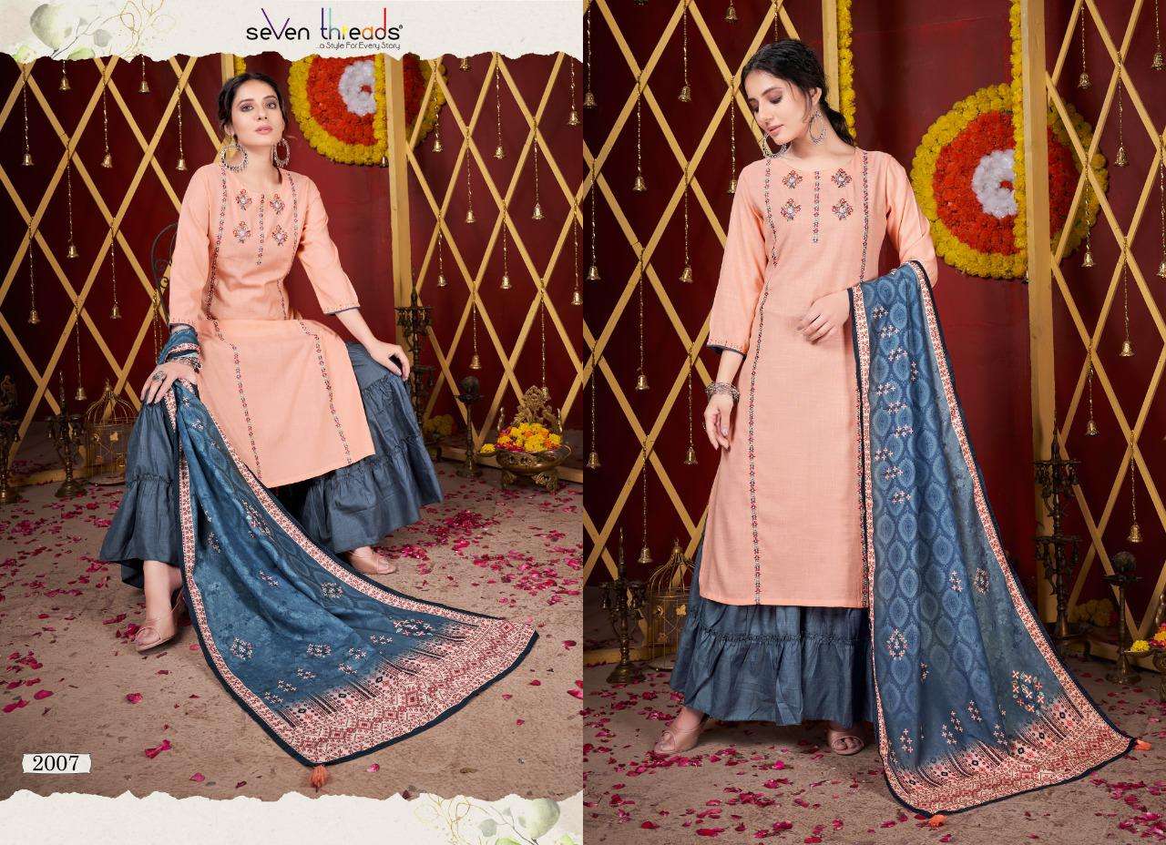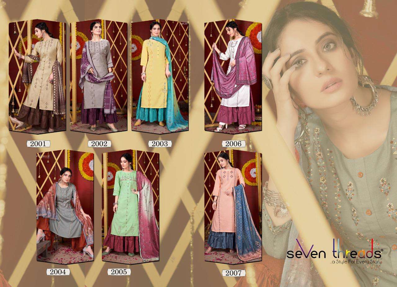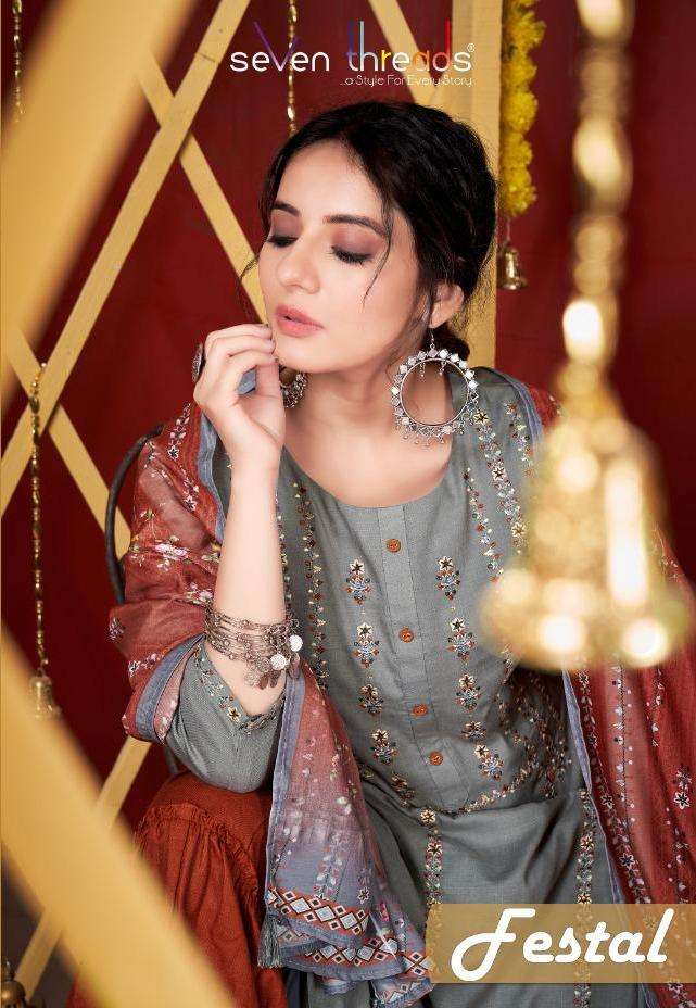 Weâre proud to announce the launch of our new catalogue as part of the ongoing evolution of our brand                                      âSEVEN THREADSâ Catalogue name:-FESTAL * - 7 Designs * Fabric -                               Top -Pure cotton viscous slub Bottom -Pure cotton slub Dupatta - Polly mull * Size - M , L , XL , XXL , XXXL * Length - 46+ * Work -                            Top - Elegant dimond touchup with classic Embroidery work Bottom -Sharara with stylish pattern Dupatta - Pollymull with beautiful digital print same as Kurties desgin Type - Full stitched  - 931/- Rs |