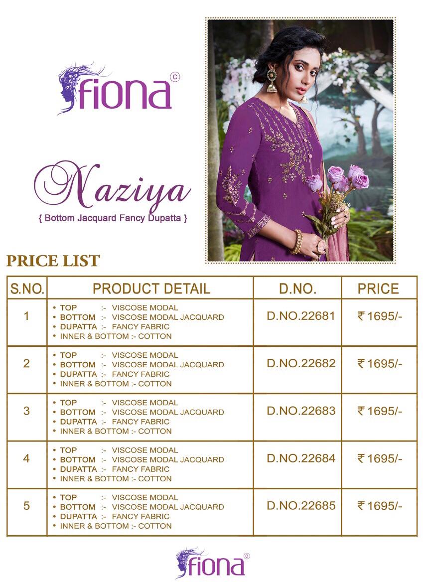 Brand - Fiona . Catlog name - NAZIYA . Rate -1695 per pcs . Set To Set . GST 5 Percent Extra. Delivery 3-4 days |