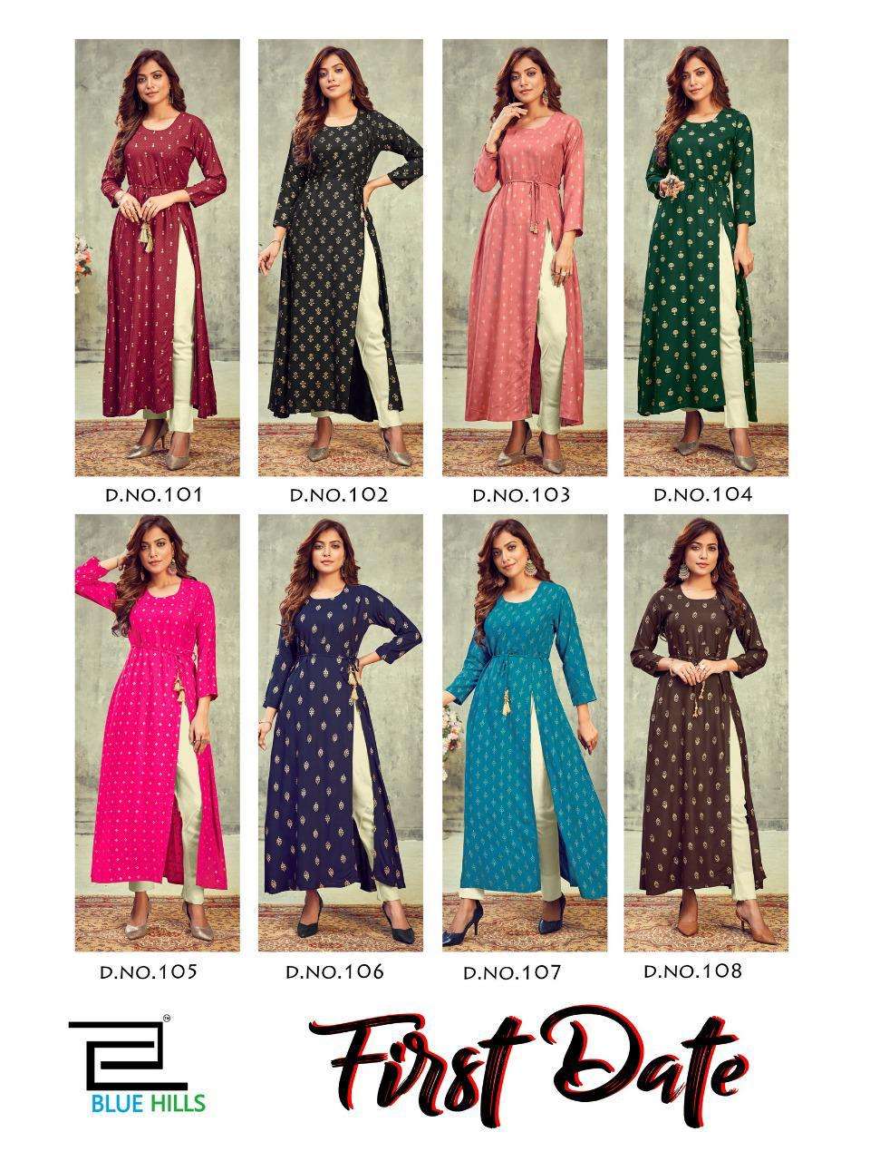 #Blue Hills presents New slite side cut Kurti concept FIRST DATE VOL - 1 -rayon 14 kg print - M L XL XXL 3XL - lenght 50 -center belt - 8 PC per bag Rate -475+GST - Today Set to set |