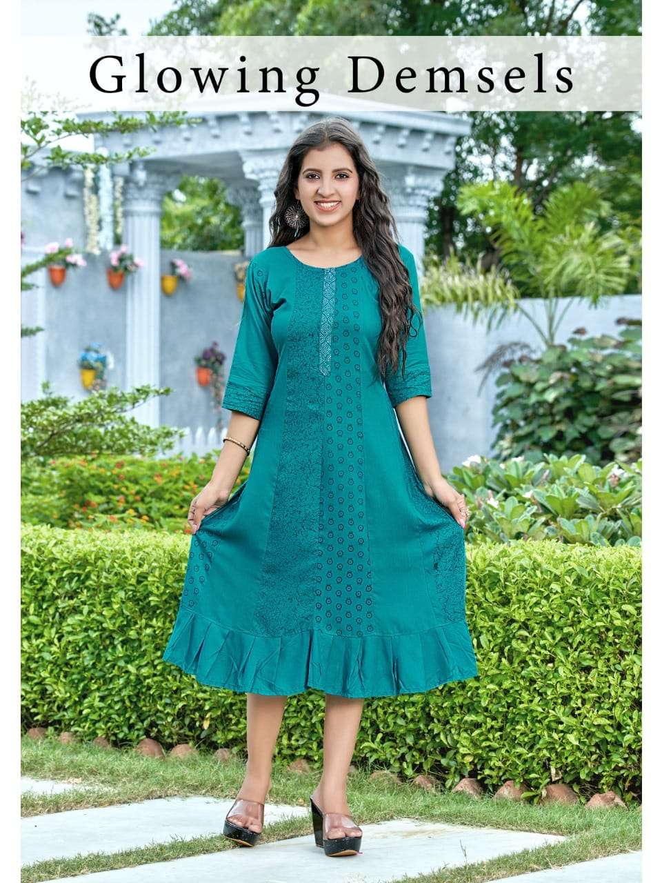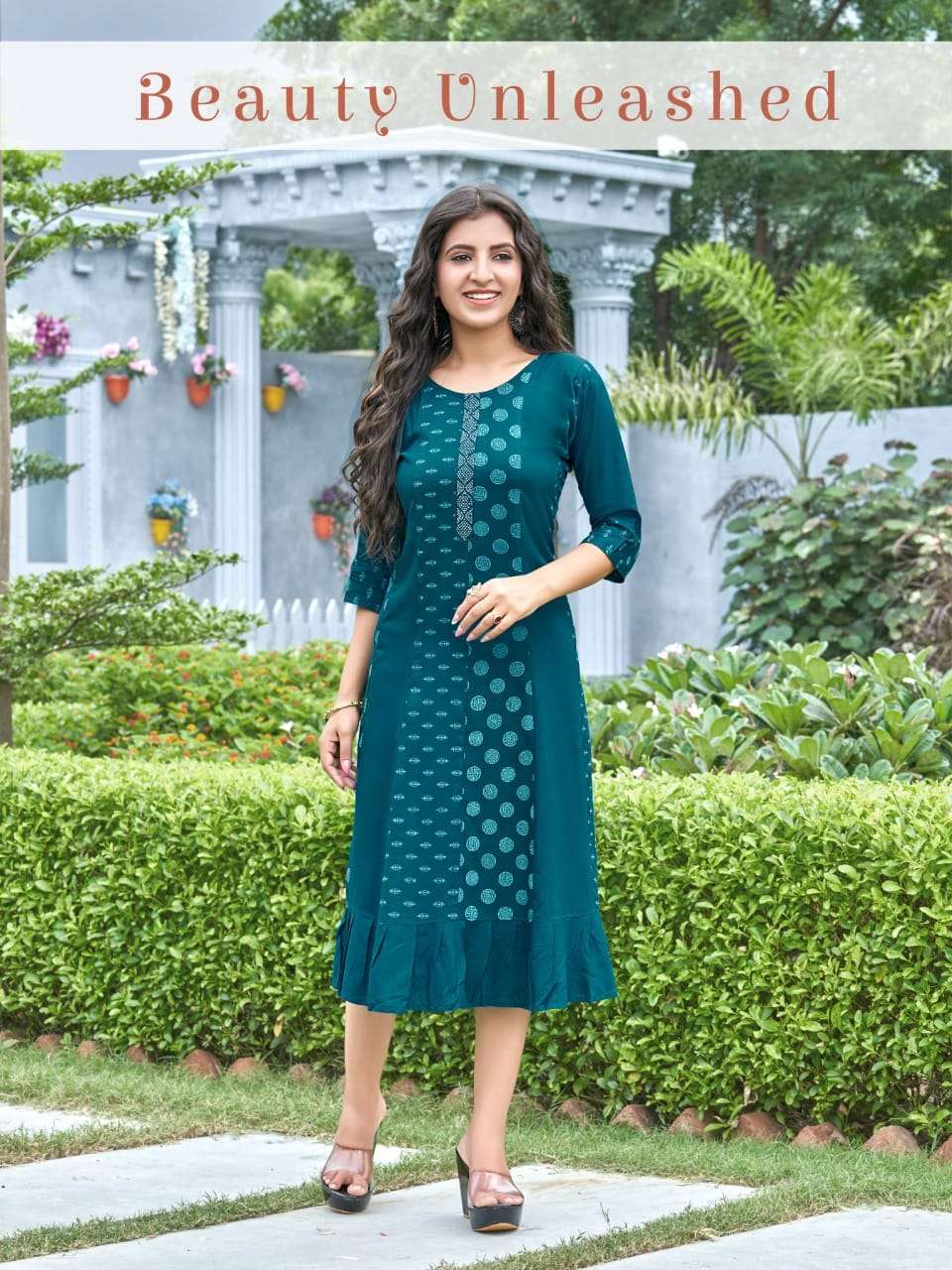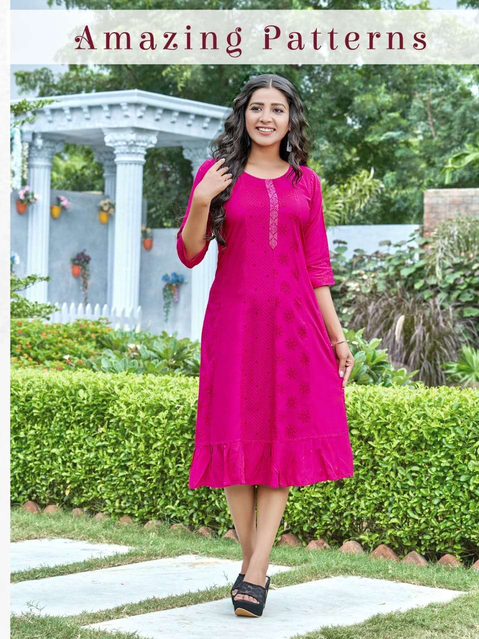Style. : Frill Sleeves. : 3/4th sleeves Length. : 45 Flair. :. 50 Sizes : M L xl 2XL 3xl Colors : 8 Price. : 375/-+Gst |