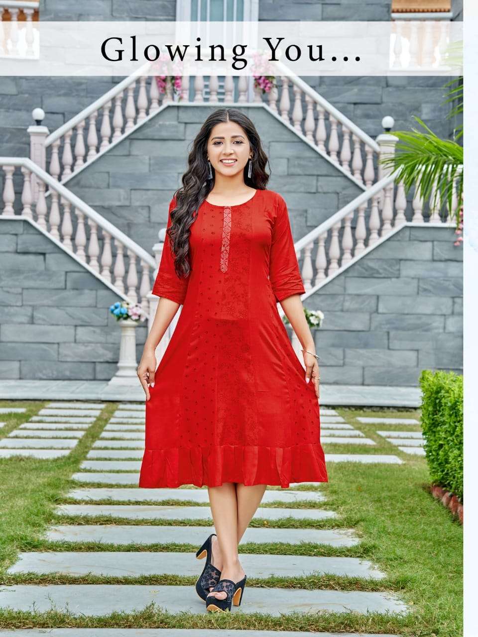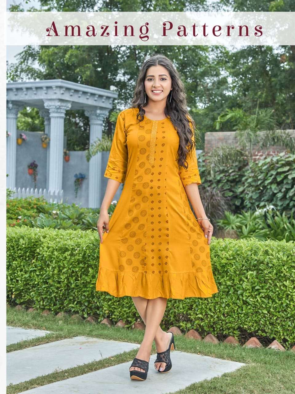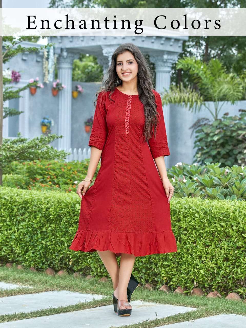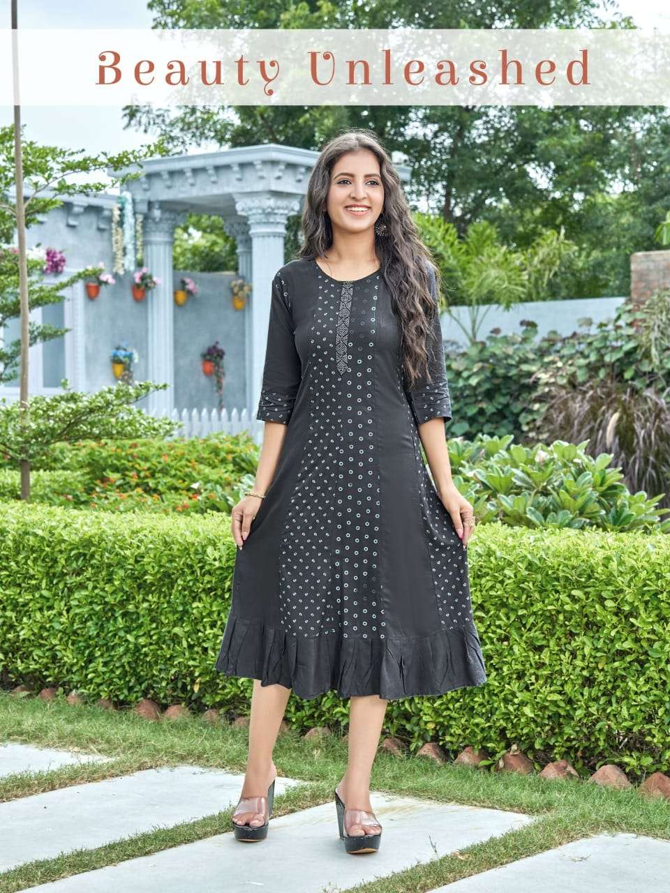 Style. : Frill Sleeves. : 3/4th sleeves Length. : 45 Flair. :. 50 Sizes : M L xl 2XL 3xl Colors : 8 Price. : 375/-+Gst |