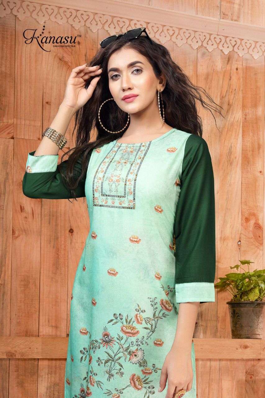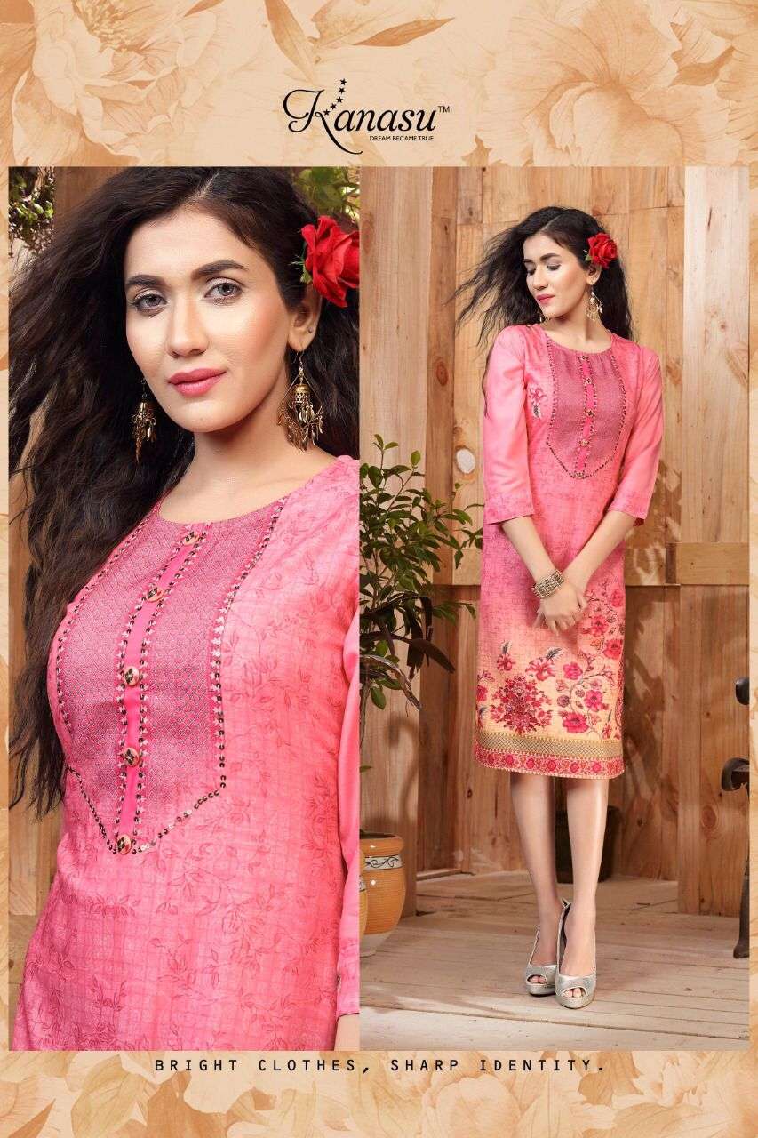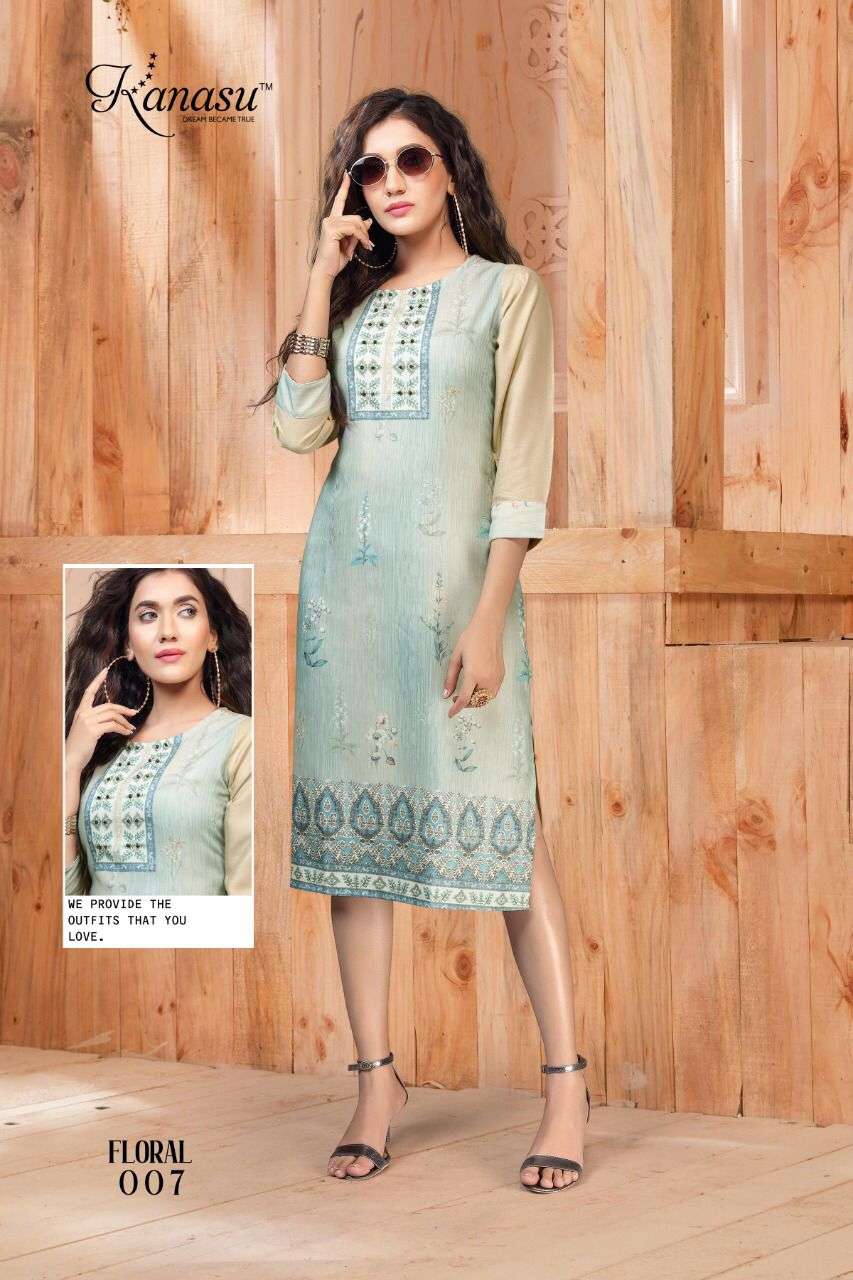 | Other Details | Dear Customers, Greeting from KANASU KURTI We are introducing KANASU 'S new catalog _ Catalogue:- * FLORAL * cloth :- HEAVY MUSLIN PRINT WITH REYON Concept :- HAND TOUCH UP LENGTH : - 40+ Rate : - 335/- Size:-  M L XL 2XL AVAILABLE 08 DESIGNS CATALOGUE DELIVERY:- READY Always with you... Team KANASU THANKS SIR/MADAM.. |