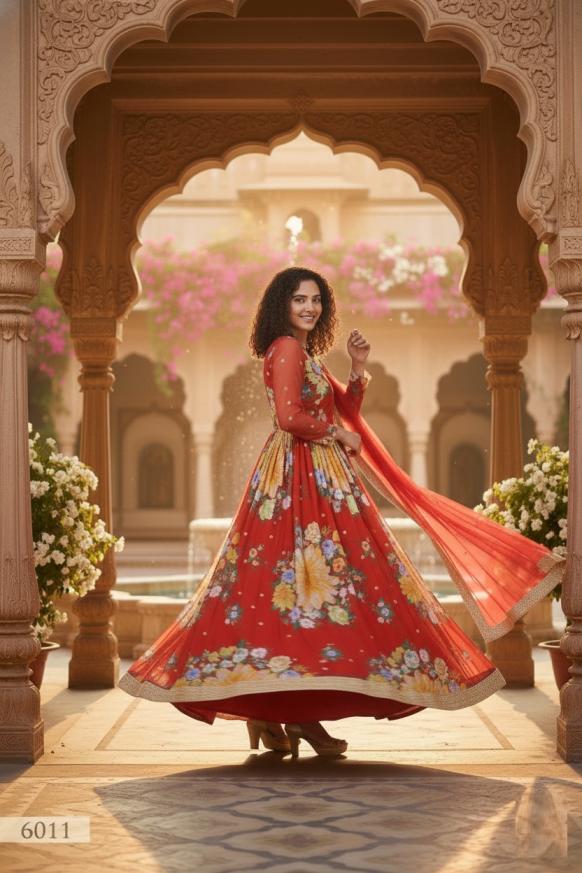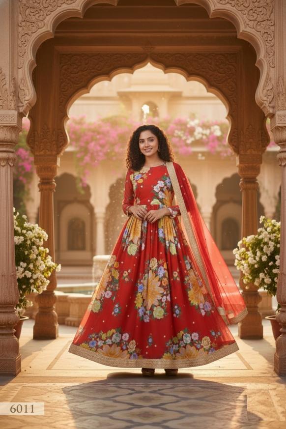 Elegant Red Floral Anarkali Suit with Golden Border SKU & COLORS FABRIC DETAILS RATE – 1200/- +GST NOTE - FREE SIZE (UP TO 44) BOOKING STARTED AVAILABILITY: SET & SINGLE |