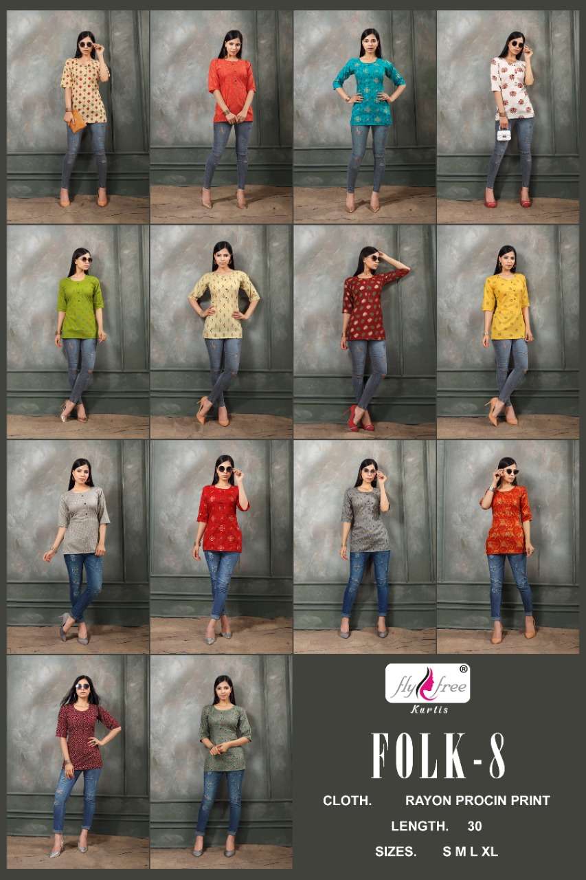 Dear Customers, Welcome to FLY FREE (KURTI) .., We are introducing FLY FREE 'S new catalogue 📕Catalogue:- FOLK-8 👗Cloth :- RAYON PROCIN PRINT ✅Concept :- TOP Length :- *30”*MINIMUM Size:- S M L XL AVAILABLE PRICE 250/- 5% GST EXTRA 🚛 : Dispatch :- READY DELIVERY |