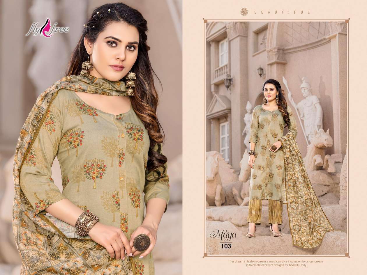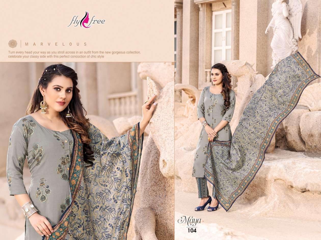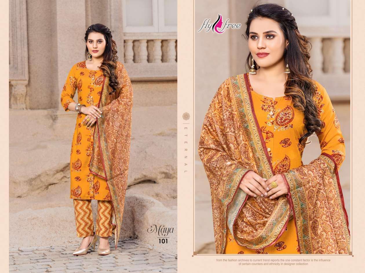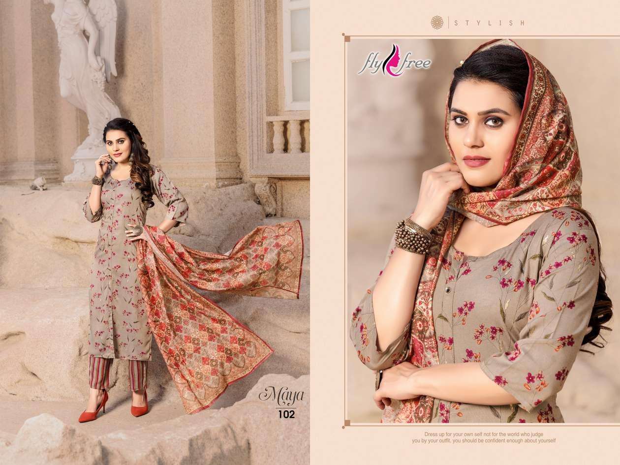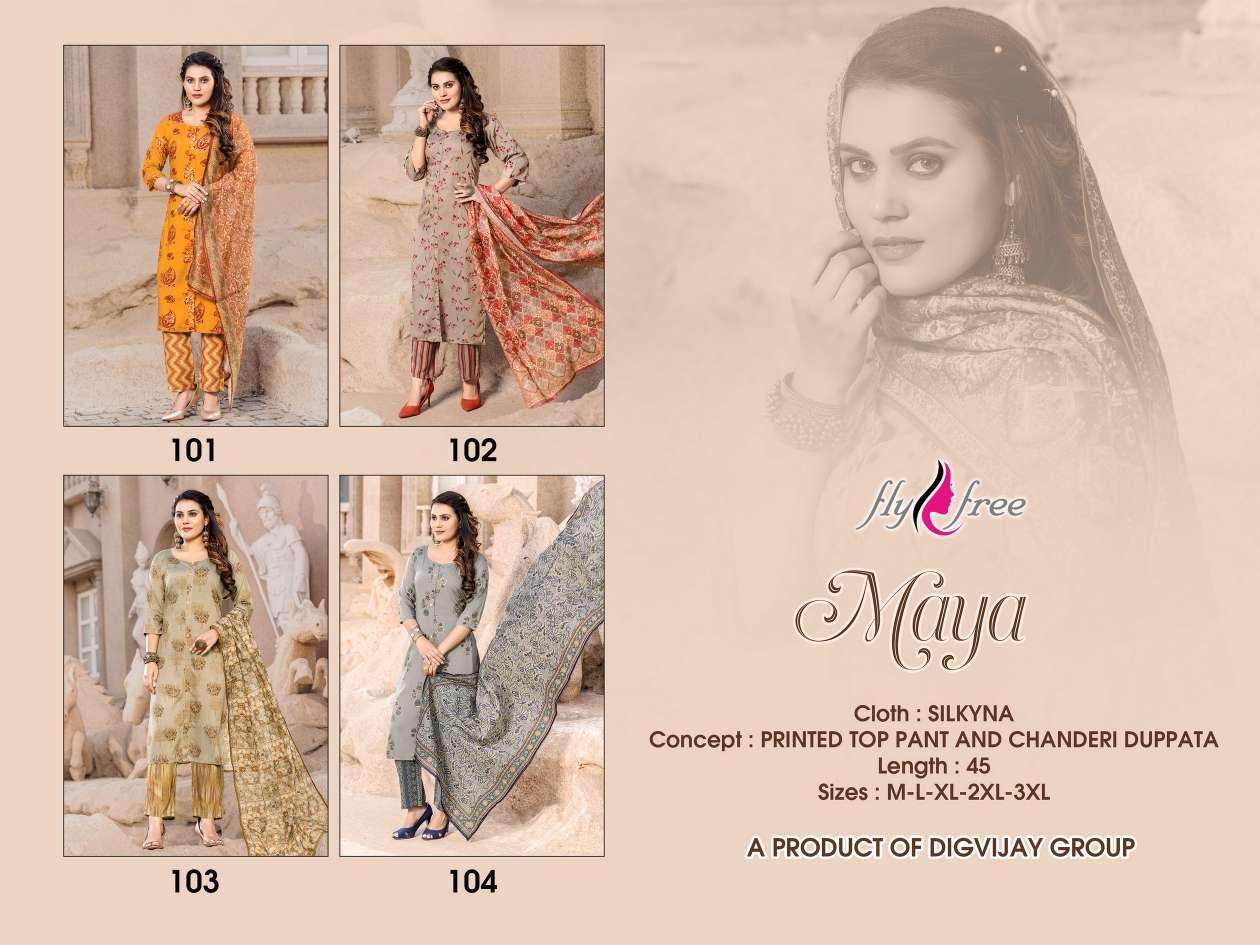 FLY FREE MAYA HEAVY SILKYNA (RAYON FEELING) PRINTED TOP PANT AND CHANDERI DUPATTA READYMADE SUIT CATALOG WHOLESALER BEST RATE