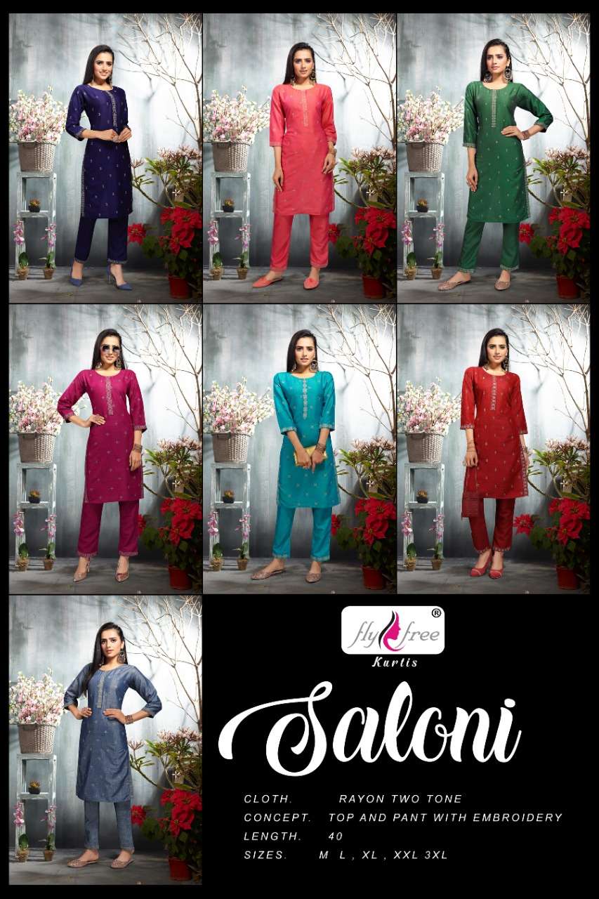 Dear Customers, Welcome to FLY FREE (KURTI) .., We are introducing FLY FREE 'S new catalogue 📕Catalogue:- SALONI 👗Cloth :- RAYON TWO TONE ✅Concept :- TOP AND PANT WITH EMBRIODERY Length :- *40”*MINIMUM Size:- M L XL 2XL 3XL AVAILABLE PRICE 450/- 5% GST EXTRA 🚛 : Dispatch :- READY DELIVERY |