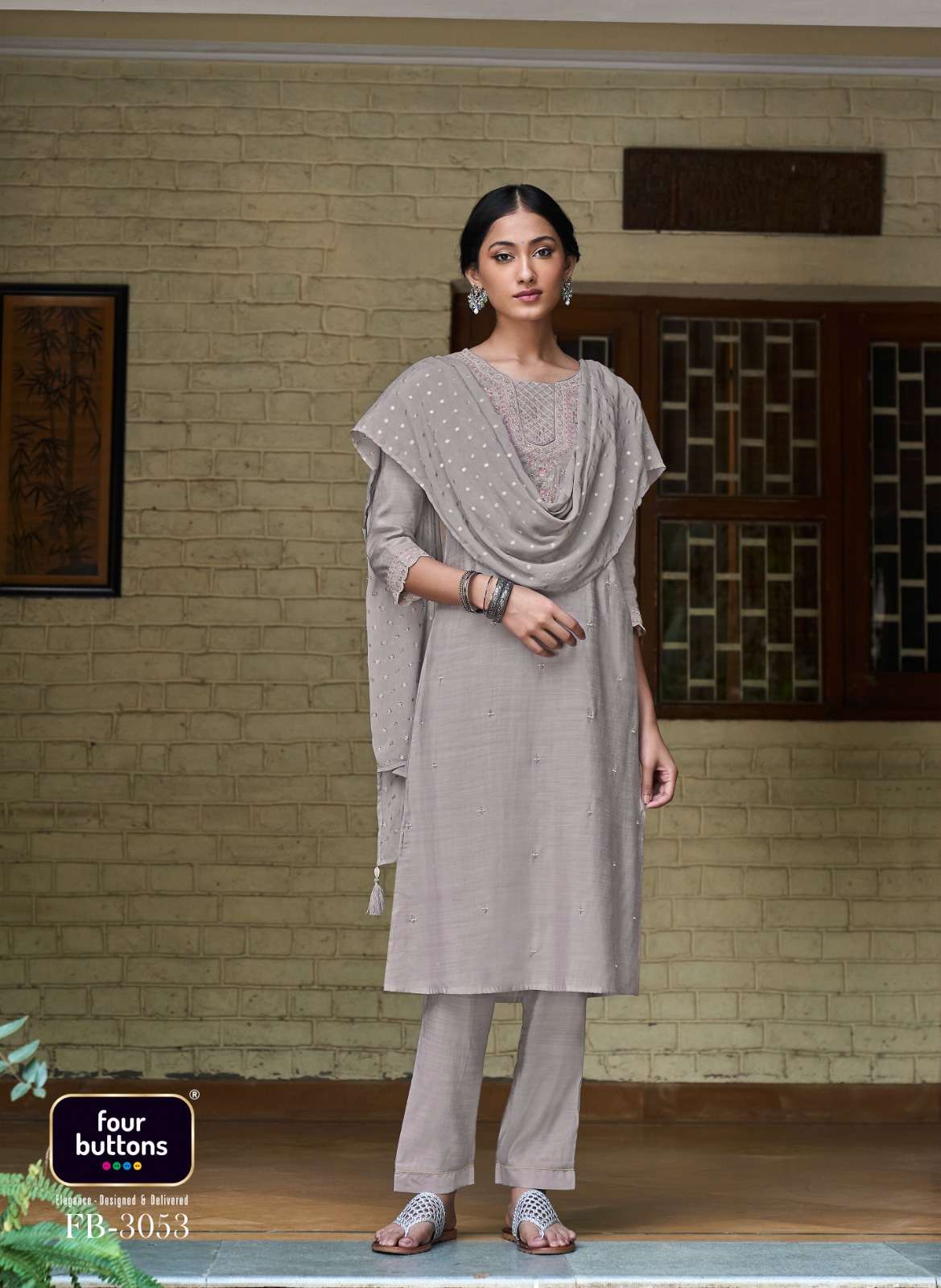 FOUR BUTTONS proudly launches its NEW collection 2023 "MURAAD" FABRIC KURTI - A-LINE CUT VISCOSE SLUB SILK WITH PLACEMENT EMBROIDERIES AND HANDWORK BOTTOM - PURE VISCOSE SLUB SILK DUPATTA- PURE CHINNON JACQUARD DUPATTA RATE - Rs 1599/- per pcs SIZES - M, L, XL, XXL, 3XL |
