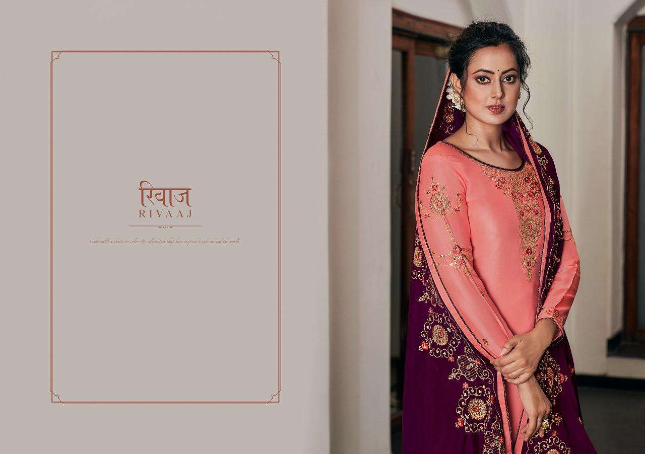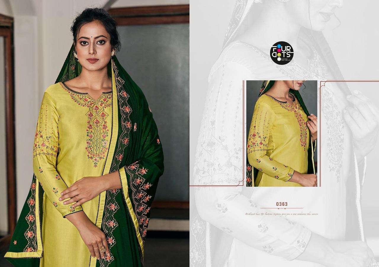 * FOURDOTS  has launched  Catalog name :  * RIVAAJ * Fabric Details Top:- Pure Modal Satin With Heavy Embroidery Work And Sleeve Work Bottom:- Dull Shantoon (Cut=4.25) Dupatta:- Pure Chinon With Heavy Embroidery Work           Total Design:- 4  Rate:-999/- Dispatching 5 to 6 days later |