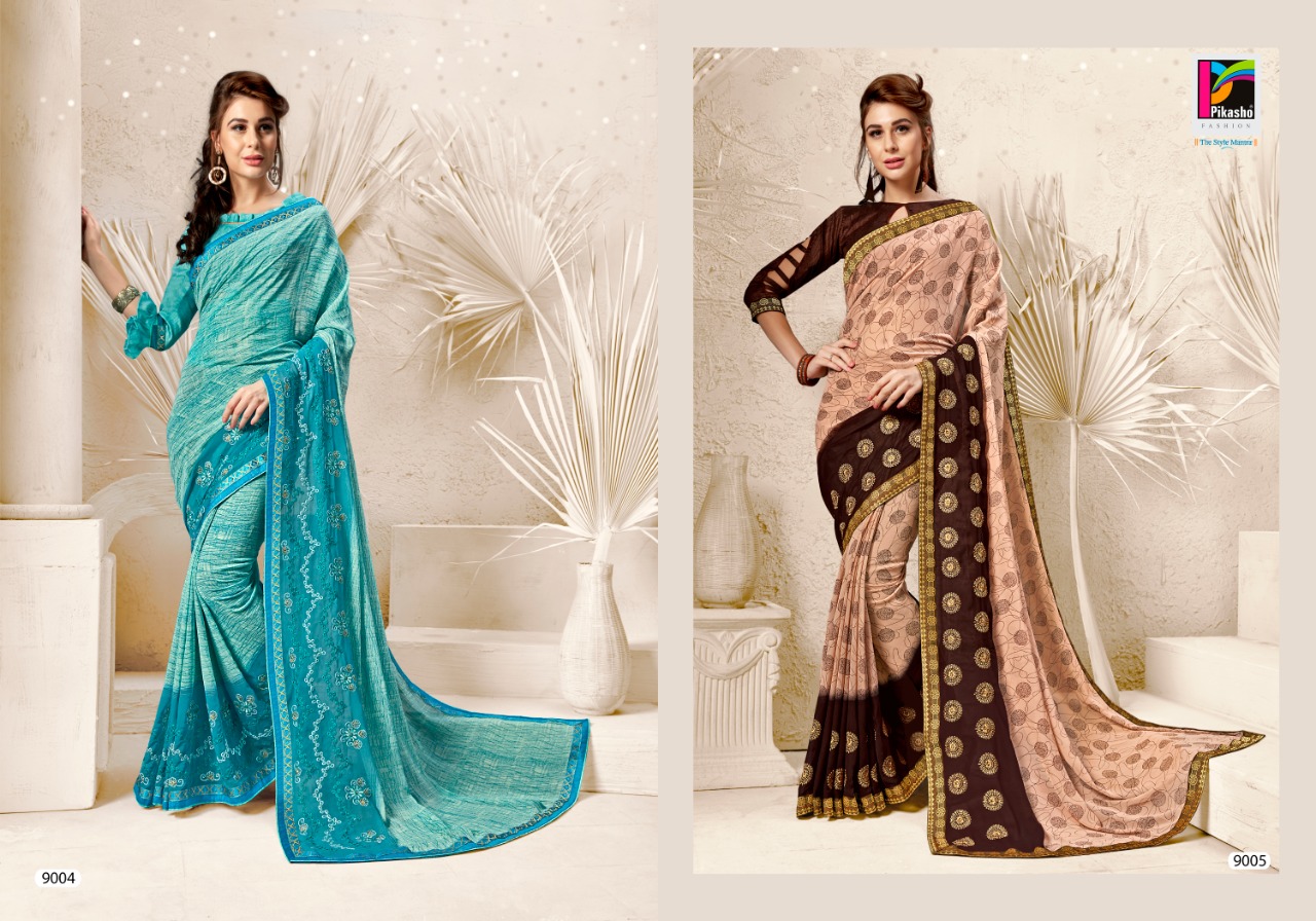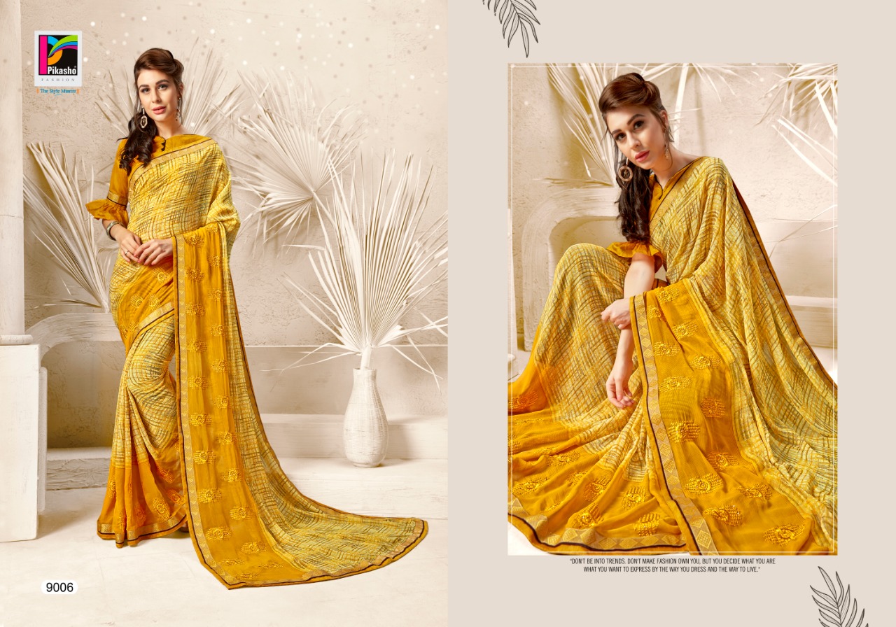 PIKASHO FASHION GLAMOUR FANCY WEIGHTLESS PRINT FANCY EMBOEDRY WORK PCS:-08 RATE:-530/- Set To Set. GST 5 Percent Extra. Delivery from tomorrow |