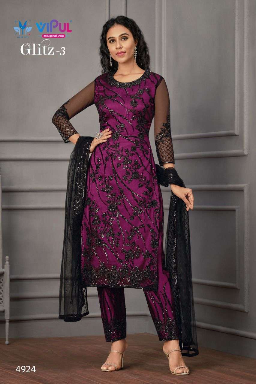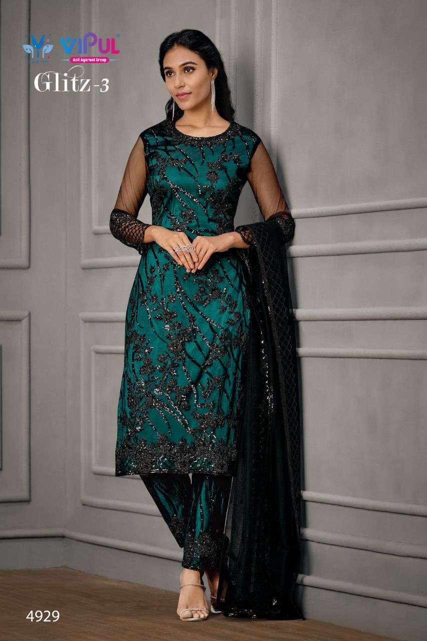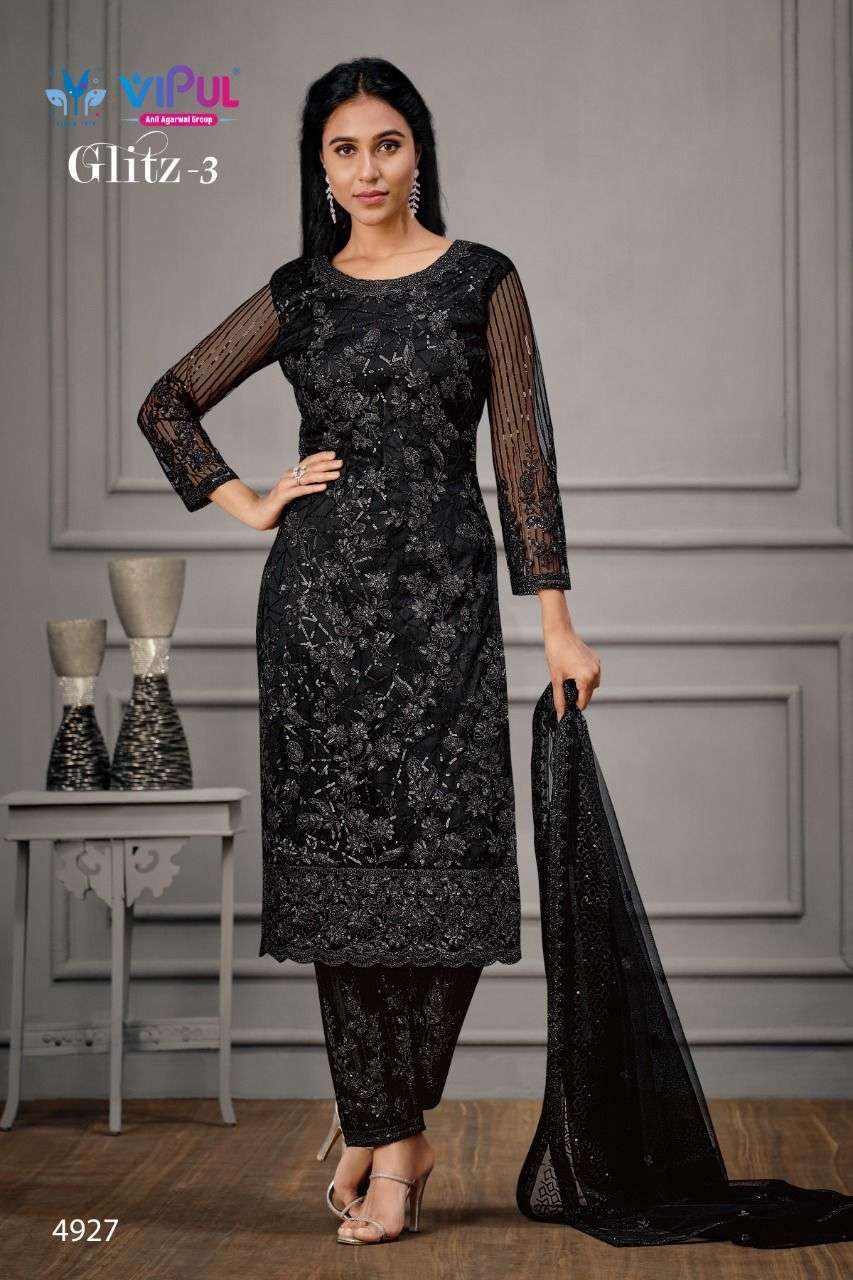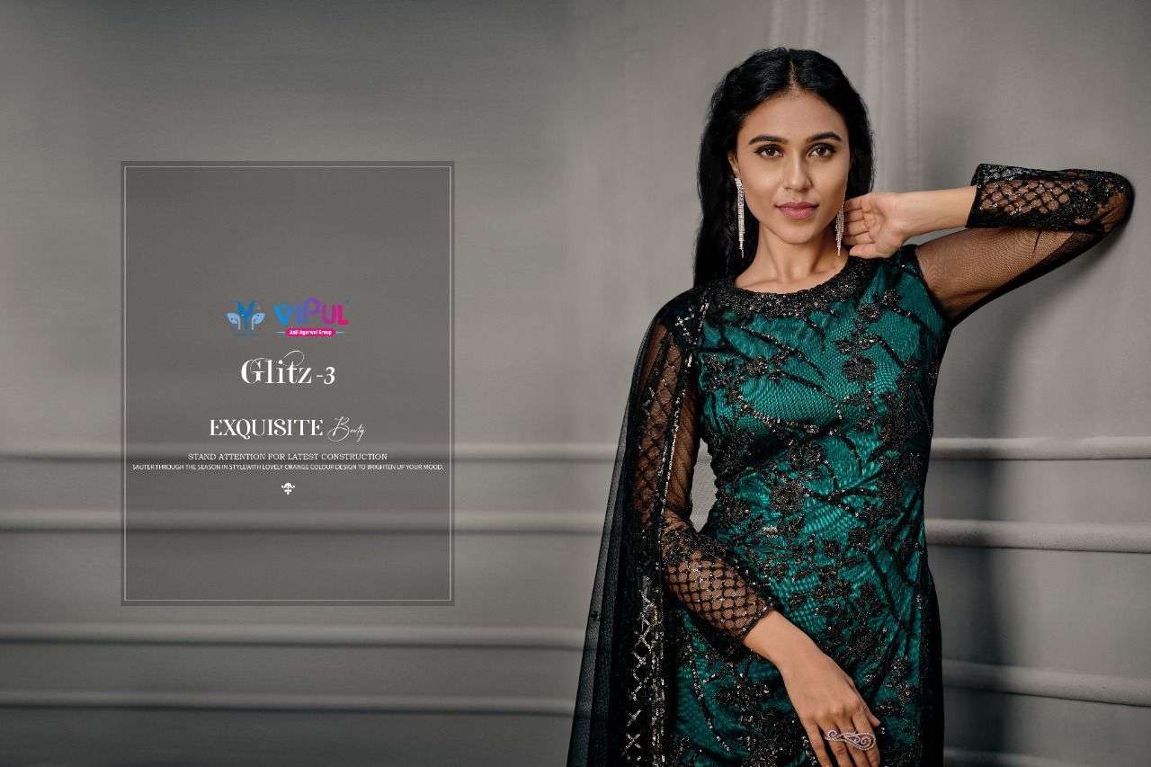 Vipul launching GLITZ-Vol 3 Top - Net, Hand look work with Satin Inner Bottom - Satin with work on net. Dupatta - Net with work. |