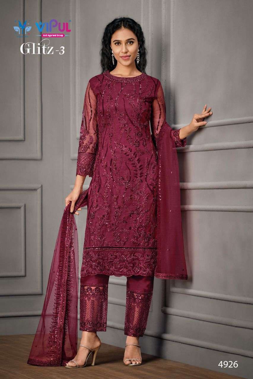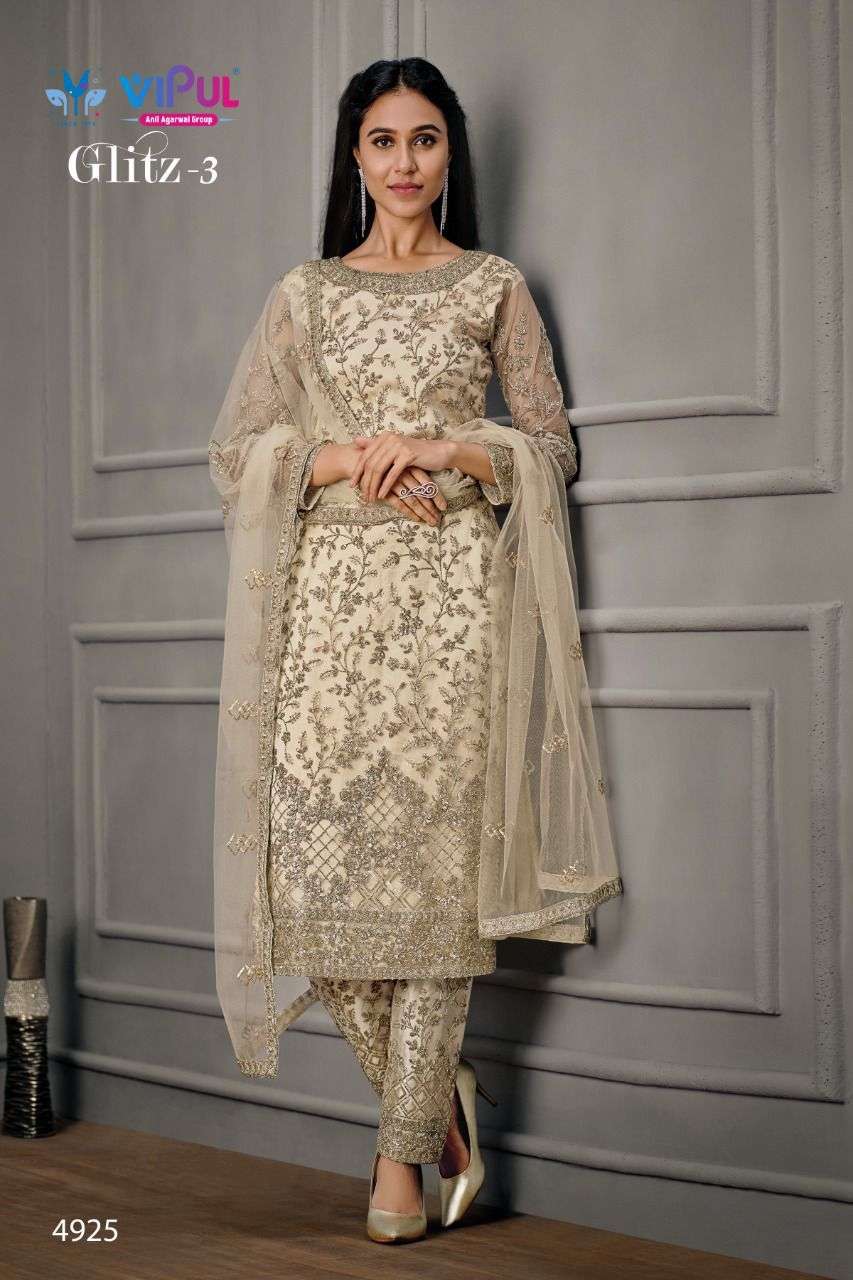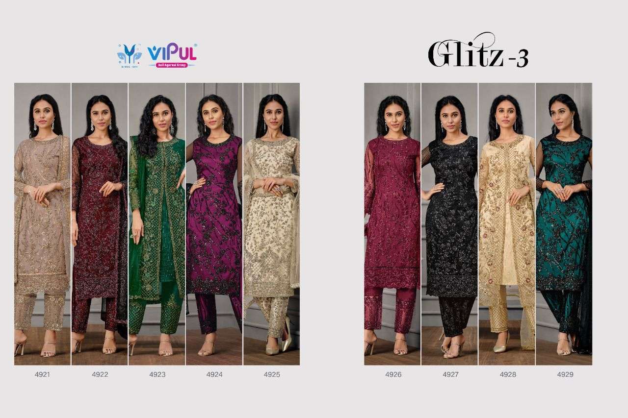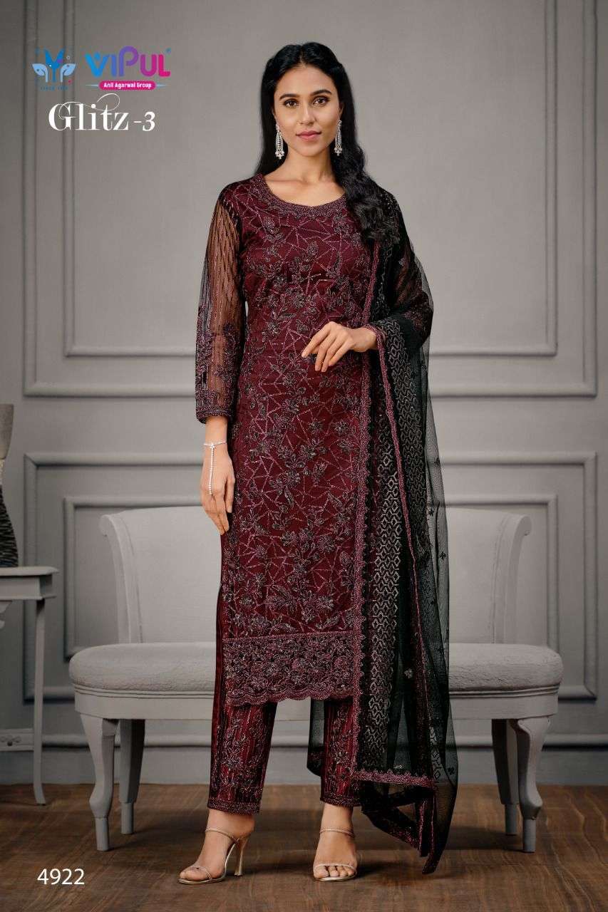 Vipul launching GLITZ-Vol 3 Top - Net, Hand look work with Satin Inner Bottom - Satin with work on net. Dupatta - Net with work. |