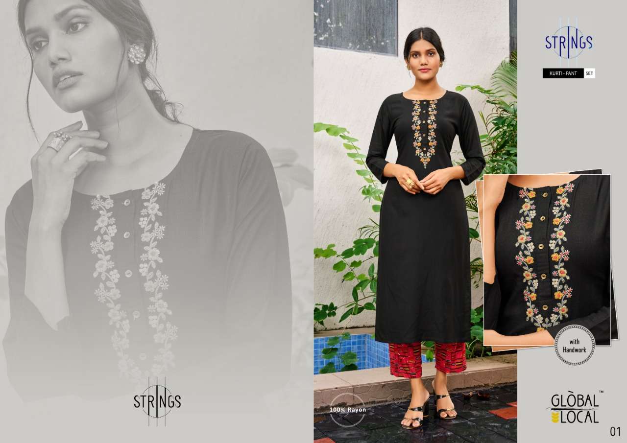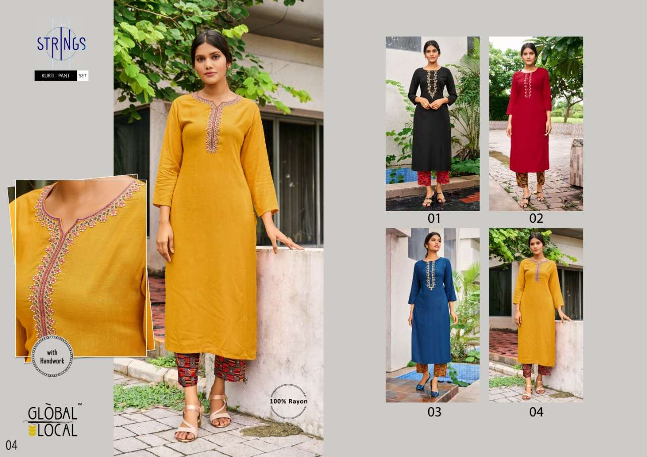 Catalog : STRINGS Style : Kurti + Pant Combo set BRAND : GLOBAL LOCAL⢠TYPE :  Handwork Embroidered kurtis in 100% rayon with foil printed pants SIZES : M to 2XL RATE : 725/-(Kurti with pants) Pieces:  4 per Bag |