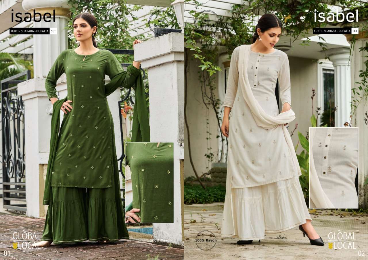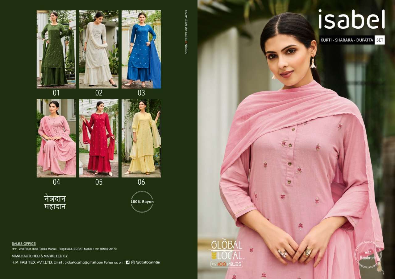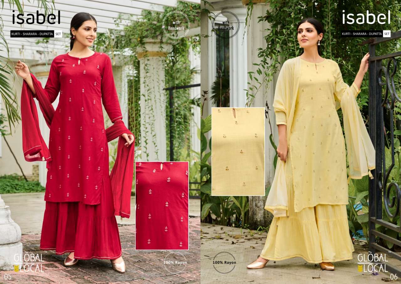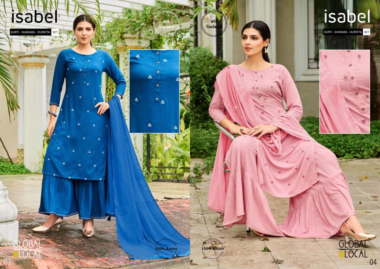 Catalog : ISABEL with sharara & dupatta 3 piece readymade set BRAND : GLOBAL LOCAL⢠TYPE :  Embroidered kurtis with handwork in 100% slub rayon with sharara & crinkled dupatta SIZES : S to 2XL RATE : 935/-(with sharara & dupatta) Pieces:  6 per Bag |