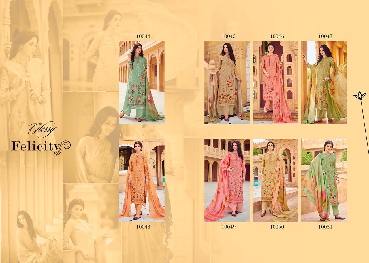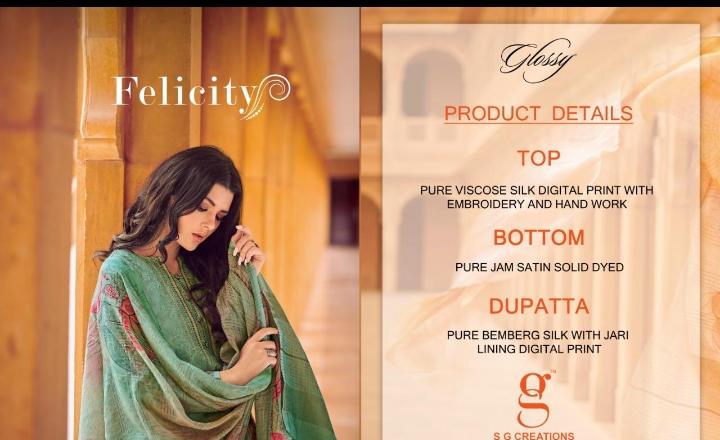 [12:01 PM, 9/13/2019] Rohit Bhaiya: Brand - Gloosy Catlog name - FELICITY. Rate -1795 per pcs . Set to set. GST 5 Percent Extra. Delivery 4-5 days |