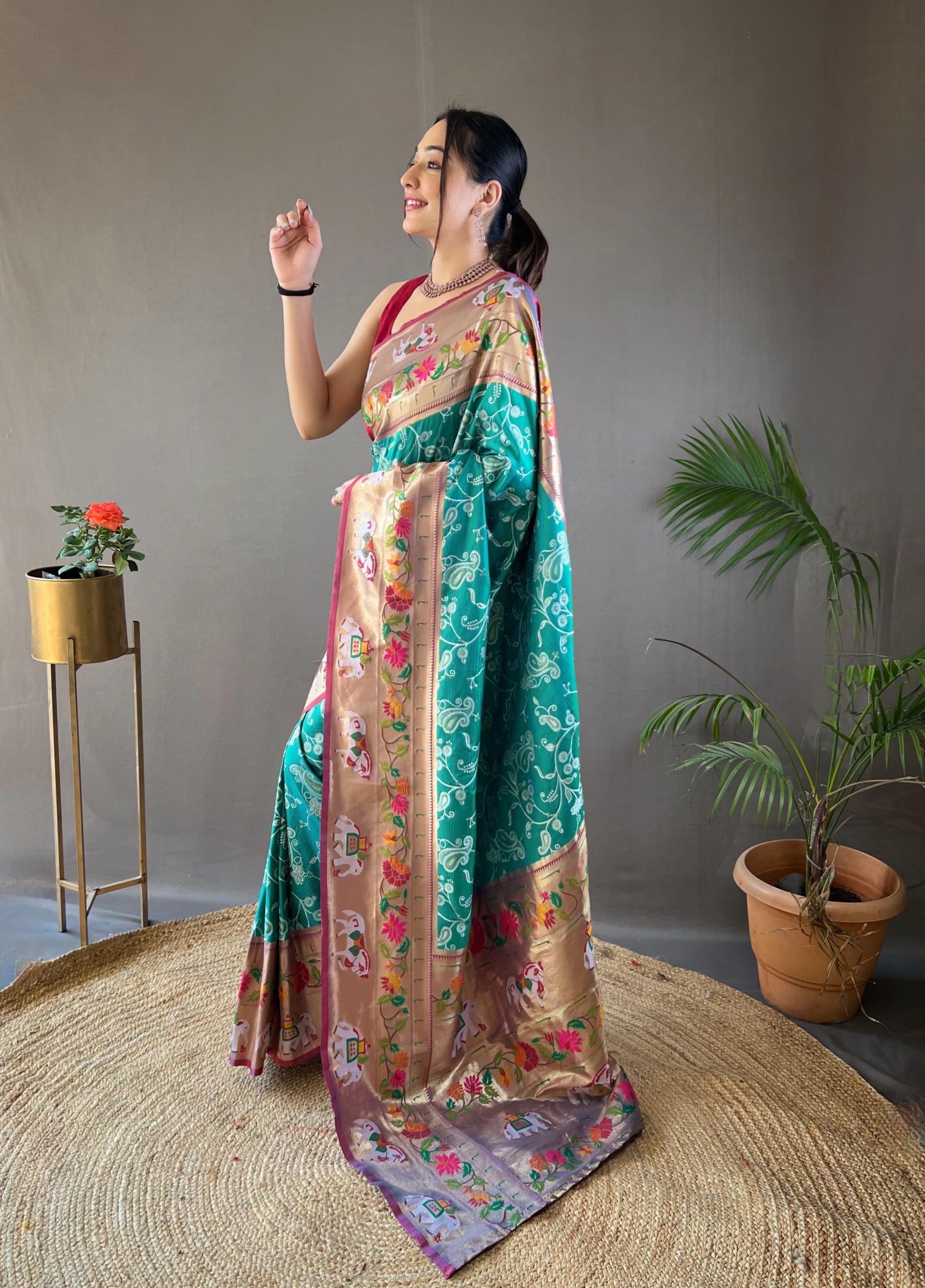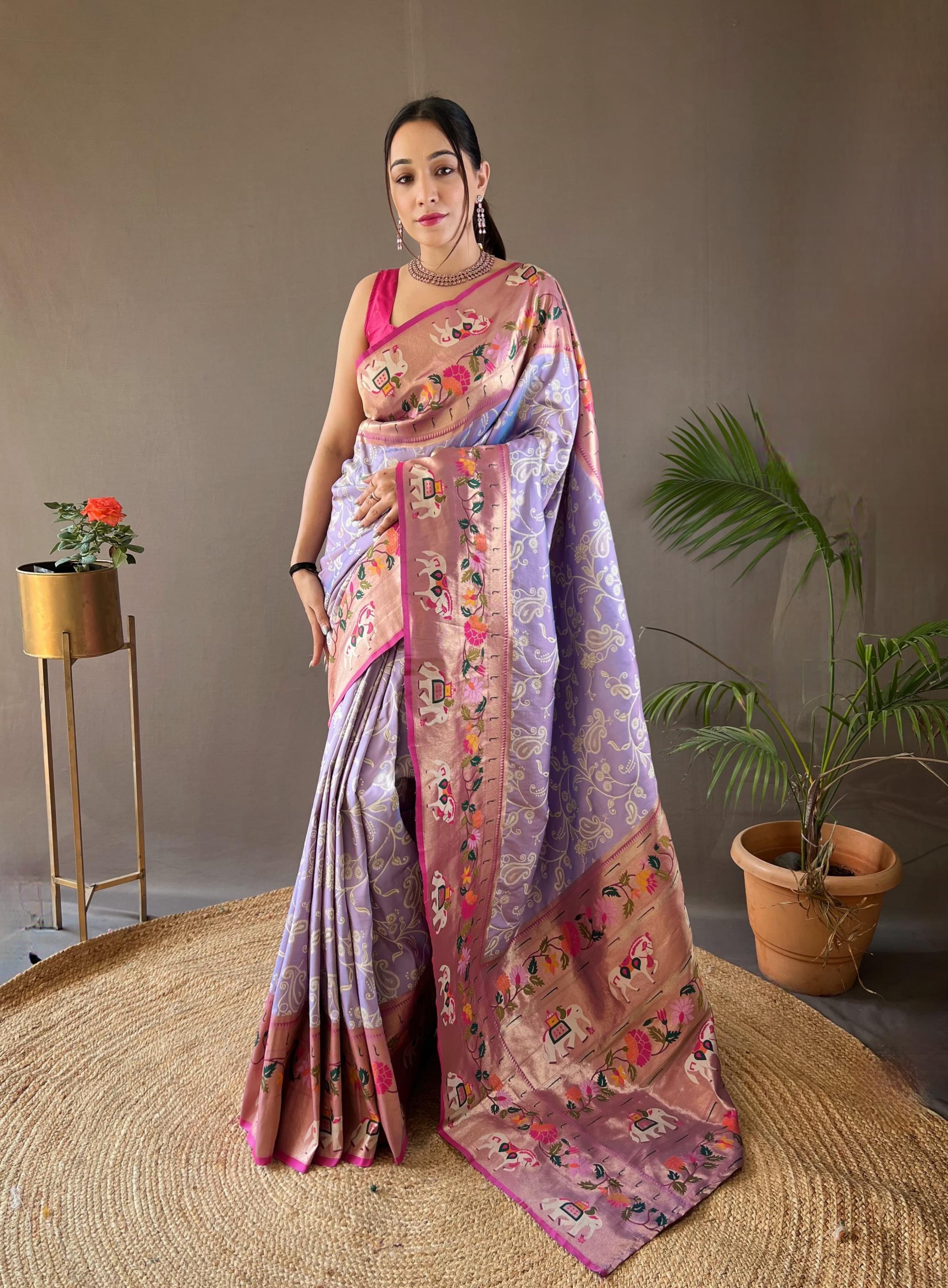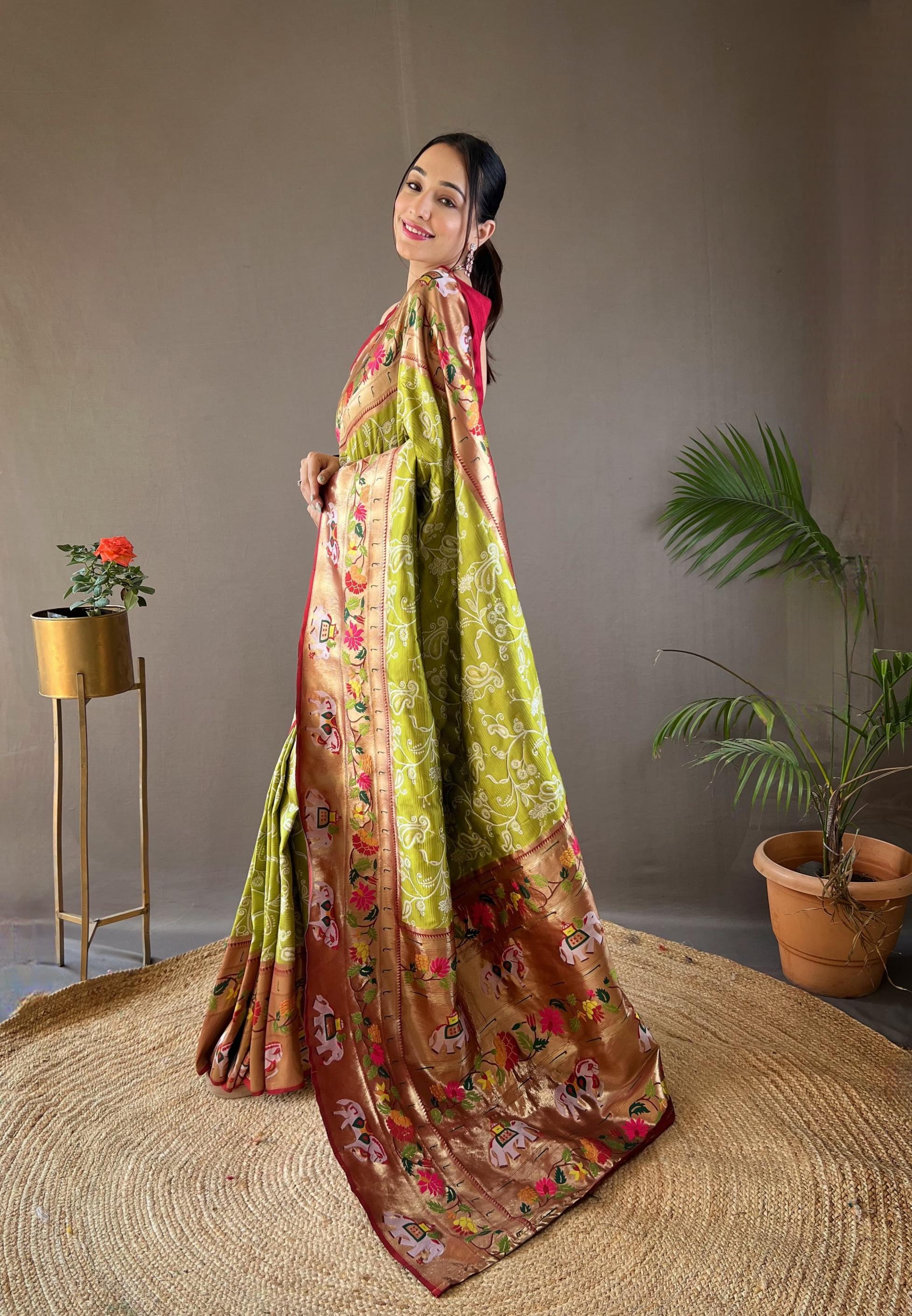 FRESH ARRIVAL❤️ CATALOG: Godavari Beautiful Lucknowi Concept weaving saree with Paithani and Patola fusion Taste with rich Meenakari pallu and elegant border having Natural Concept with rich Golden Zari Blend along with contrast blouse. Price : 1599/- |