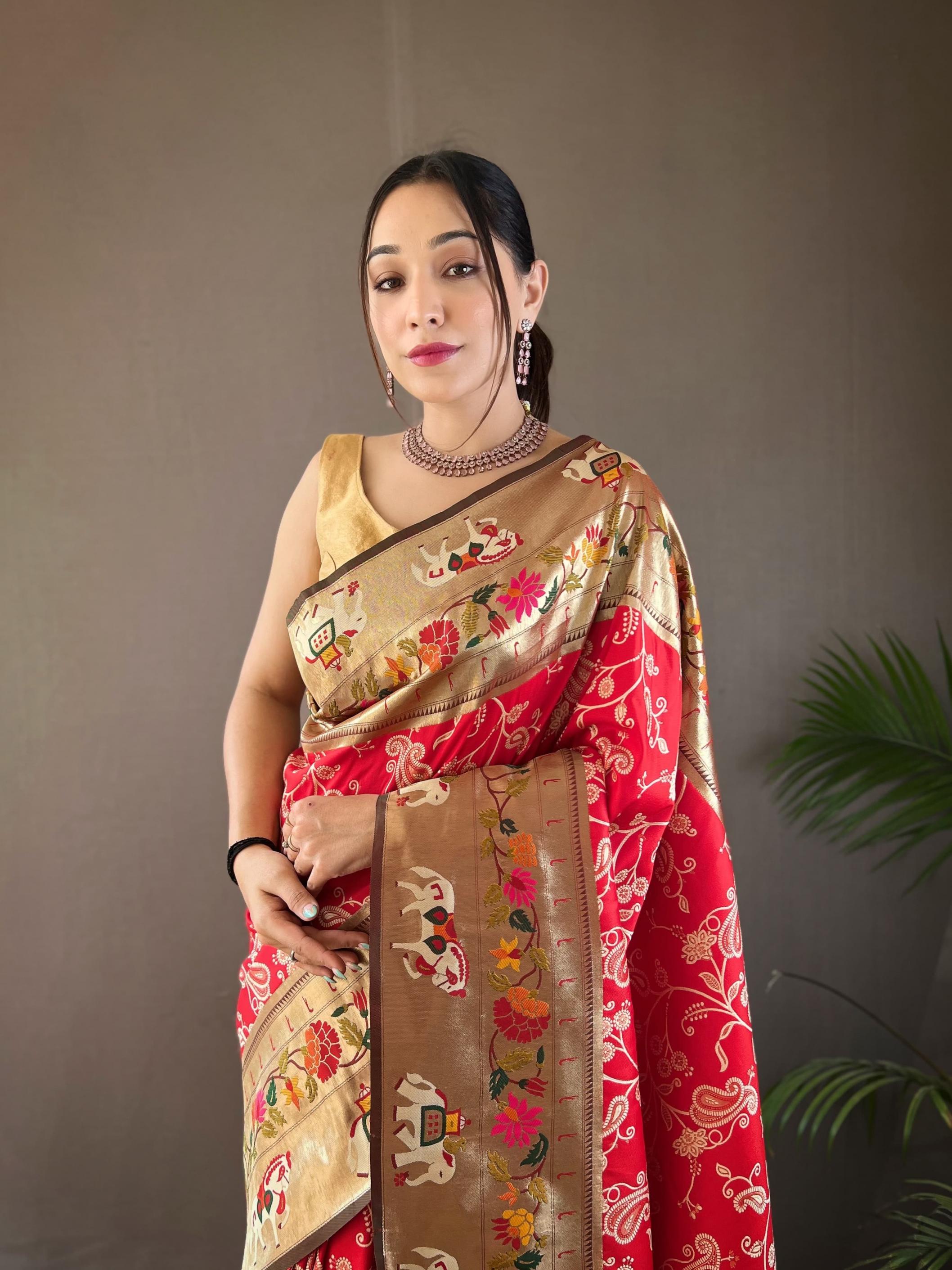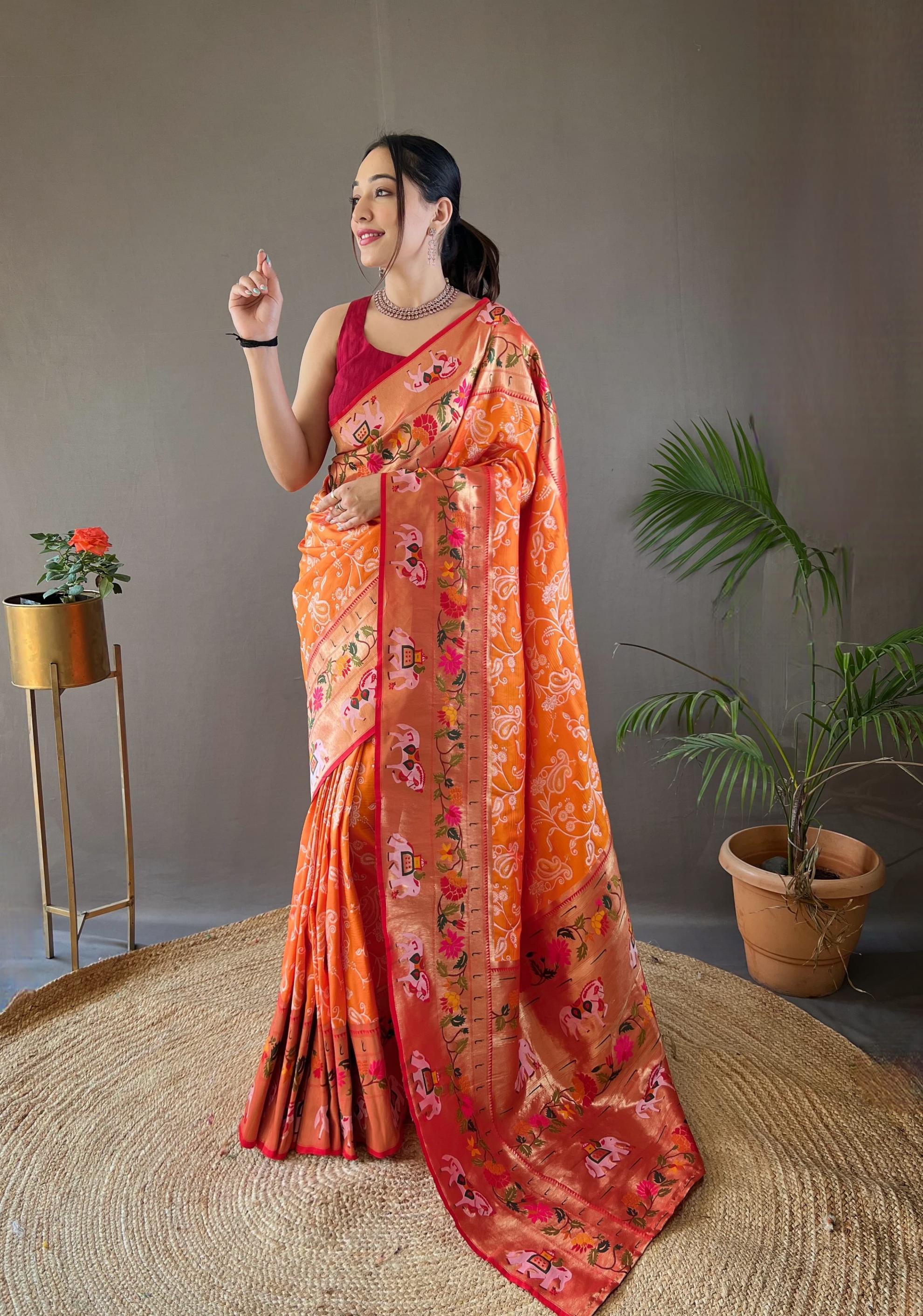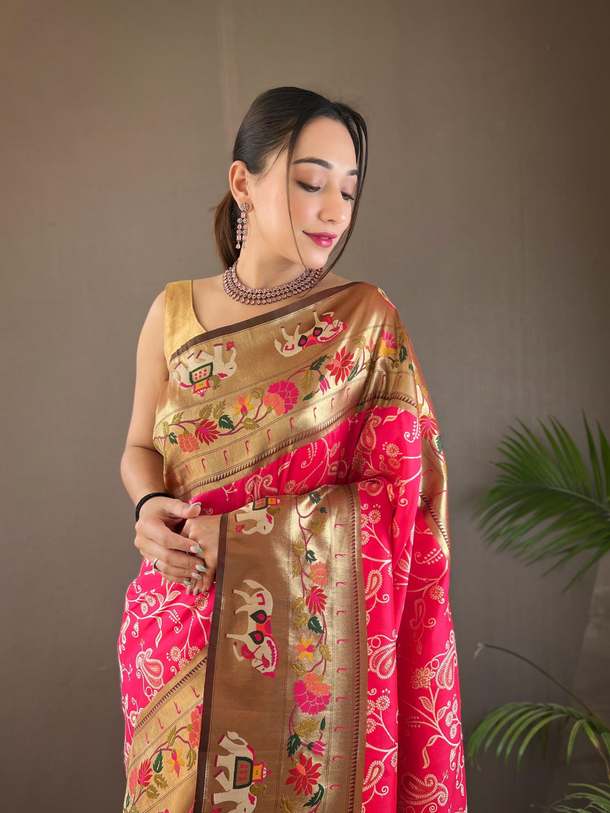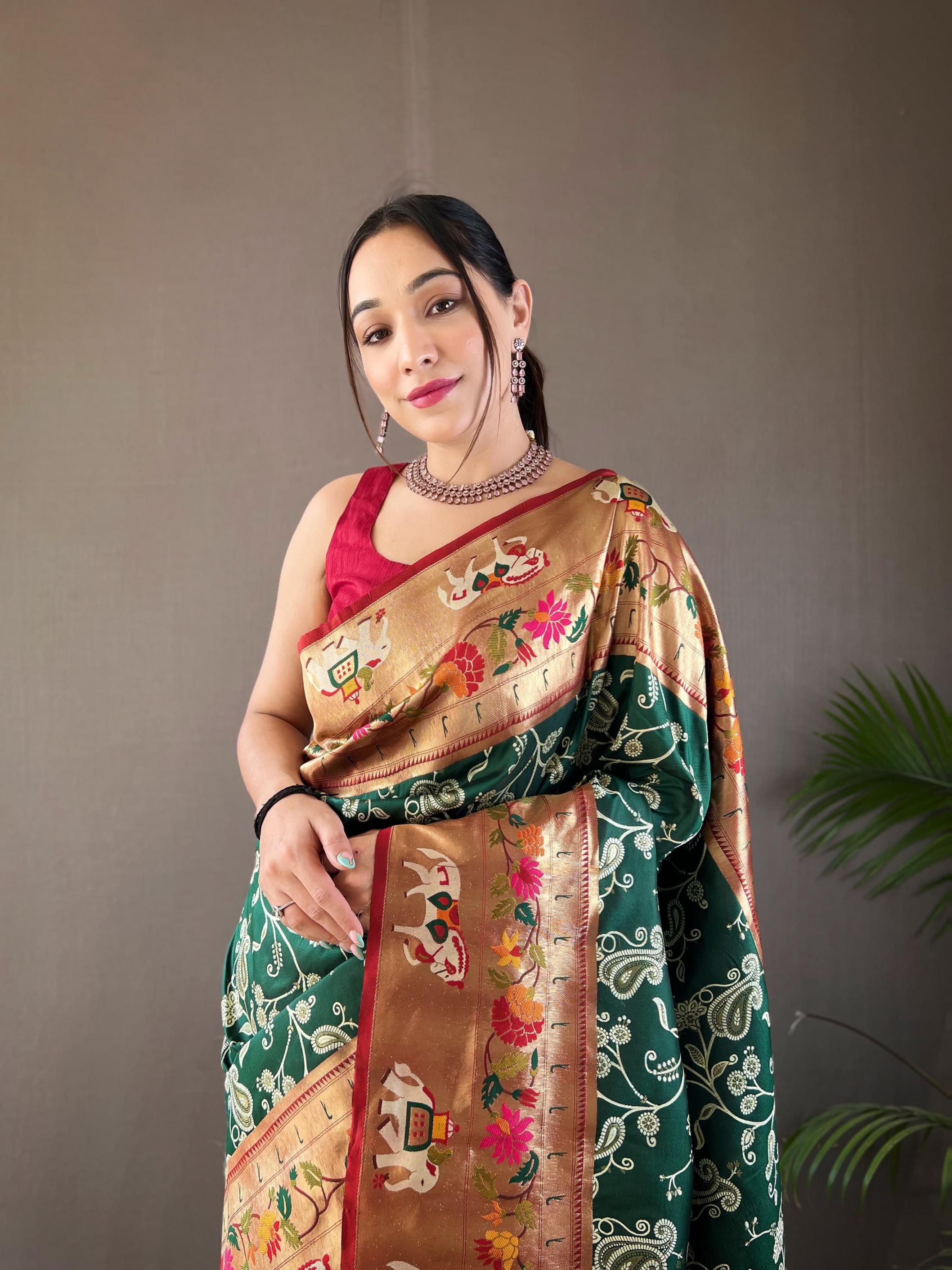 FRESH ARRIVAL❤️ CATALOG: Godavari Beautiful Lucknowi Concept weaving saree with Paithani and Patola fusion Taste with rich Meenakari pallu and elegant border having Natural Concept with rich Golden Zari Blend along with contrast blouse. Price : 1599/- |