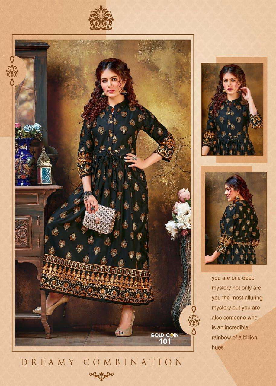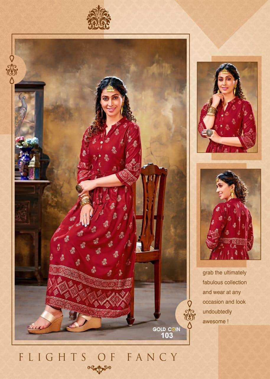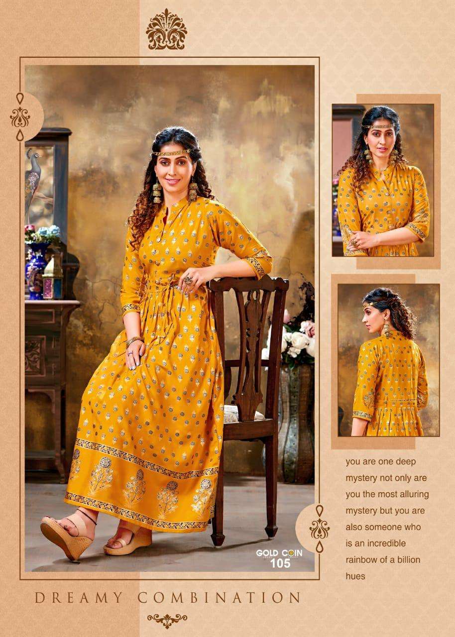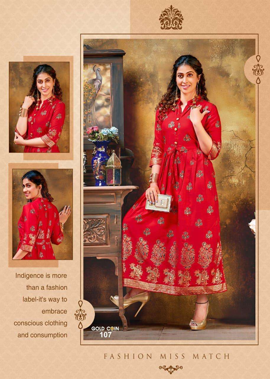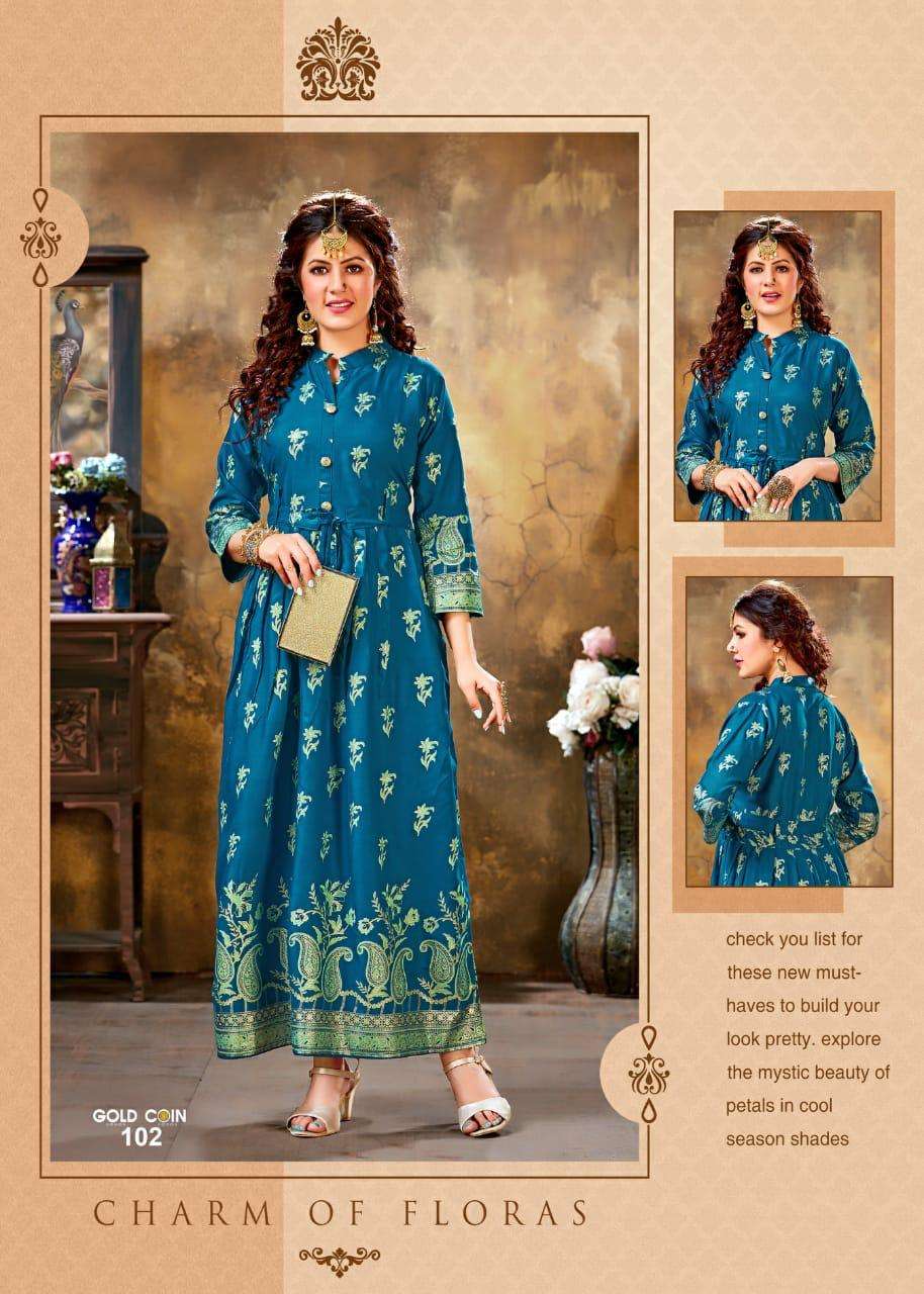 gold coin by fashion talk heavy rayon kurti catlog wholesaler in surat inida