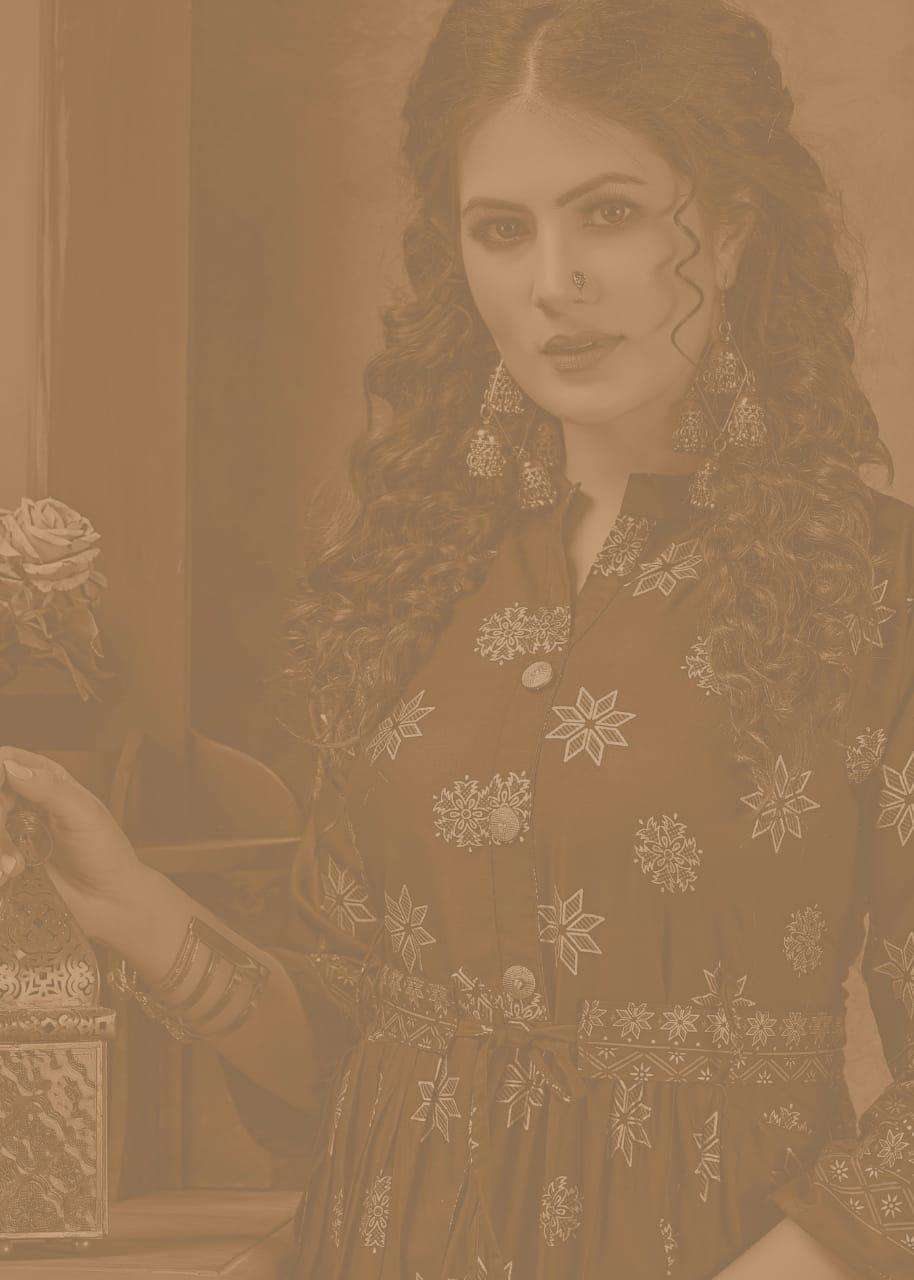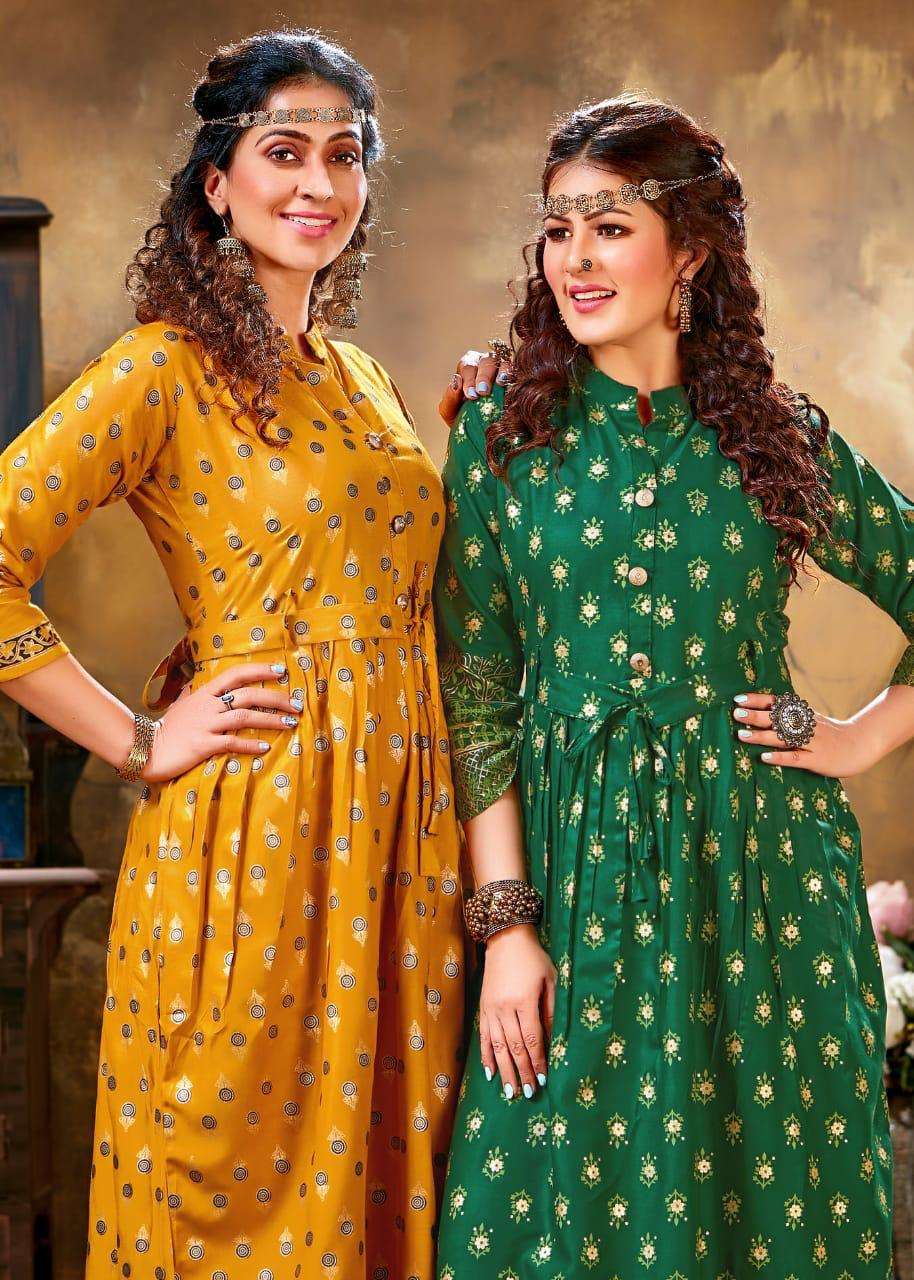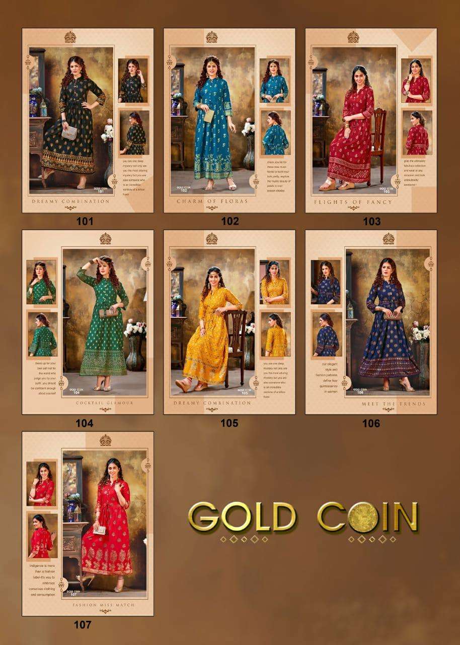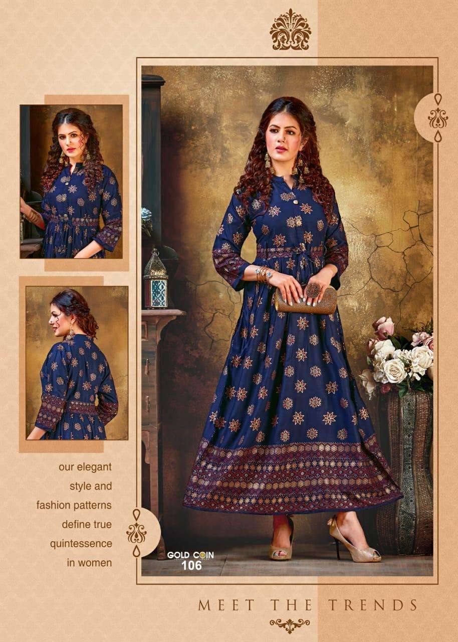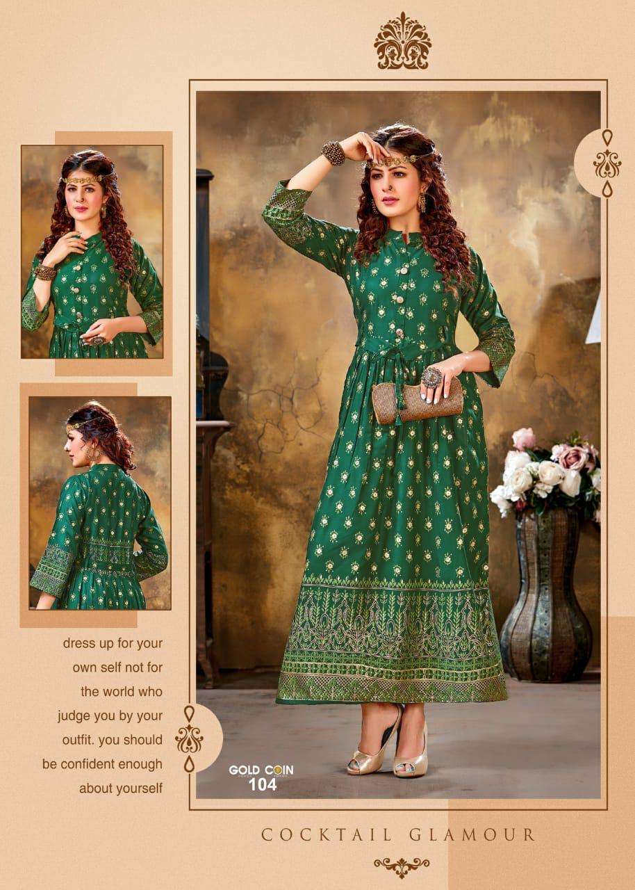 gold coin by fashion talk heavy rayon kurti catlog wholesaler in surat inida