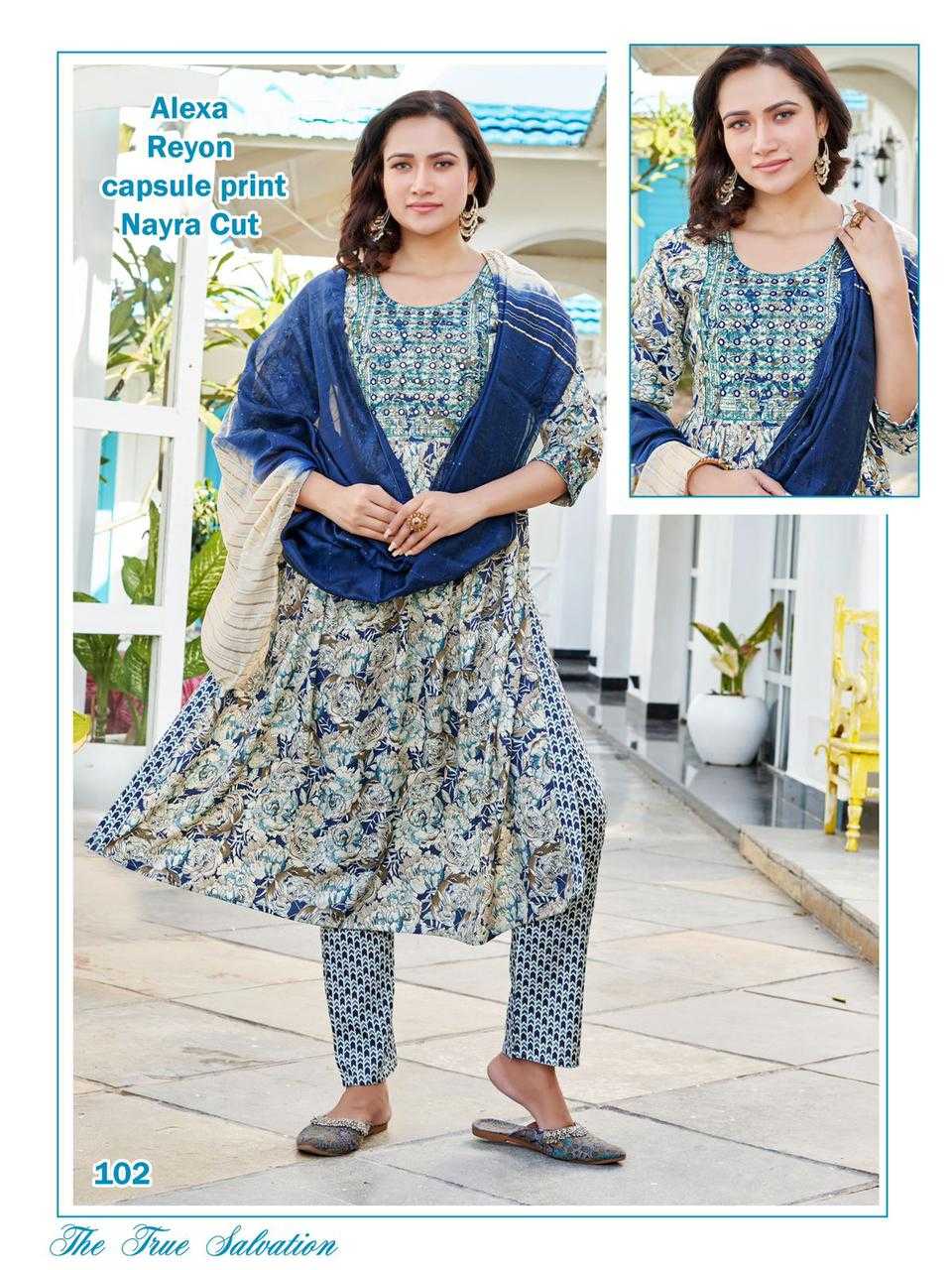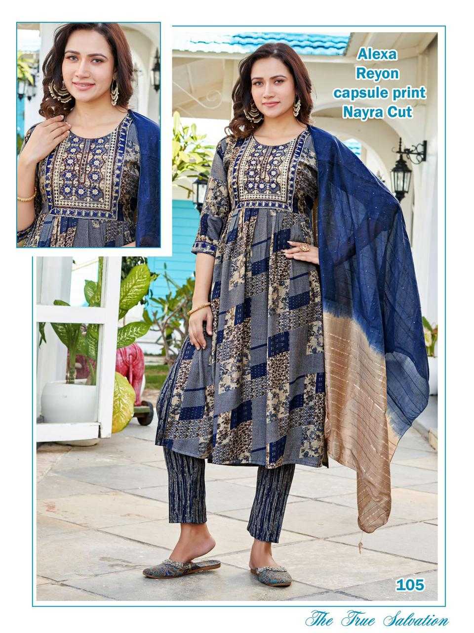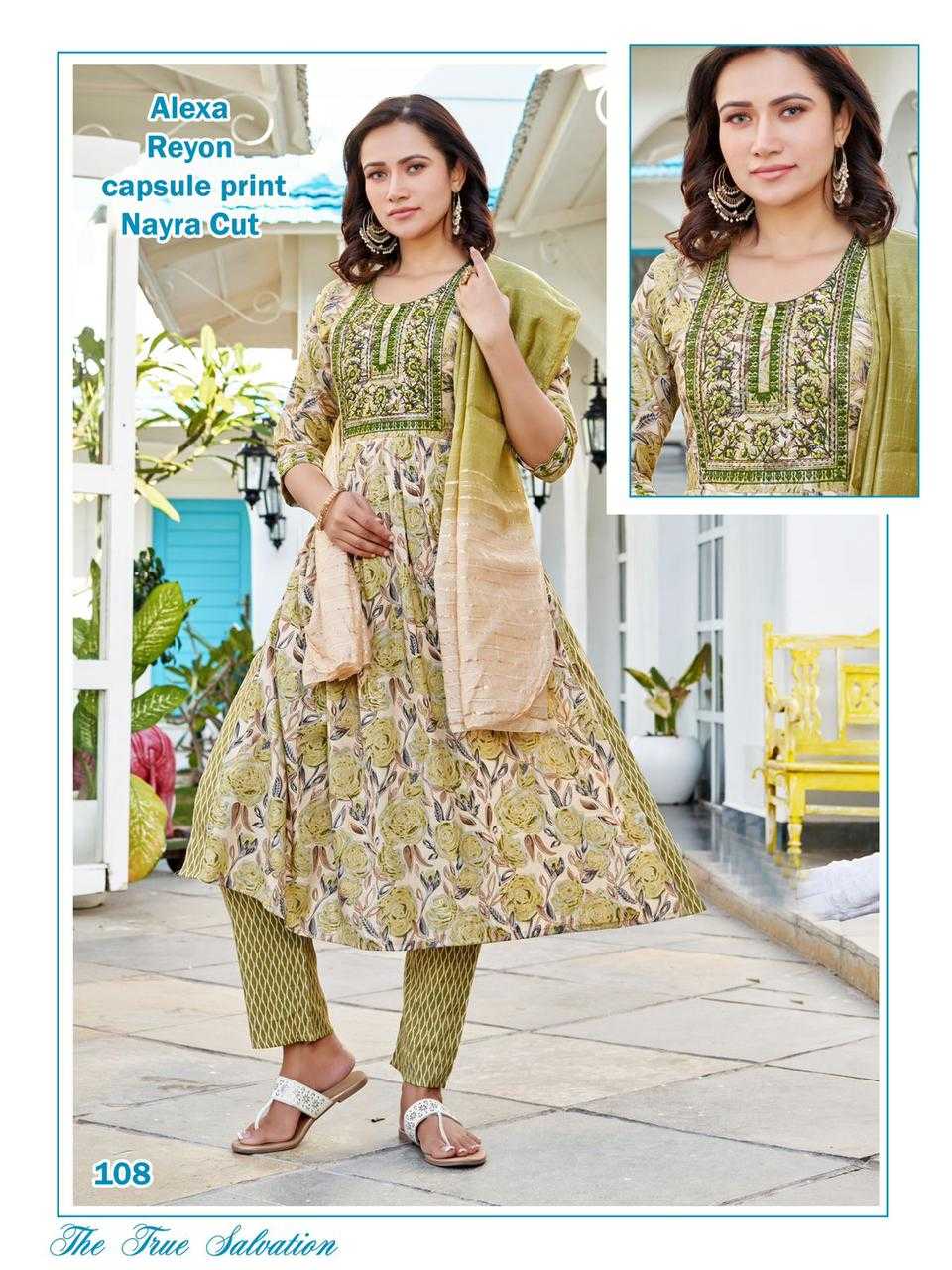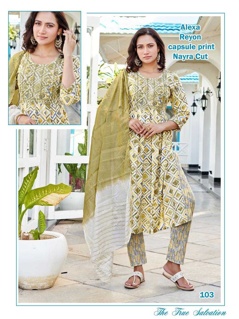 Golden Alexa Capsule Foil Print Nayra Pattern READYMADE SUIT CATALOG WHOLESALER BEST RATE