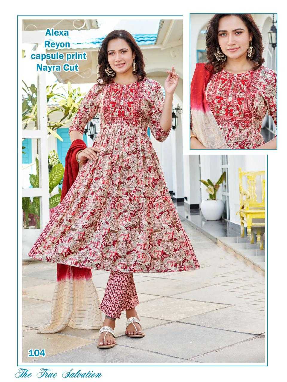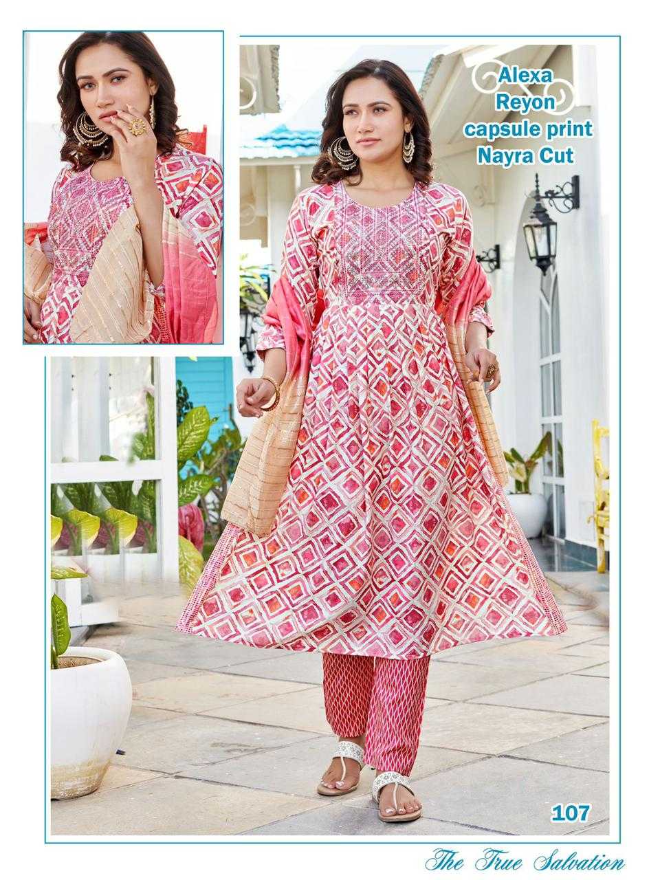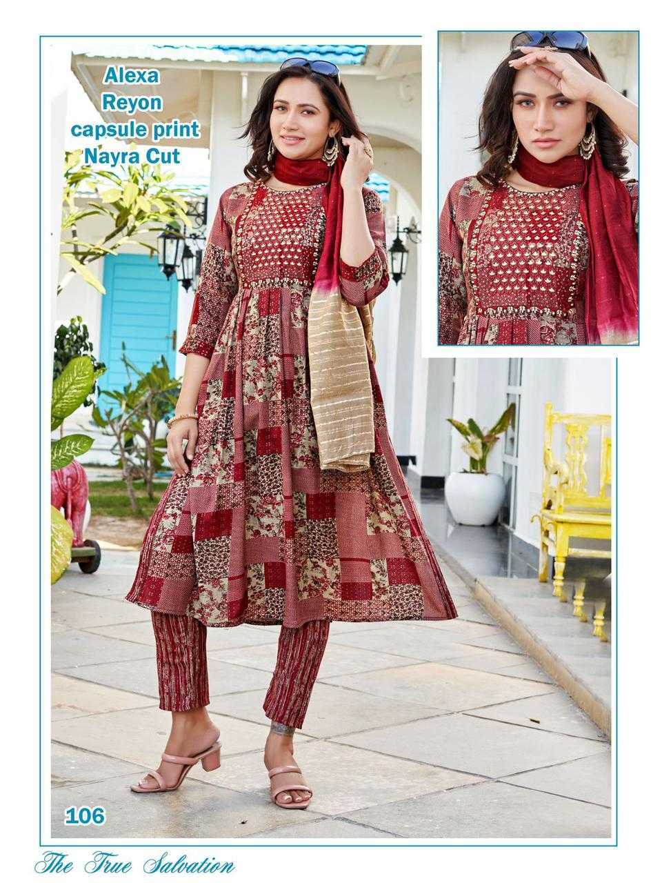 Golden Alexa Capsule Foil Print Nayra Pattern READYMADE SUIT CATALOG WHOLESALER BEST RATE
