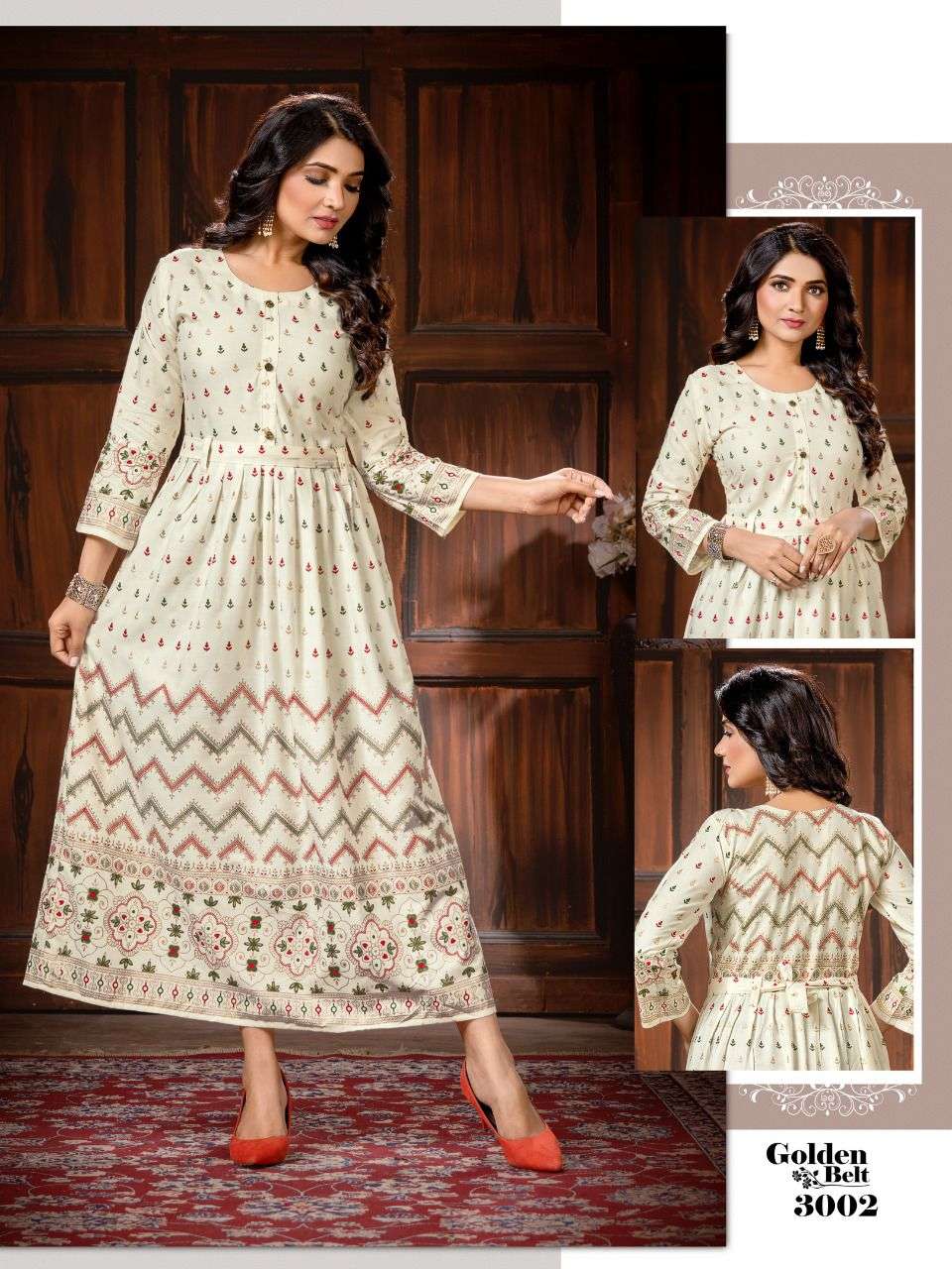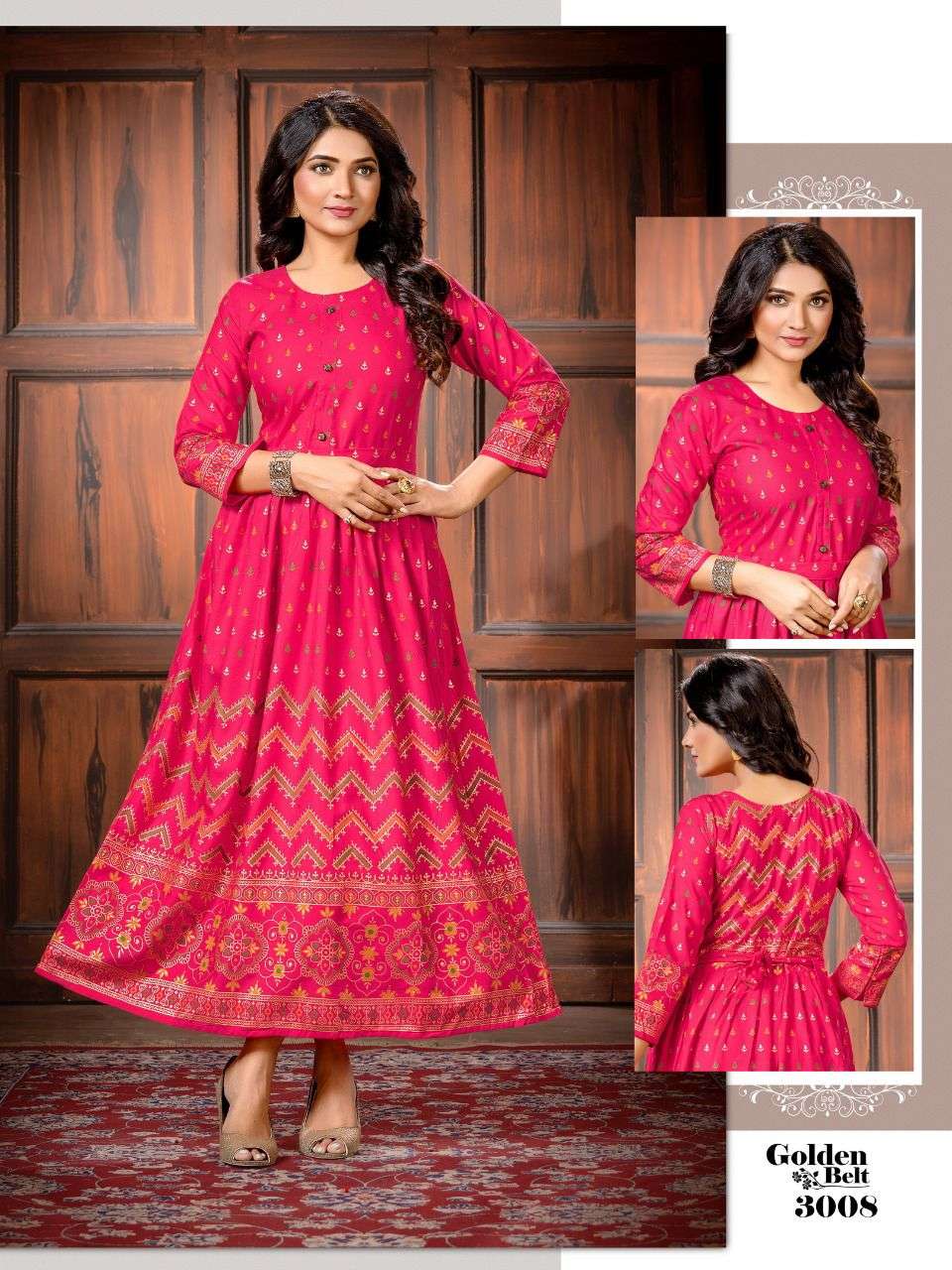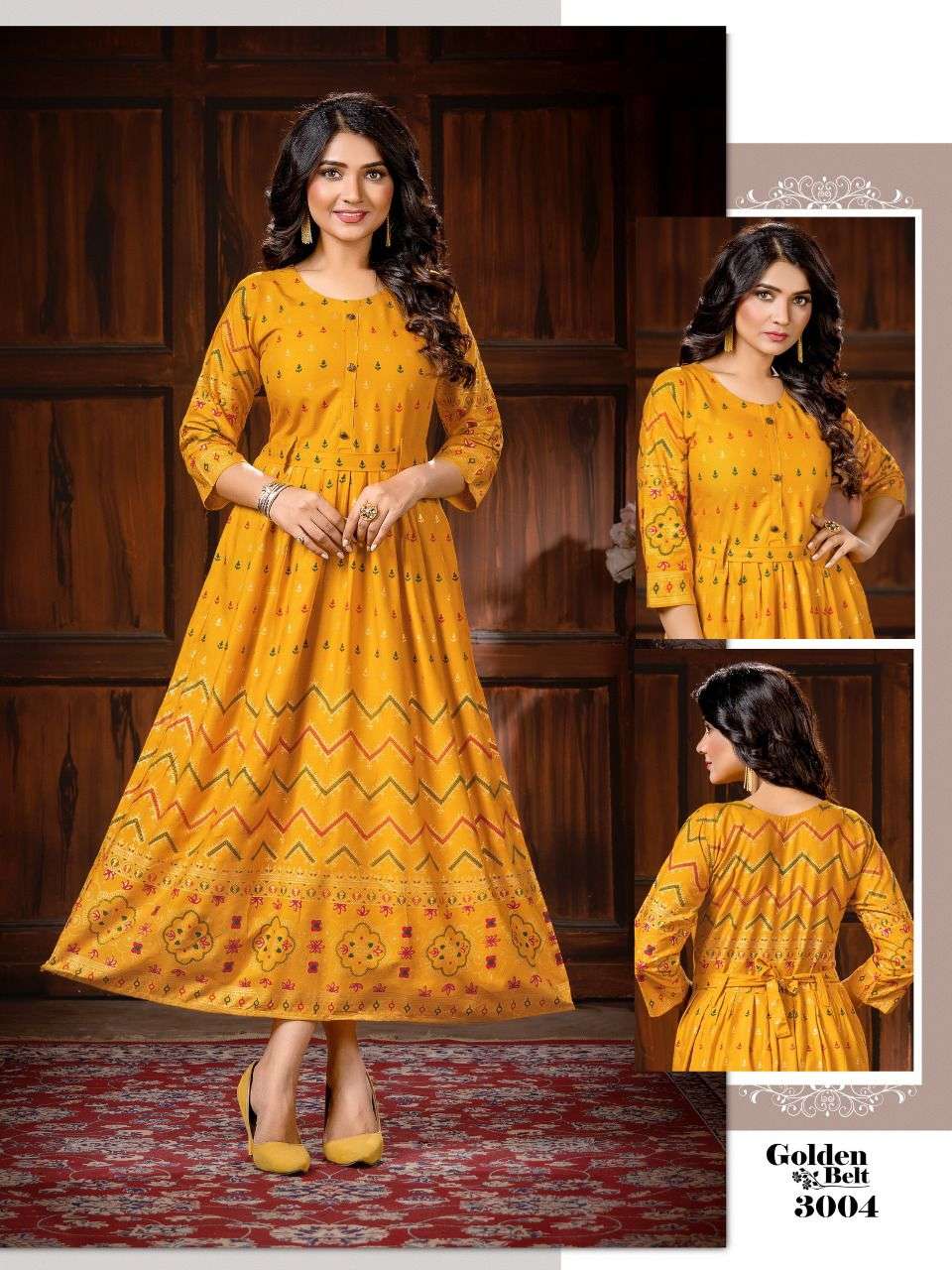 GOLDEN BELT Heavy Reyon plain 14kg with Gold Foil Print KURTI CATALOG WHOLESALER BEST RATE