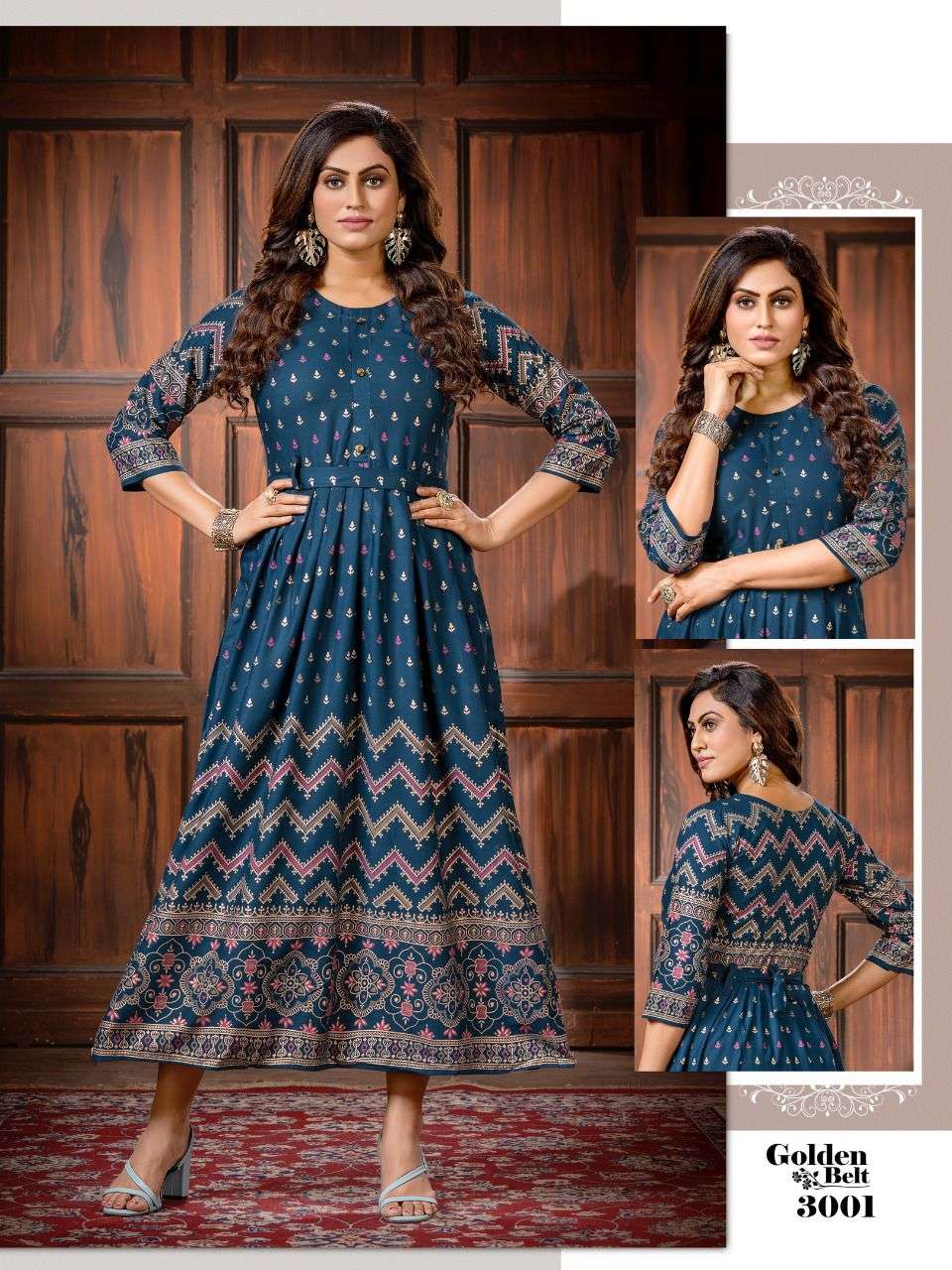 📕Catalogue:- GOLDEN BELT 👗cloth :- Heavy Reyon plain 14kg with Gold Foil Print ✅concept :- Flair Gown Size:- XXL,3XL AVAILABLE 9 DESIGNS CATALOGUE 🚛 : Dispatch :- dispatch ready Rate :- 499/- Always with you...👍 |