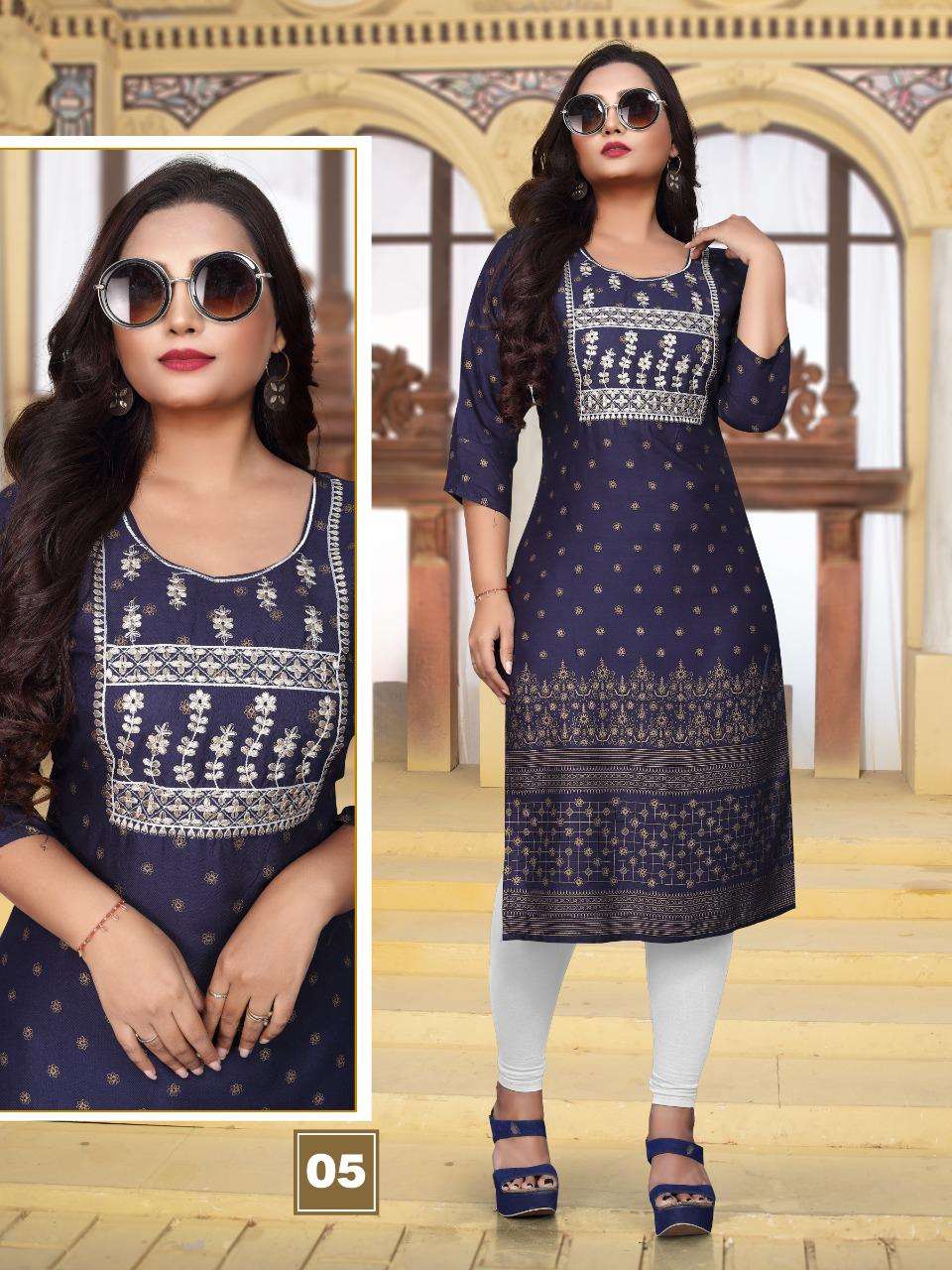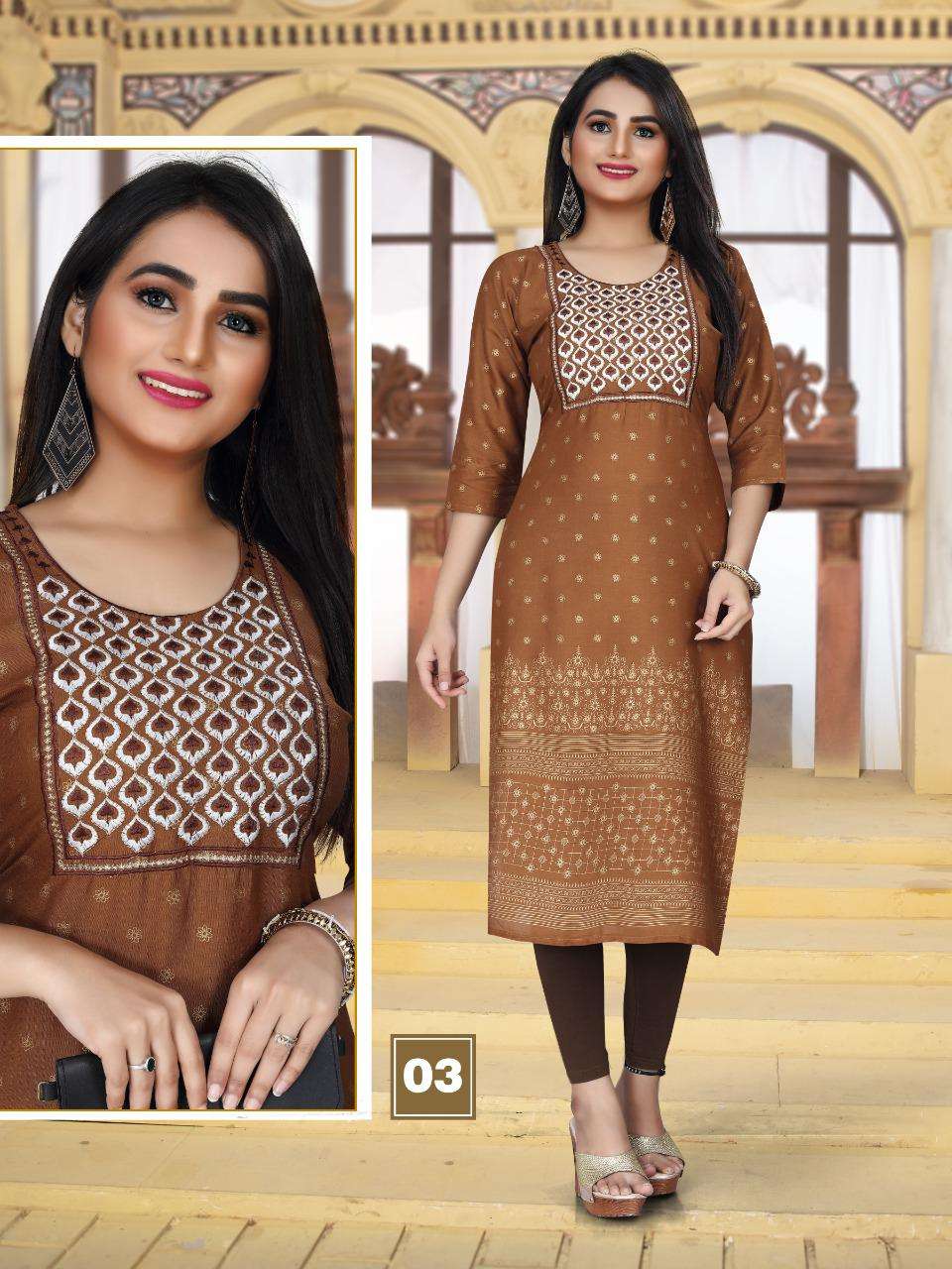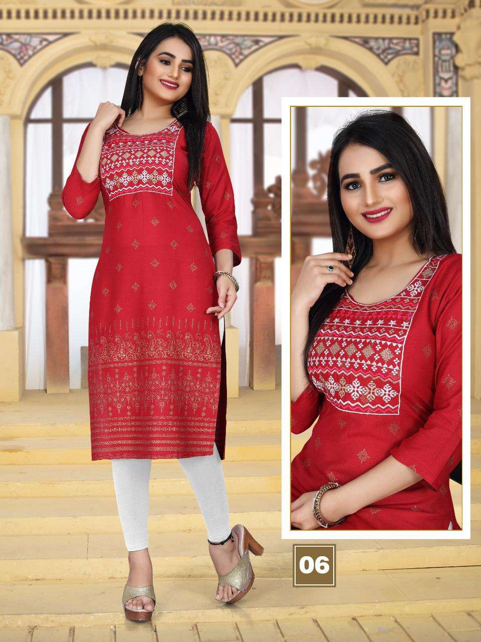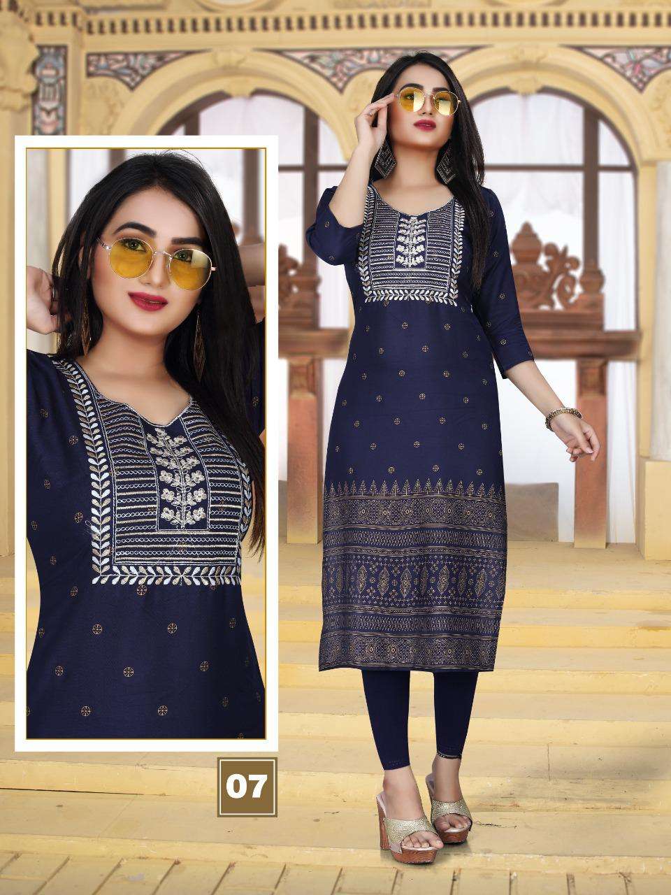 GOLDEN KESARIYA 7 HEAVY RAYON WORK WITH FOIL KURTI CATLOG WHOLESALER BEST RATE