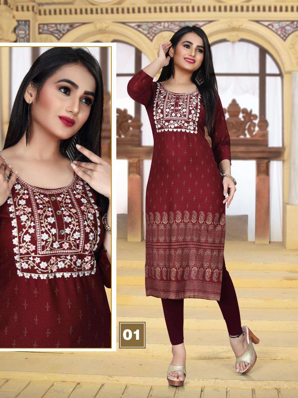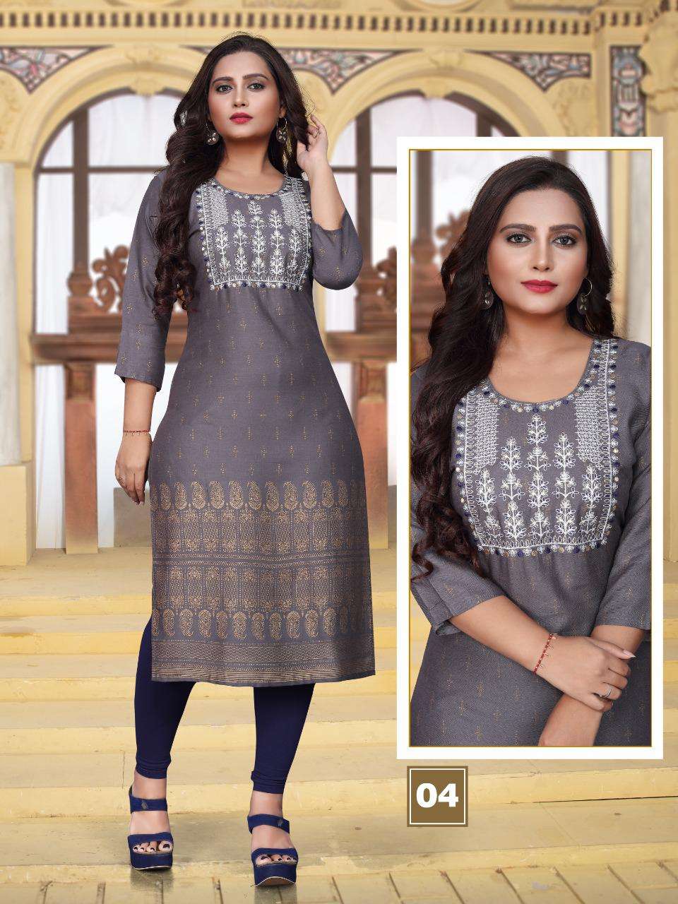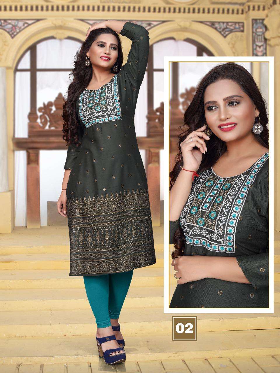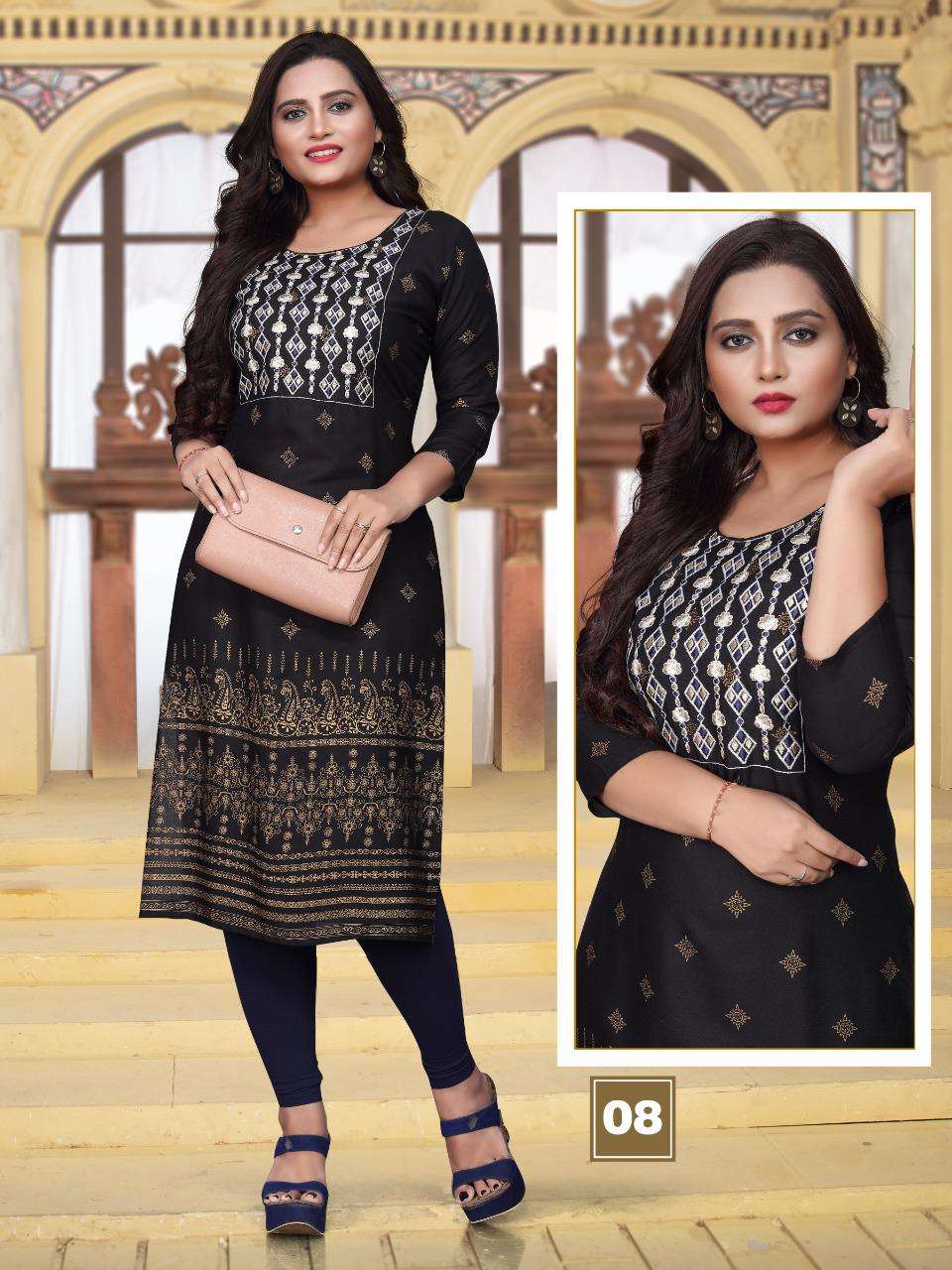 GOLDEN KESARIYA 7 HEAVY RAYON WORK WITH FOIL KURTI CATLOG WHOLESALER BEST RATE