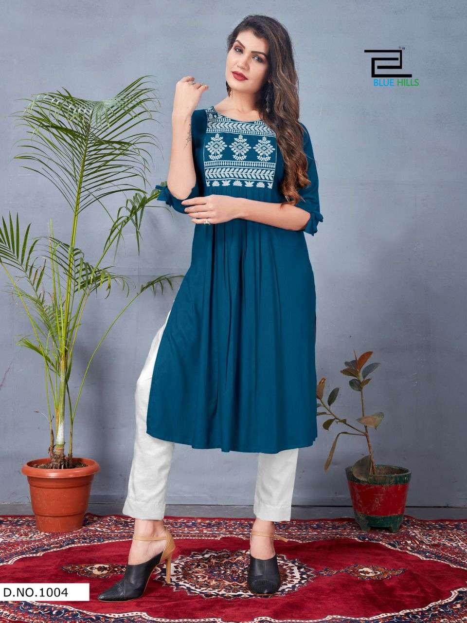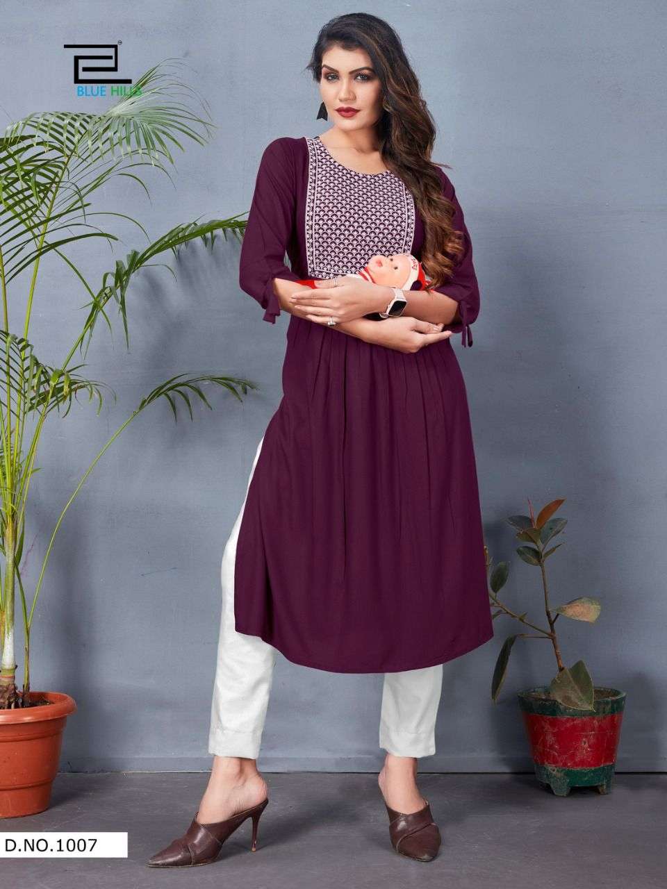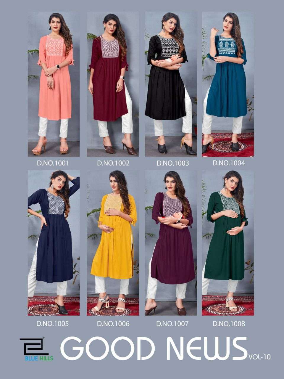 blue hills present ( Feeding top ) ( Twin vertical Zip ) Name:-.  Good news vol-10 Fabric.  : Rayon 14kg Concept:- Embroidery work        Style.    : * Nayra cut* Sleeves. : 3/4 sleeves Length.  : 45 (Approx) Sizes    : L (40) XL (42) XXL (44) Rate - 445+GST Designs  : 8 |