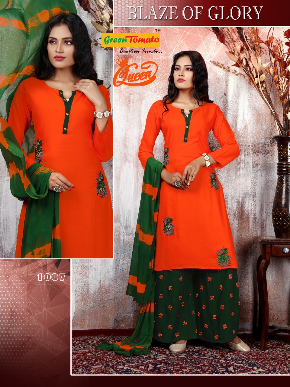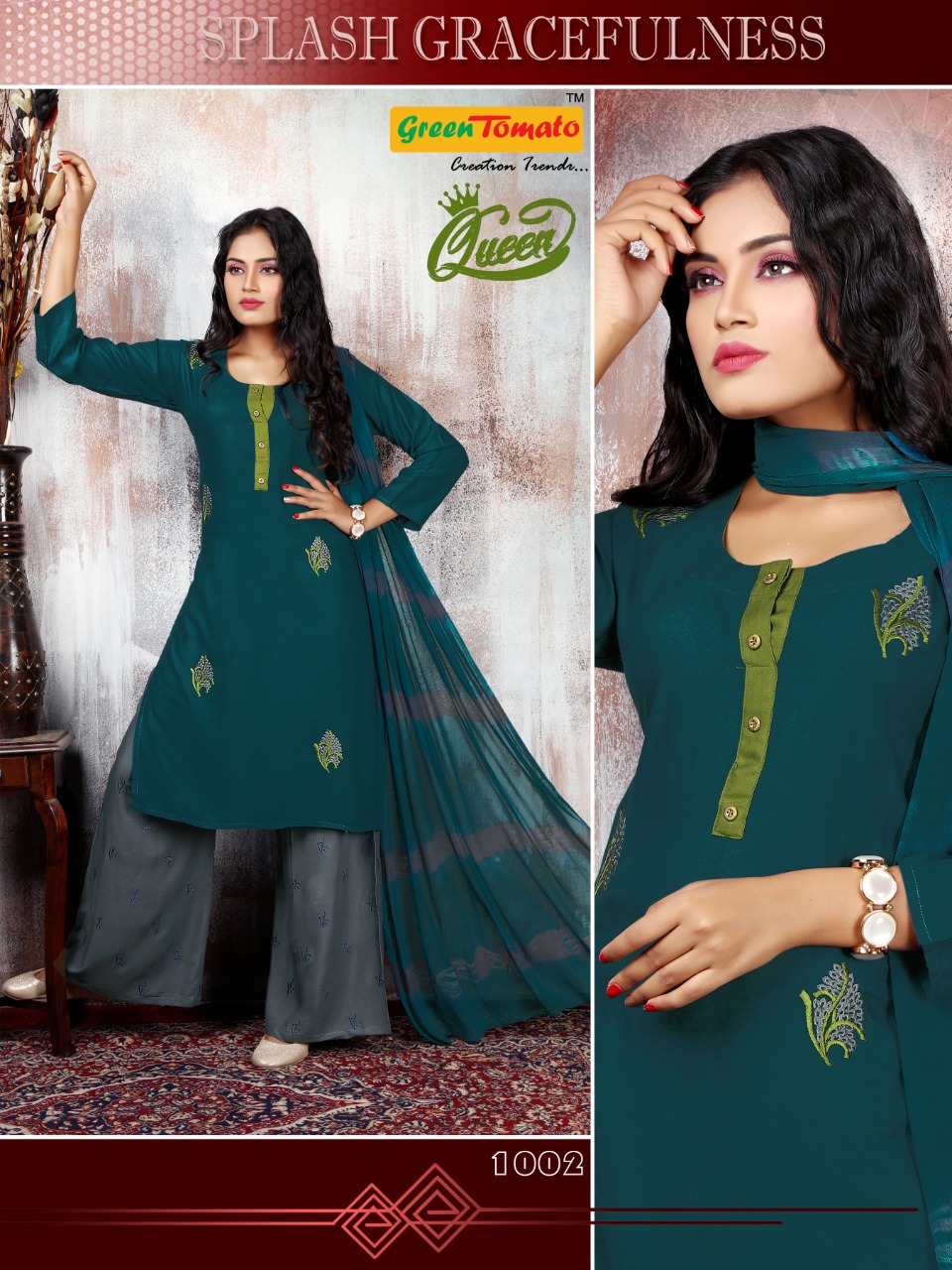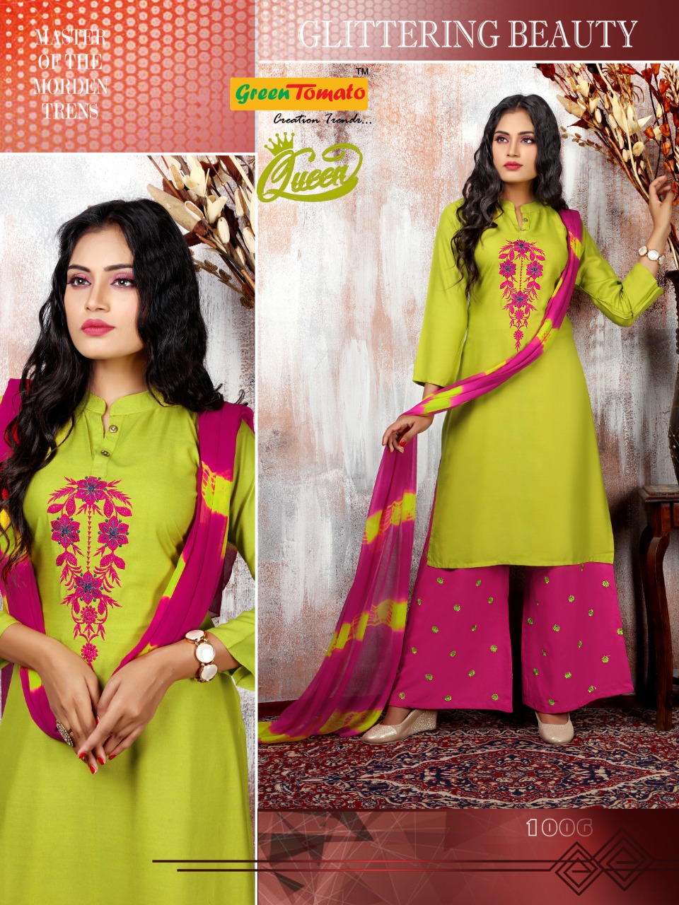 Green Tomato Present Queen Rayon Embroidery Readymade Palazzo Salwar Kameez