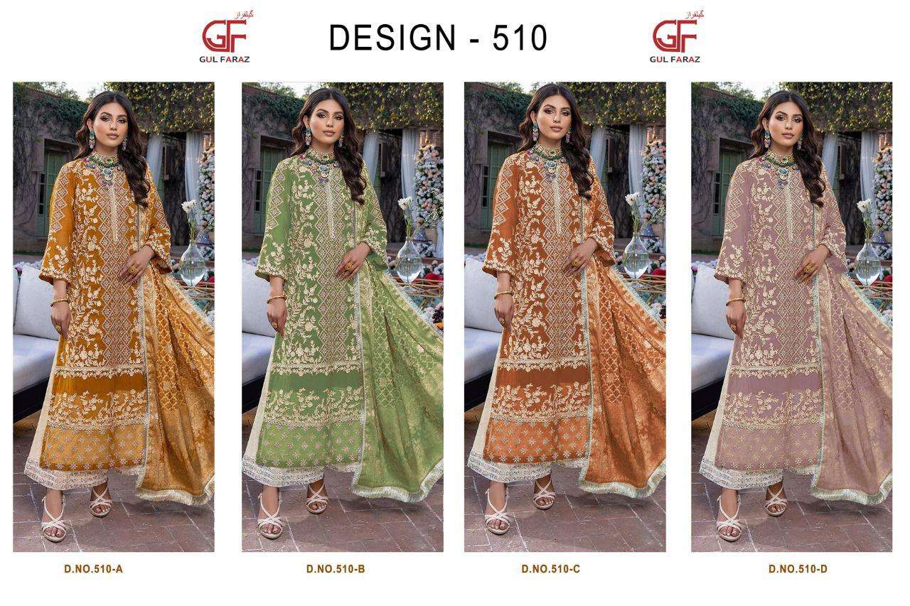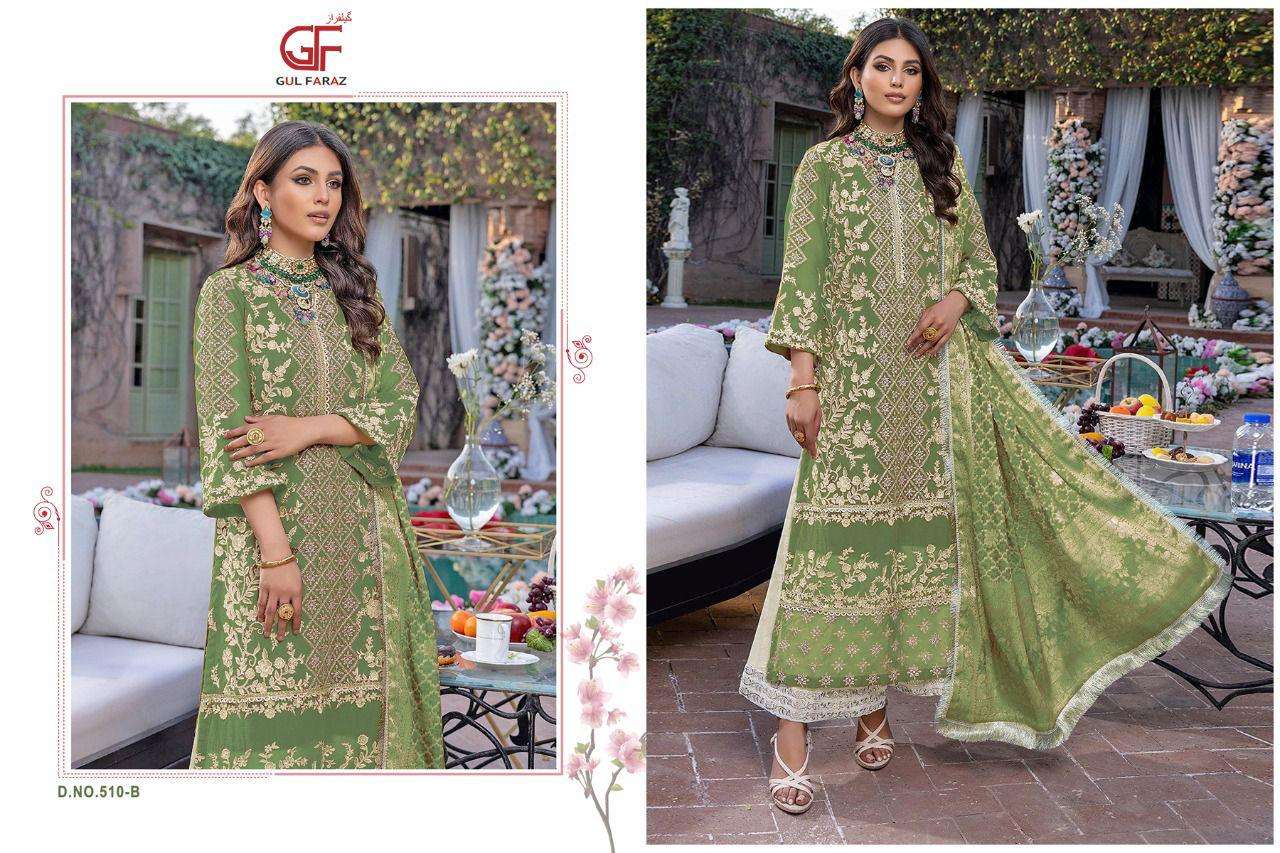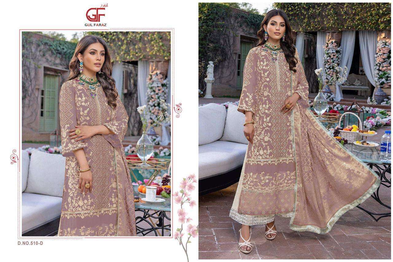 GUL FARAZ BRAND DESIGN NO.-510 DESIGN NO.:- 510 TOP:-FAUX GORGETTE WITH HEAVY EMBROIDERY Special:- JACARD VISCOUS DUPATTA GUL FARAZ SURAT |