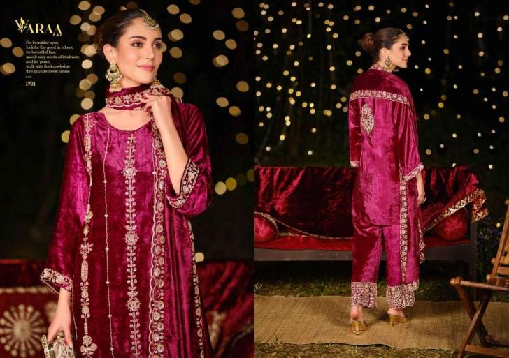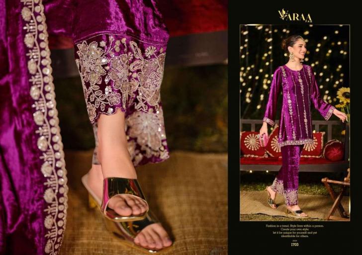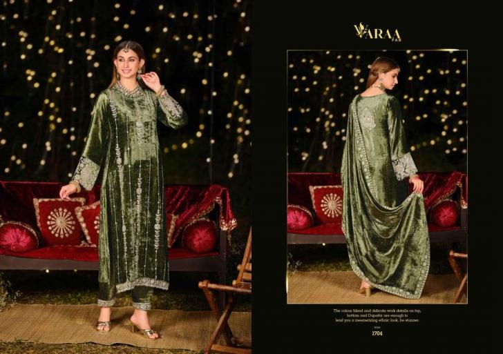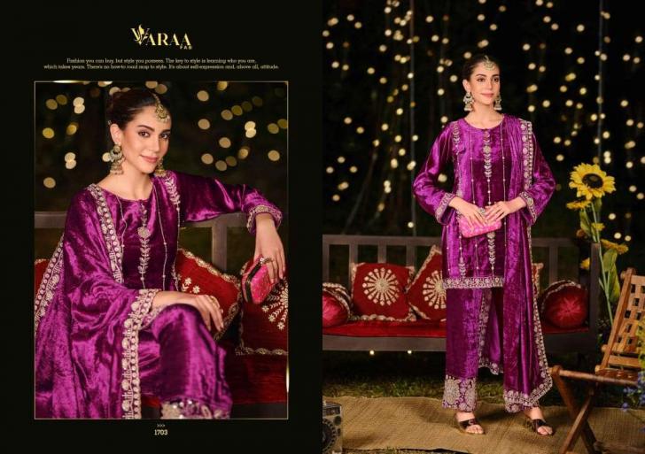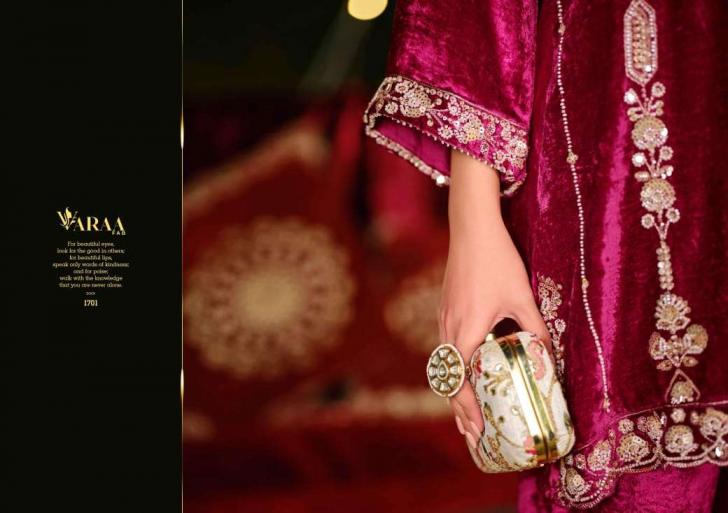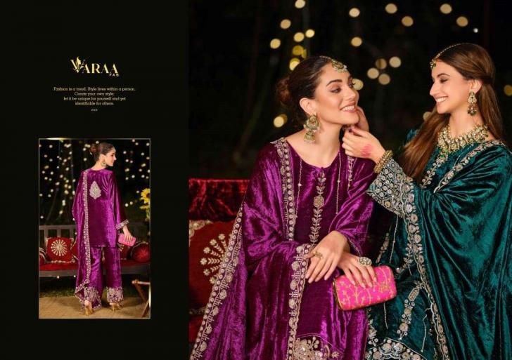 Brand - VARAA FAB GULBANA VOL 1 Top - PURE VISCOSE VELVET WITH DESIGNER HANDMADE EMBROIDERY ON FRONT ,BACK, SLEEVES AND DAAMAN BOTTOM - PURE VISCOSE VELVET WITH HEAVY HAND MADE EMBROIDERY