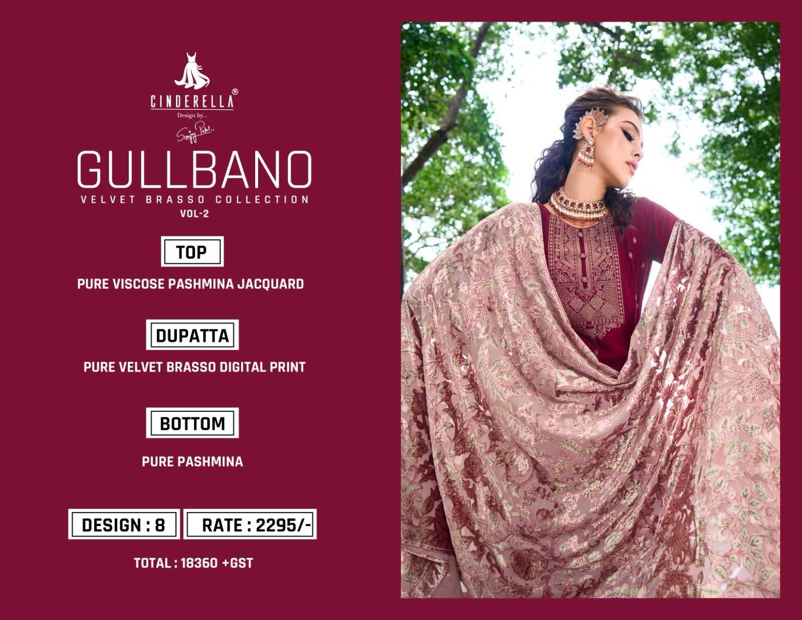 🙏🙏CINDERELLA🙏🙏 NEW SERIES ✌🏻GULLBANO VOL:-2✌🏻 👊Fabric Details👊 *👗Top:-PURE VISCOSE PASHMINA JACQUARD * BOTTOM:PURE PASHMINA 🔻Designs:- 8 PCS. Rate:-2295 Regards |